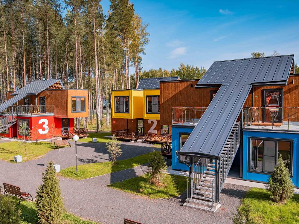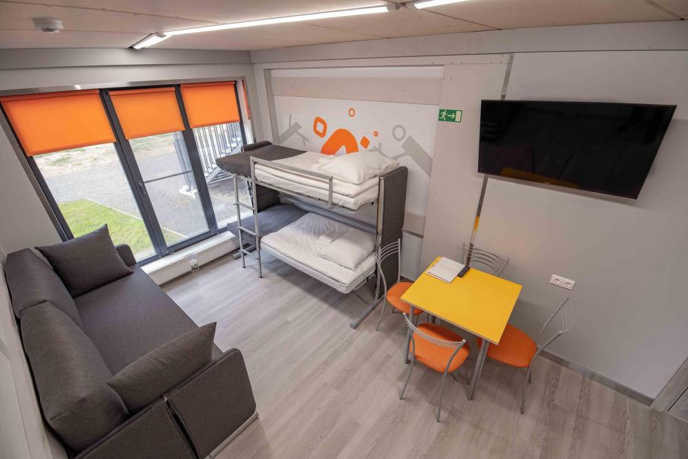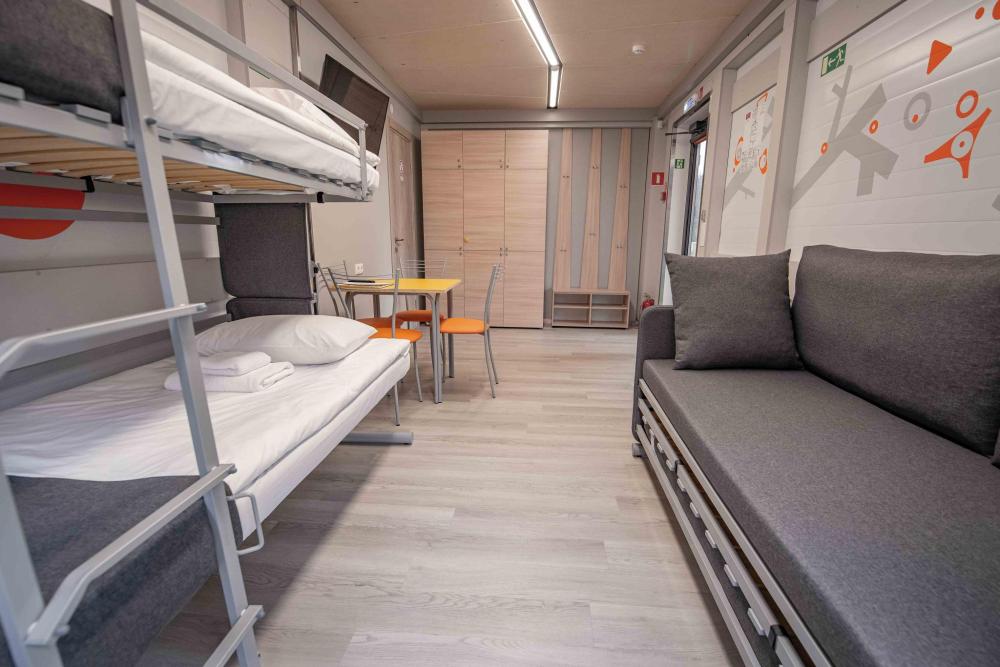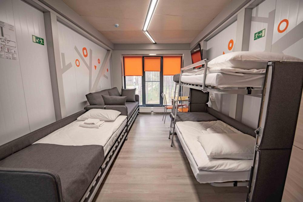 Шестиместный номер в корпусе "Тетрис". Трансформируемый номер, в котором установлено 3 дивана, которые трансформируются в двухъярусные кровати.