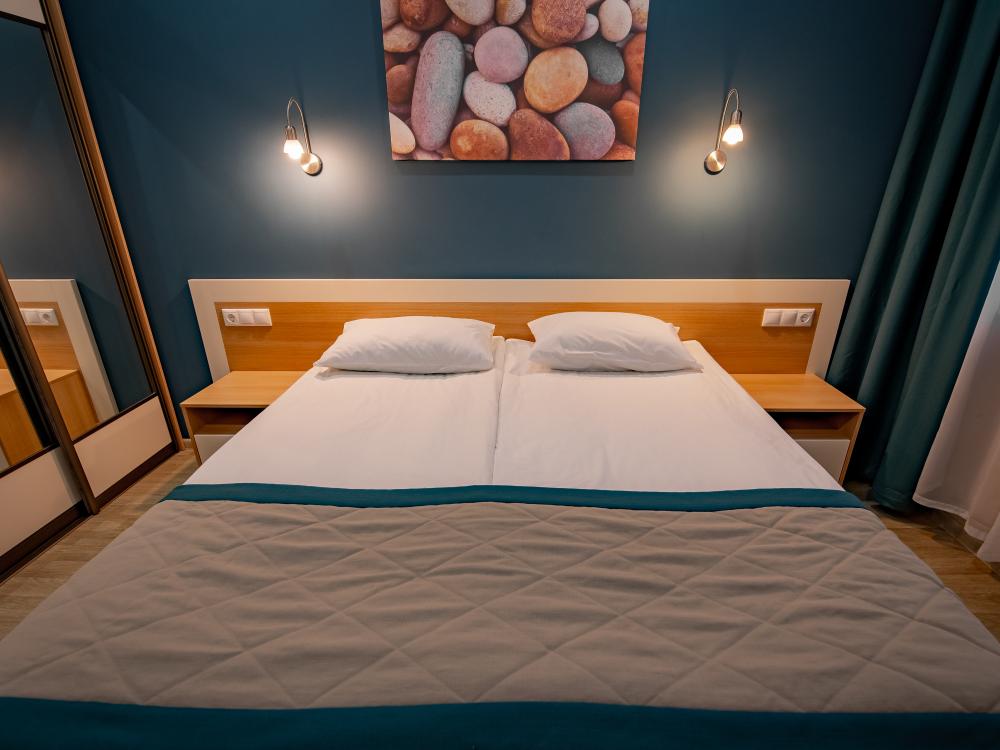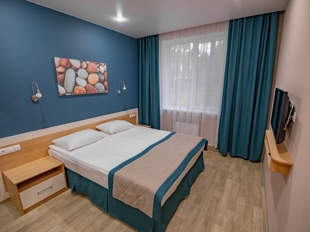 Двухместный номер с большой двухспальной кроватью, душем, туалетом, телевизором и сейфом.