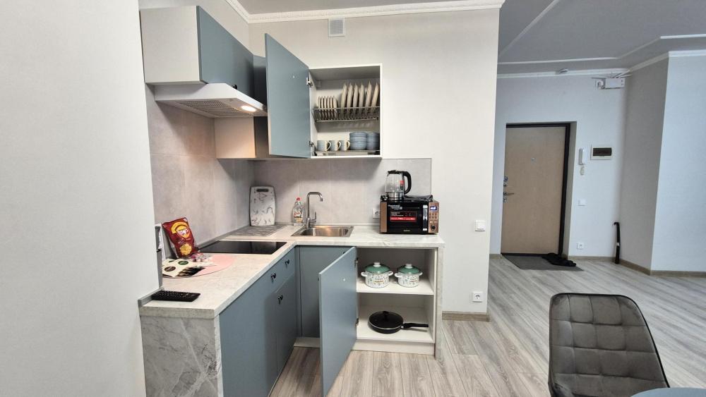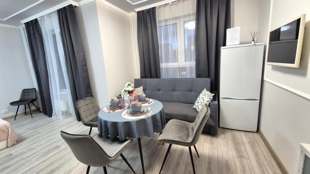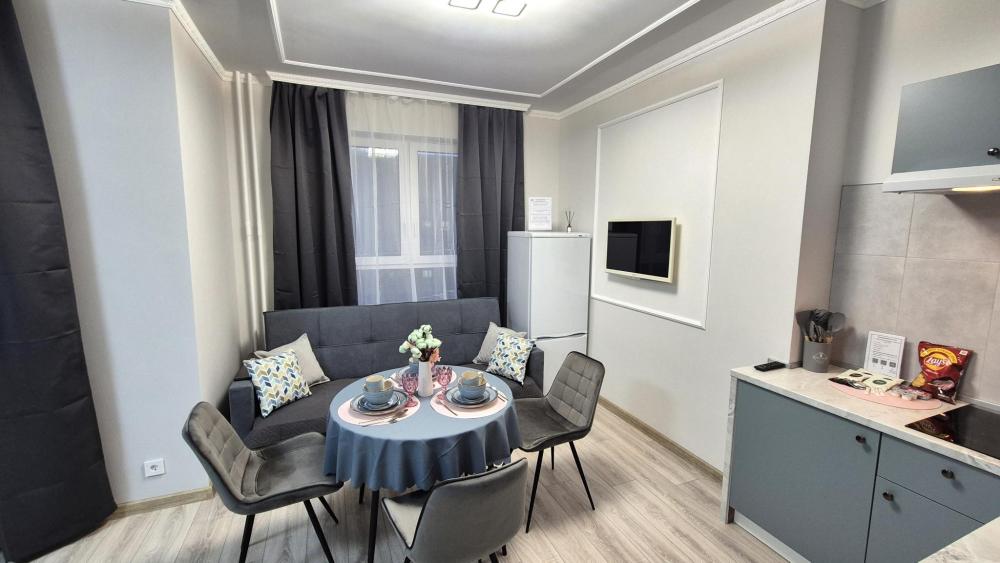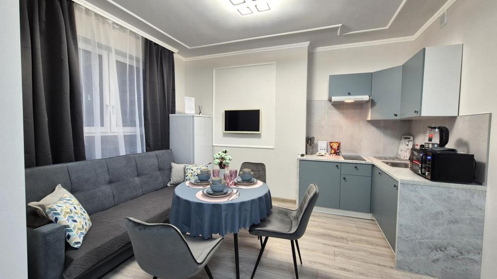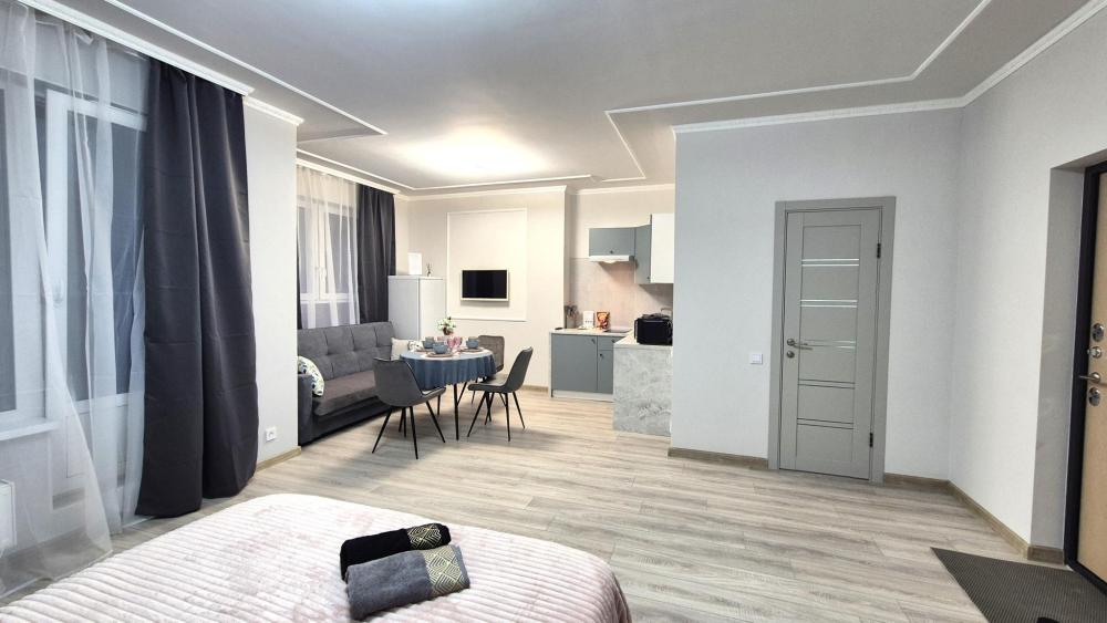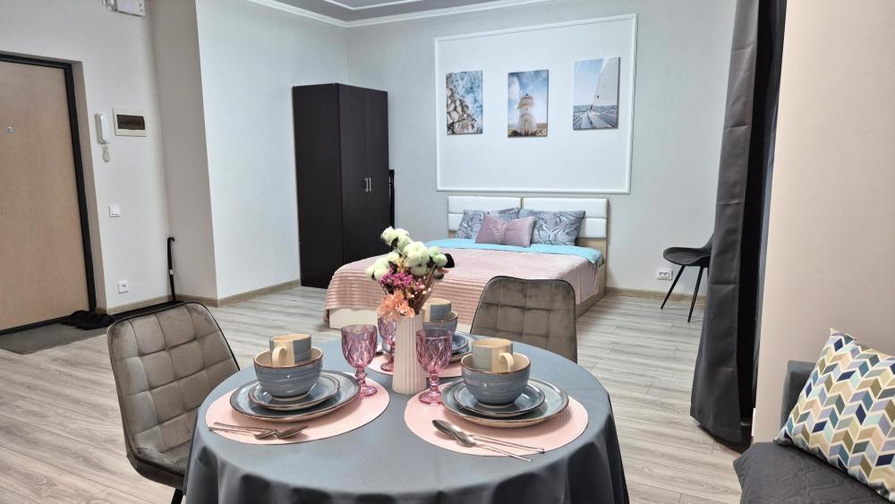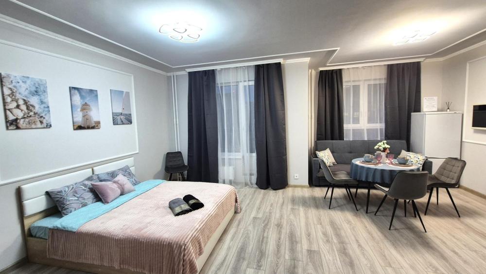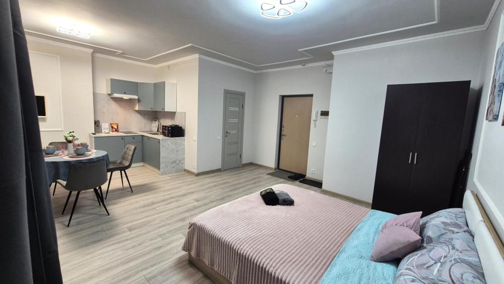 Бронируйте нашу просторную студию со свежим качественным ремонтом в микрорайоне Новое Пушкино с балконом. Большая кухонная зона гостиная, балкон, телевизор Смарт. Два раздельных спальных места. Парковка бесплатная возле дома, места есть. Вся инфраструктура в шаговой доступности: магазины, кафе, рестораны, детские центры, гипермаркет Глобус, Лемана Про, Торговые и развлекательные центры. Тихий зеленый район. Все необходимое для проживания имеется до 4 гостей. Двуспальная кровать, раскладной диван. Работает высокоскоростной Wi-Fi, телевизор. Смарт. В кухонной зоне есть микроволновка, плита, чайник, холодильник, набор необходимой посуды, бокалы для вина, мини бар. Гостям бесплатно предоставляется вода, чай, сахар, сливки, салфетки. В ванной стиральная машина, полотенца, тапочки, туалетные принадлежности, зубные наборы, фен