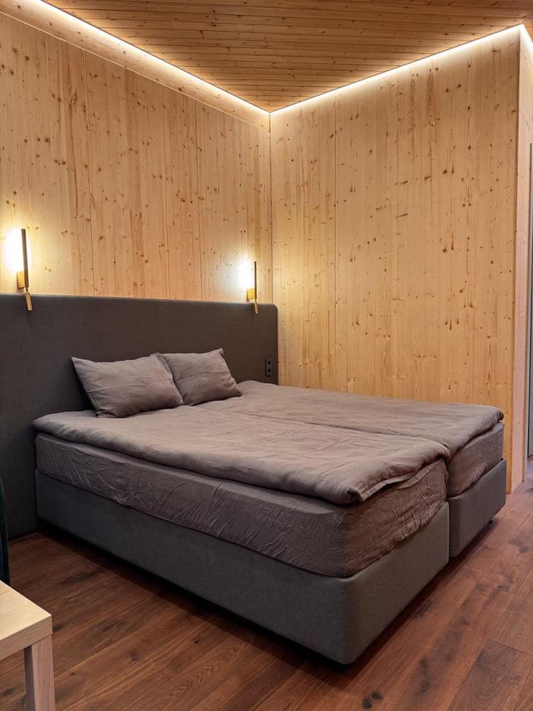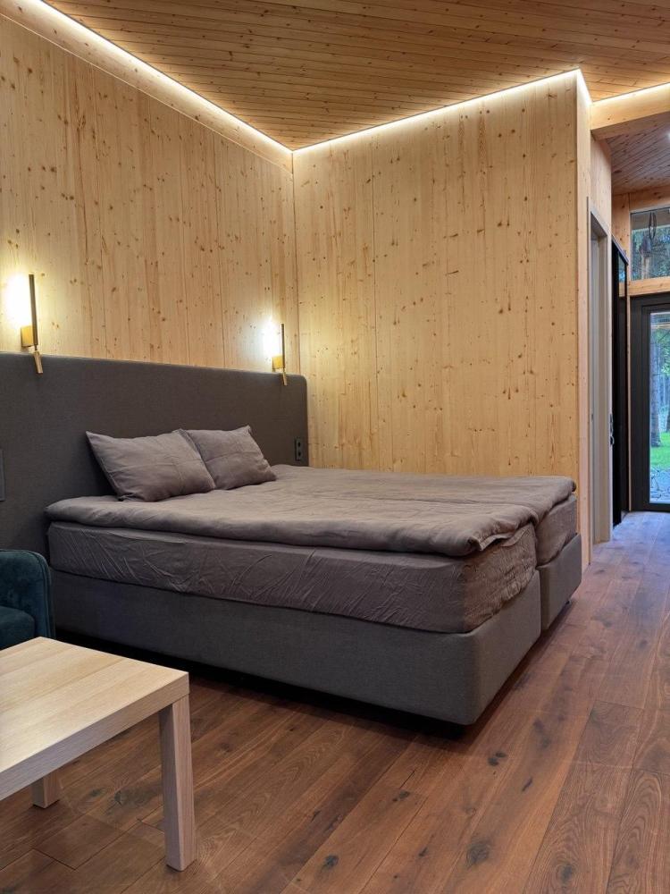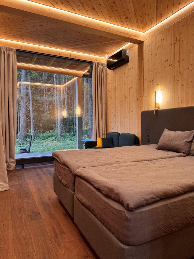 Экомодуль 600. Домик в лесной зоне, который подойдёт для пары или семьи с ребёнком. Есть двуспальная кровать, панорамное окно и небольшая кухня с обеденной зоной.