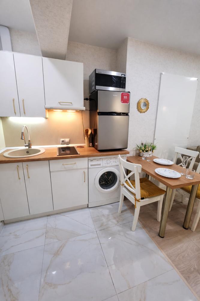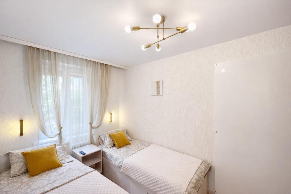 Уютное пространство рассчитано на комфортное размещение четырёх человек. В распоряжении гостей двуспальная кровать (160х200 см), односпальная кровать (80х200 см) и две односпальные кровати (80х190 см) с ортопедическими матрасами. В квартире есть всё необходимое для удобного проживания, включая автономное отопление и тёплые полы.