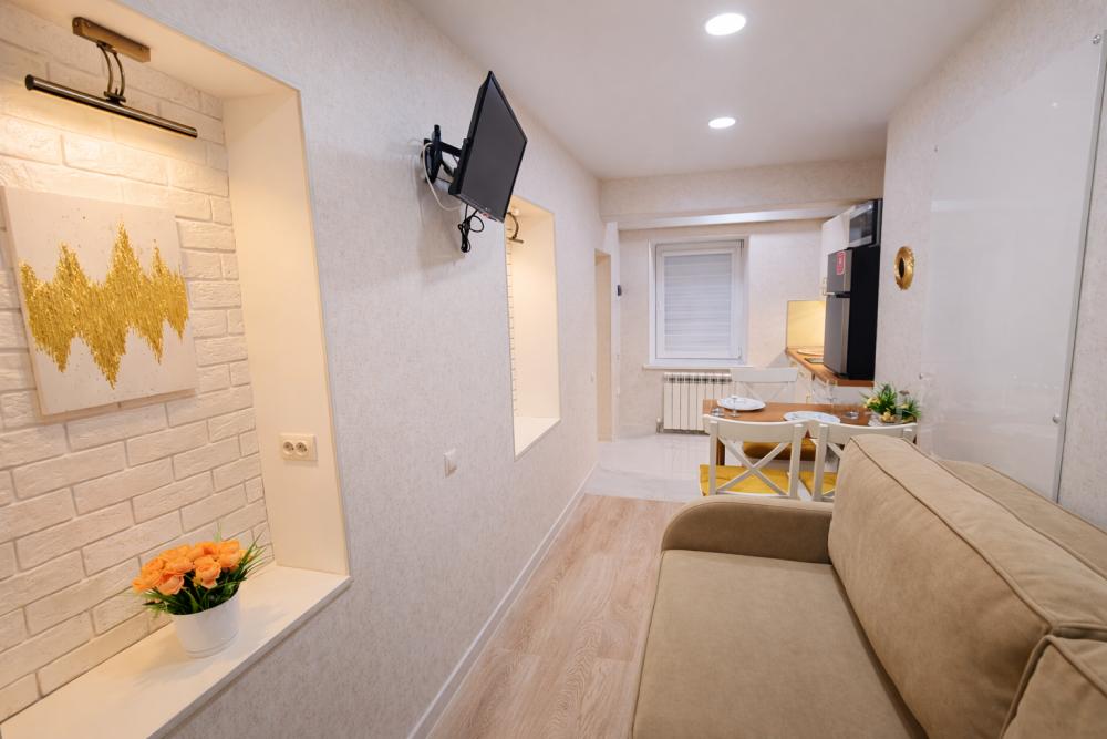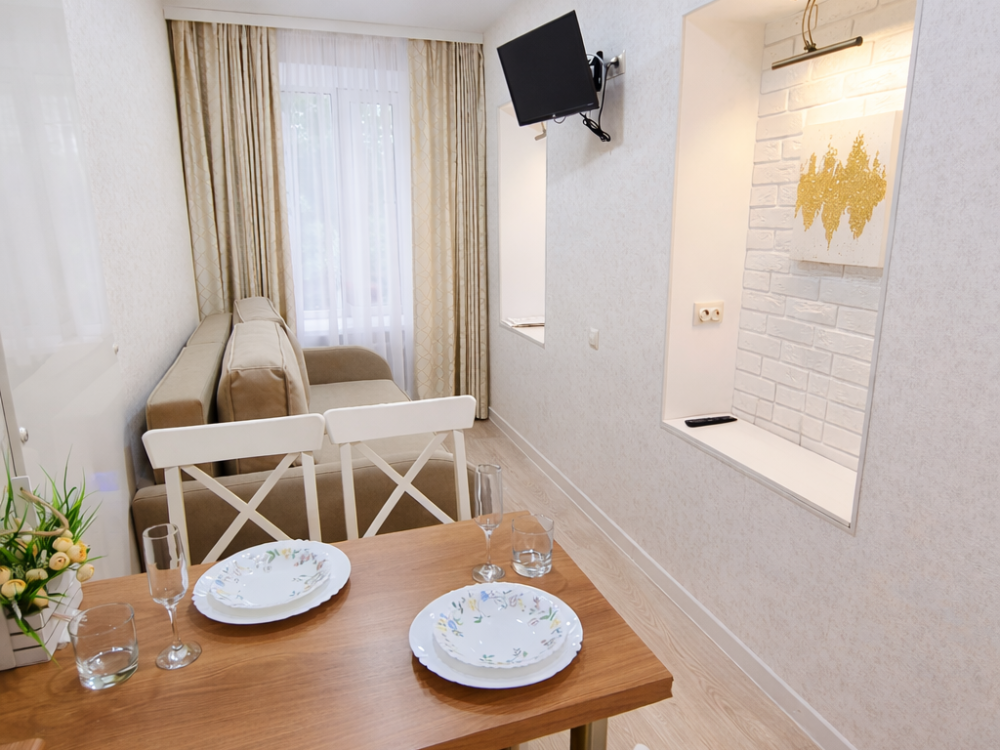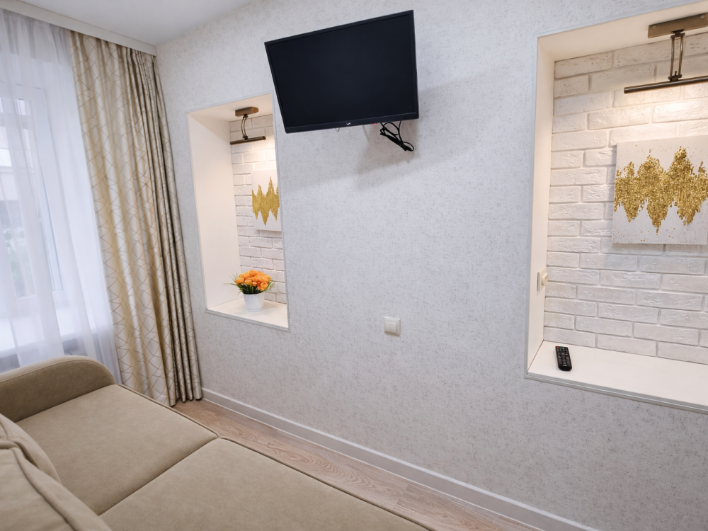 В квартире созданы все условия для комфортного проживания до трех человек. Просторные комнаты оборудованы мебелью, включающей удобные спальные места. Кухня укомплектована всей необходимой бытовой техникой и посудой, что позволяет легко приготовить домашние блюда. Также предоставляется доступ к Wi-Fi и телевизору