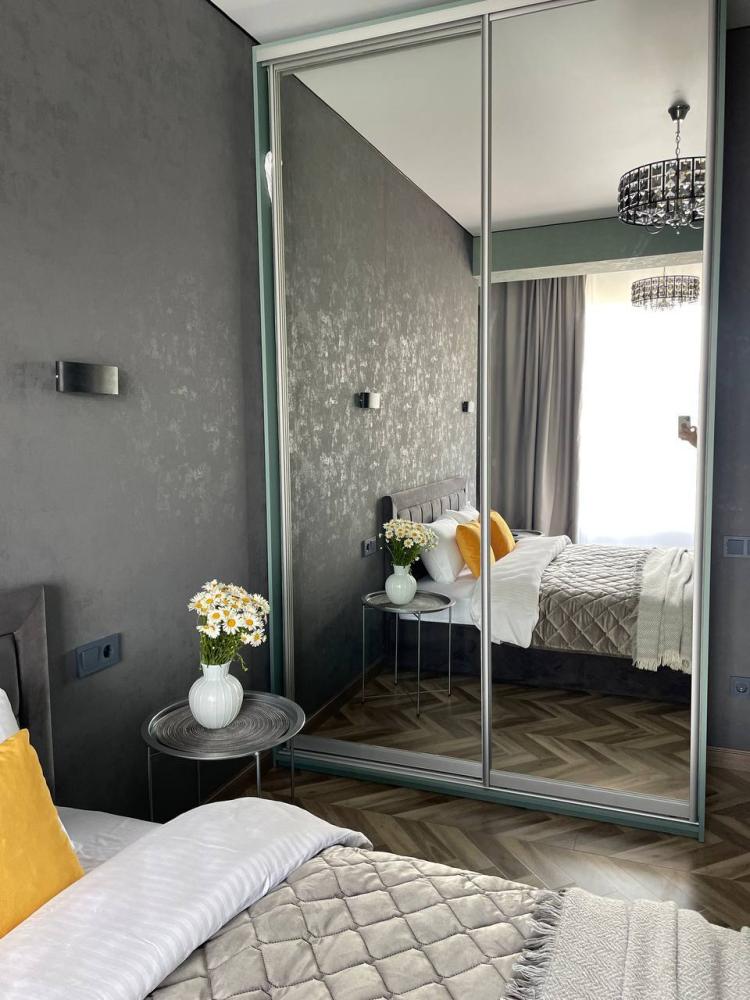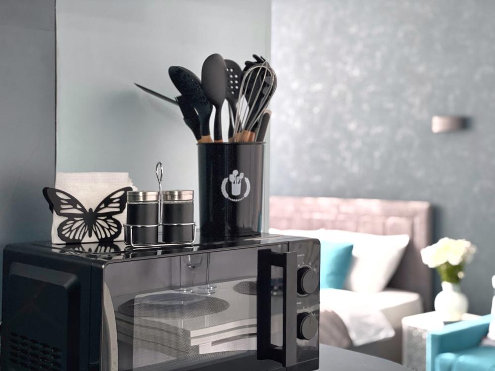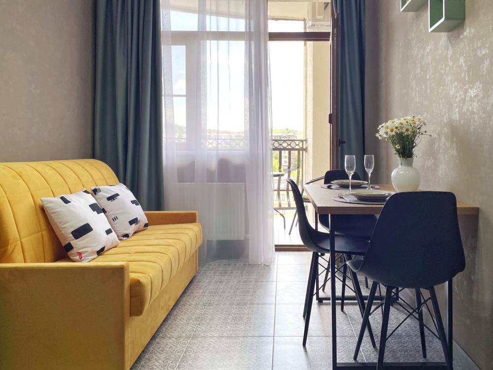 Однокомнатная квартира оборудована всем необходимым для комфортного отдыха, продуманы все детали. Посуда, стиральная машинка, кондиционер, телевизор, утюг, гладильная доска, фен, микроволновая печь и другие мелочи создают уют и удобство. Для удовольствия установлена качель-кокон у панорамного окна, с которой можно любоваться красивыми видами, покачиваясь и расслабляясь.