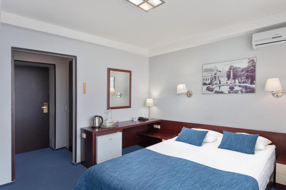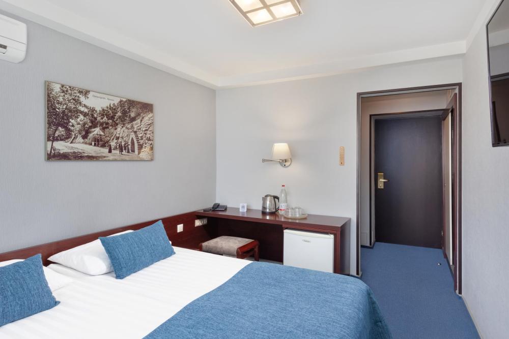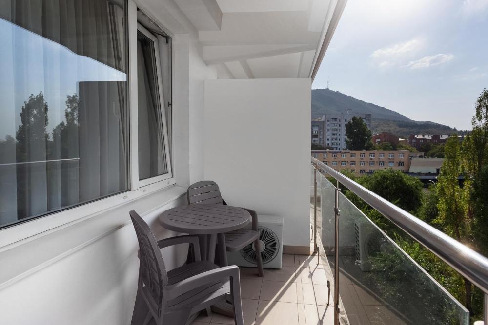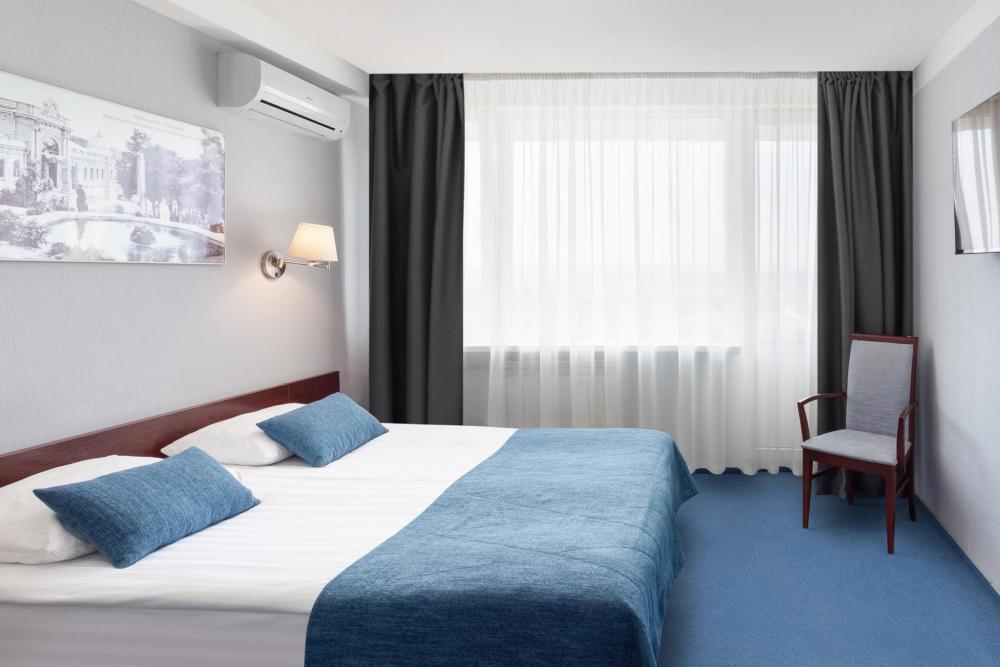 Двухместный однокомнатный номер с балконом, площадью 18 кв. м. В номере: кондиционер, одна двуспальнаякровать, письменный стол, стул, банкетка, ЖК-телевизор, телефон, мини-бар, фен, гидромассажная душевая кабина, набор туалетных принадлежностей.