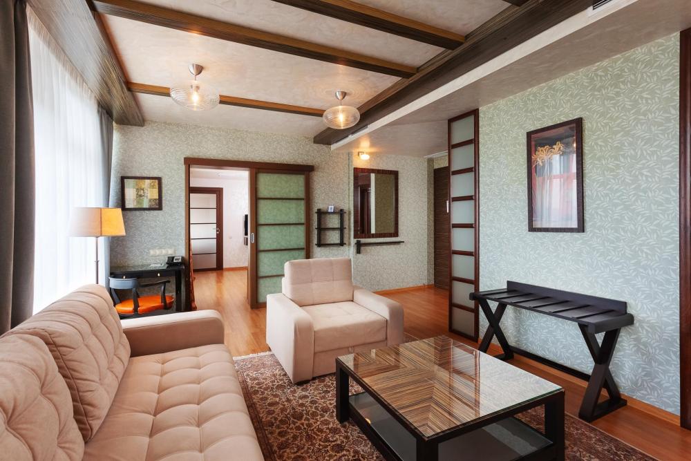Самый роскошный номер отеля площадью 145 кв. м. Расположен на 8 этаже отеля. Функциональное пространство номера поделено на несколько зон для отдыха, работы и приема гостей - это холл, рабочий кабинет, обеденный зал, чайная комната, зона бара, спальня, ванная комната, гардеробная и два санузла. К услугам гостей отеля, проживающих на 8 этаже, предоставляется конференц-зал со всей необходимой техникой и Wi-Fi интернетом.