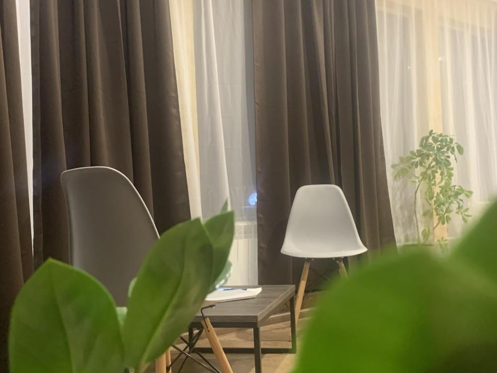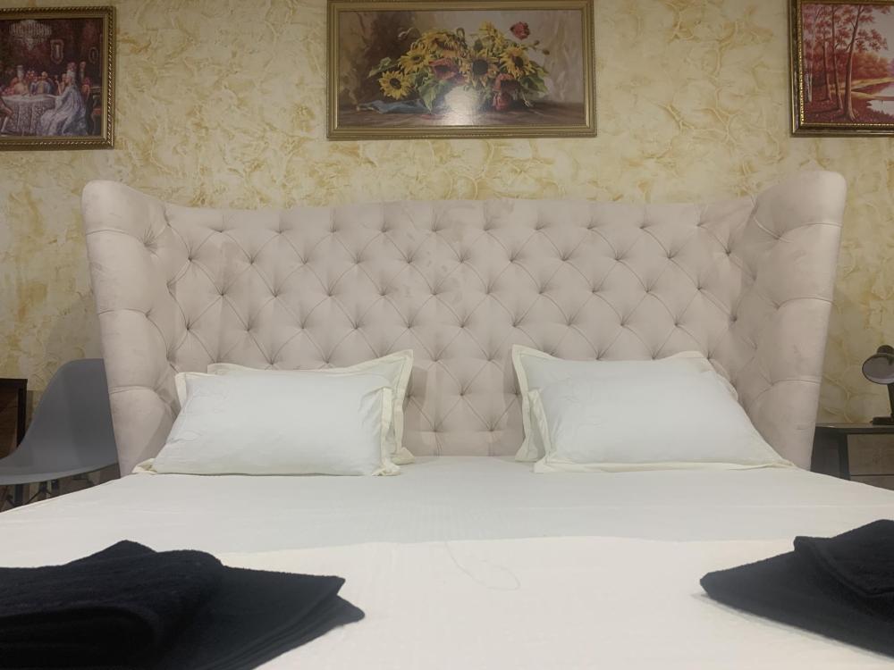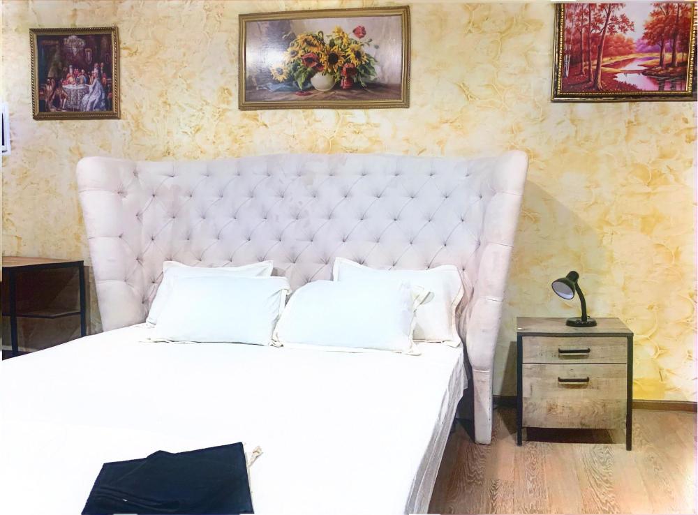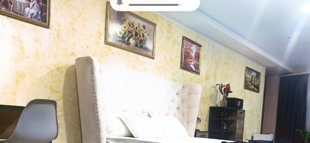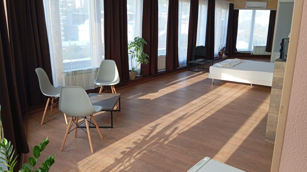 Большой номер-"Studio Delux" с большой двуспальной кроватью "King Saiz". К услугам гостей: телевизор с плоским экраном,холодильник,стол письменный,шкаф для одежды,вешалка для верхней одежды,прикроватные столики,стулья,фен, электрочайник,посуда,чайный набор: чай,кофе. Гостям открывается вид из окна на город и Кавказские горы. В номере есть постельные принадлежности,полотенца, тапочки,набор косметики для личной гигиены и др. Доступен бесплатный интернет.