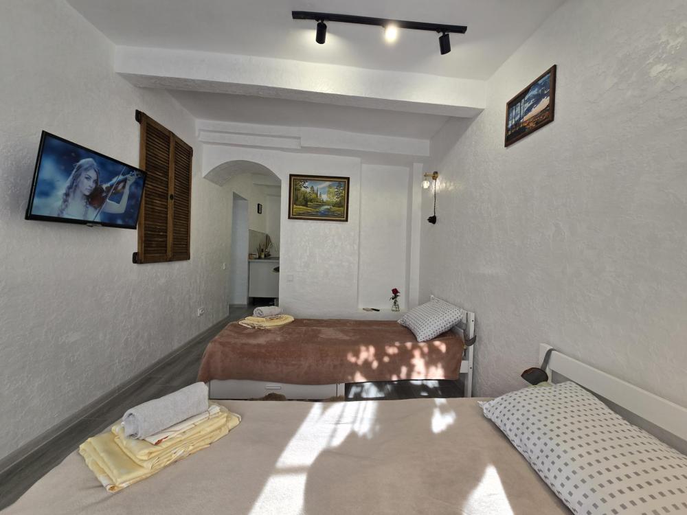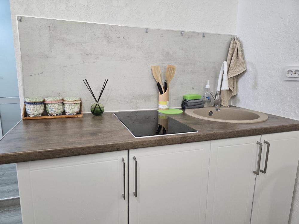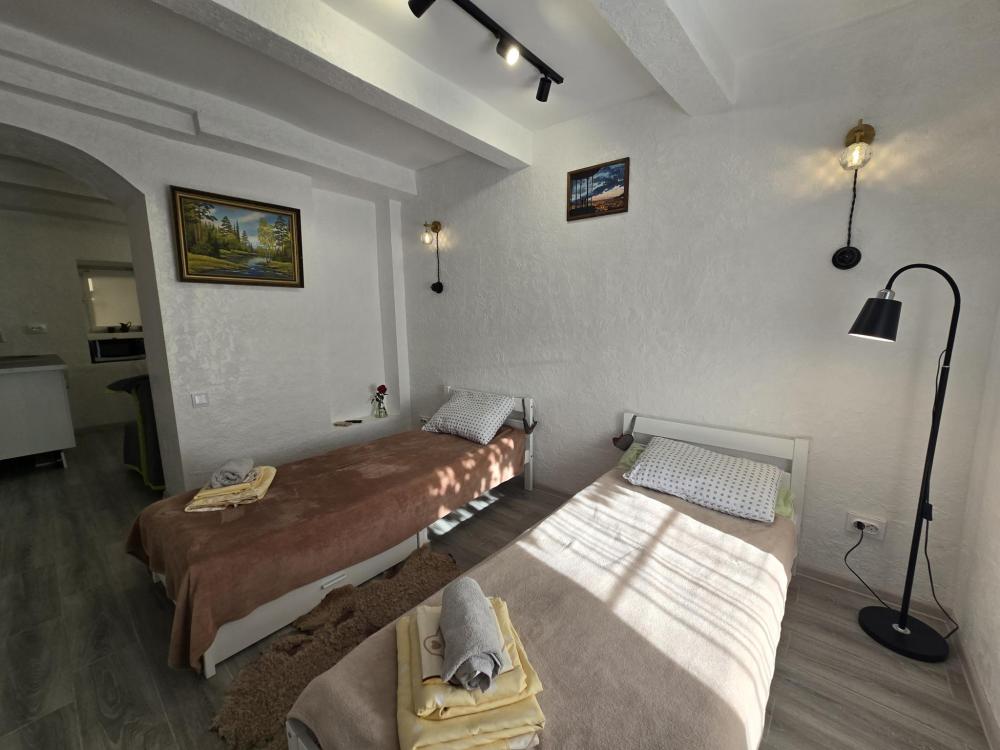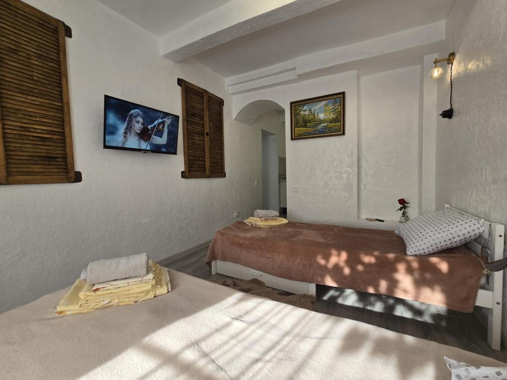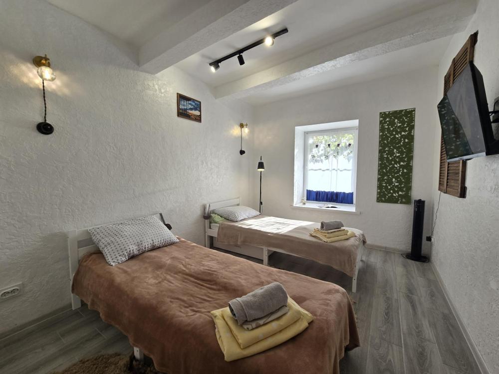 Smart TV с доступом в интернет. Две удобные раздельные кровати. Полностью оборудованная кухня: холодильник, варочная панель, вся необходимая посуда и техника. Компактный и чистый санузел: душевая кабина, раковина, туалет. Главный бонус — индивидуальное отопление. Для третьего гостя или ребенка есть дополнительное раскладное кресло-кровать. Бесплатный Wi-Fi.