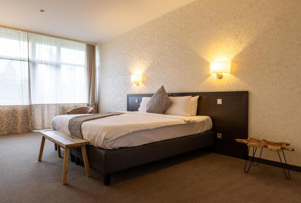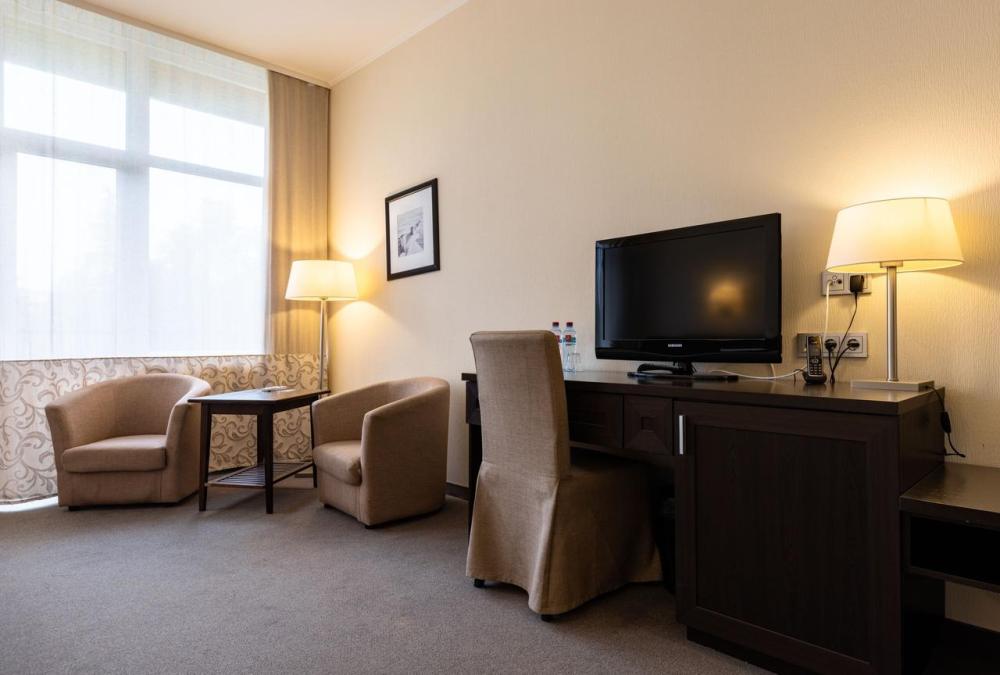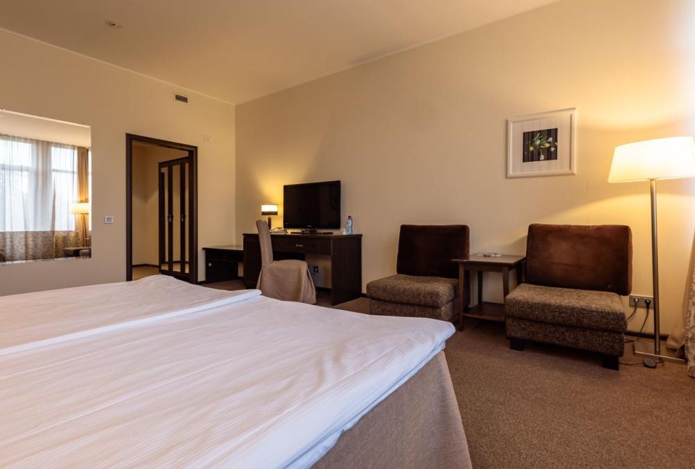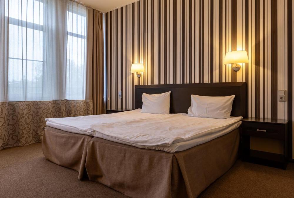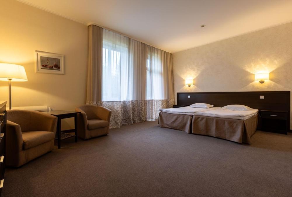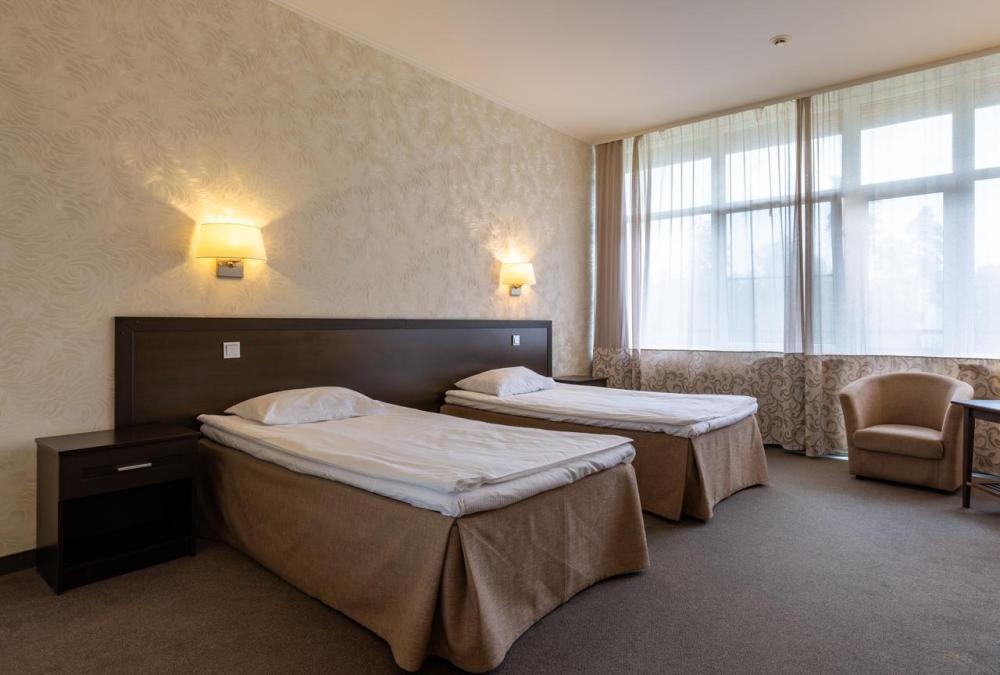 Наслаждайтесь прекрасными видами природы, которые открываются с балкона уютного номера Стандарт. В номере две раздельные кровати c ортопедическими матрасами, которые легко объединяются в одну большую. Письменный стол с хорошим освещением и удобное кресло образуют удобную зону для работы или учёбы. Требуется предварительная запись у администратора спа-центра для посещения бассейна и термальной зоны.