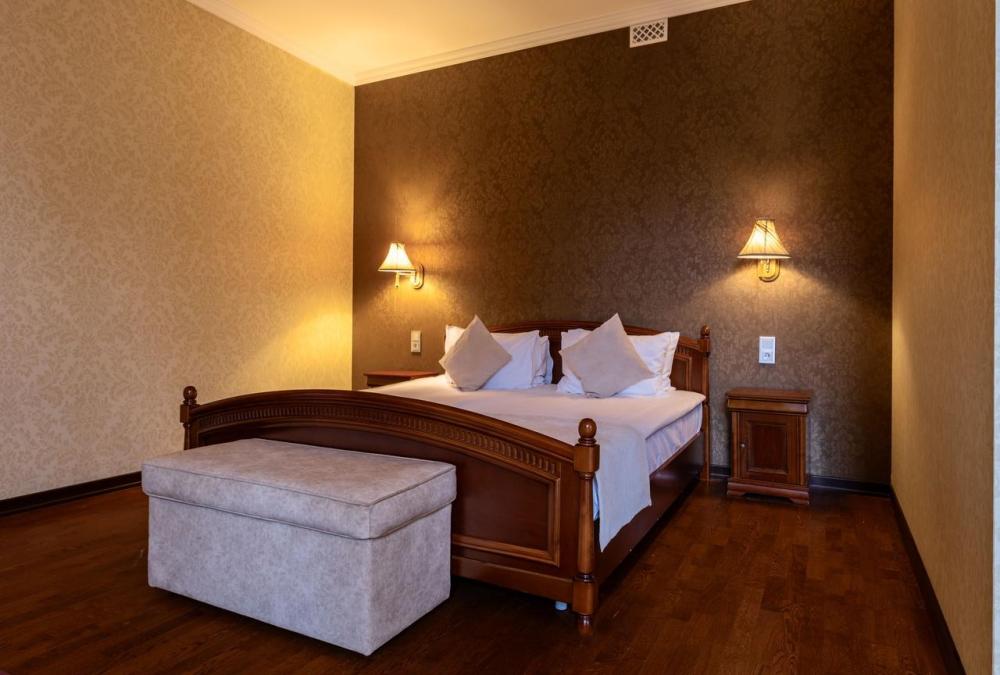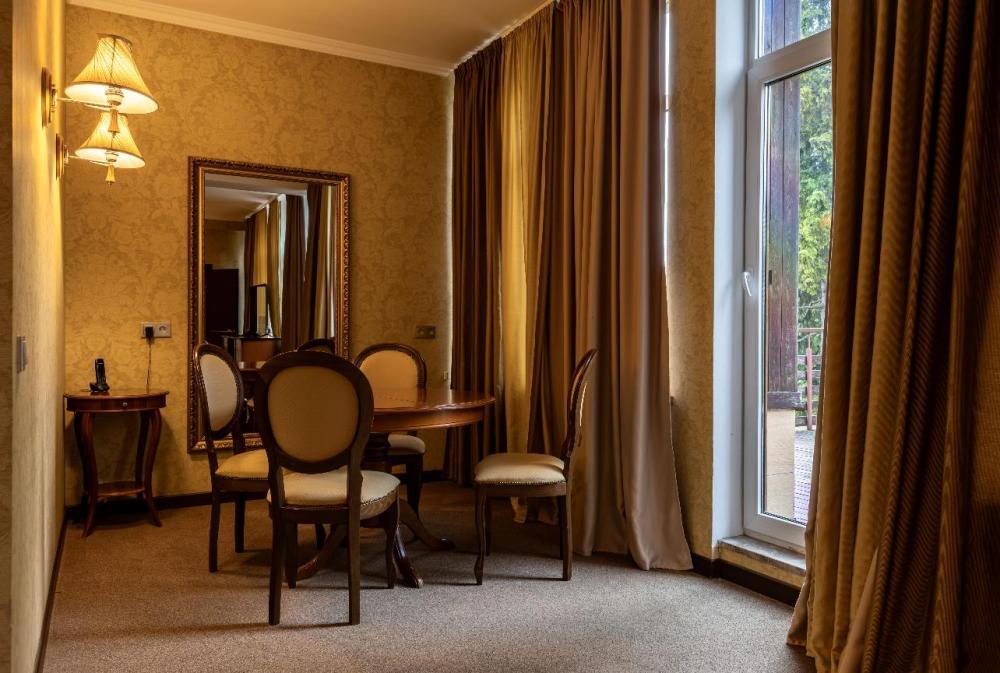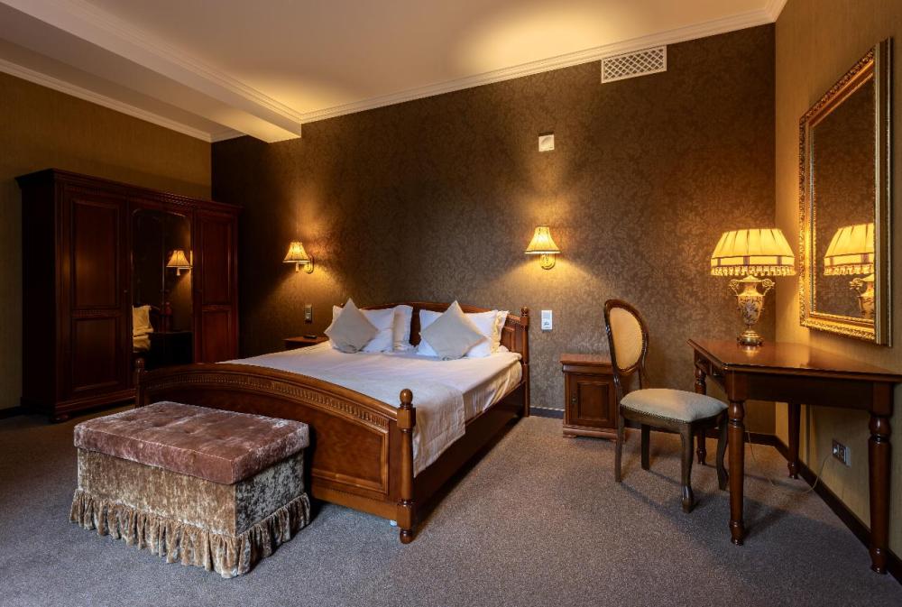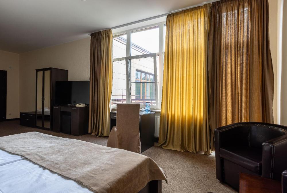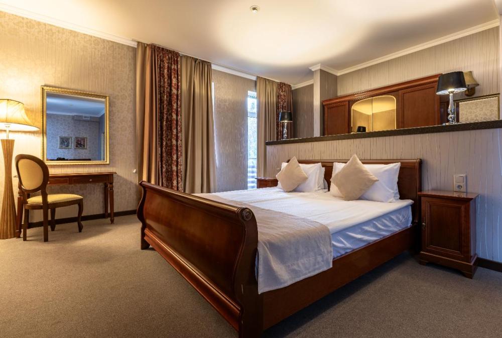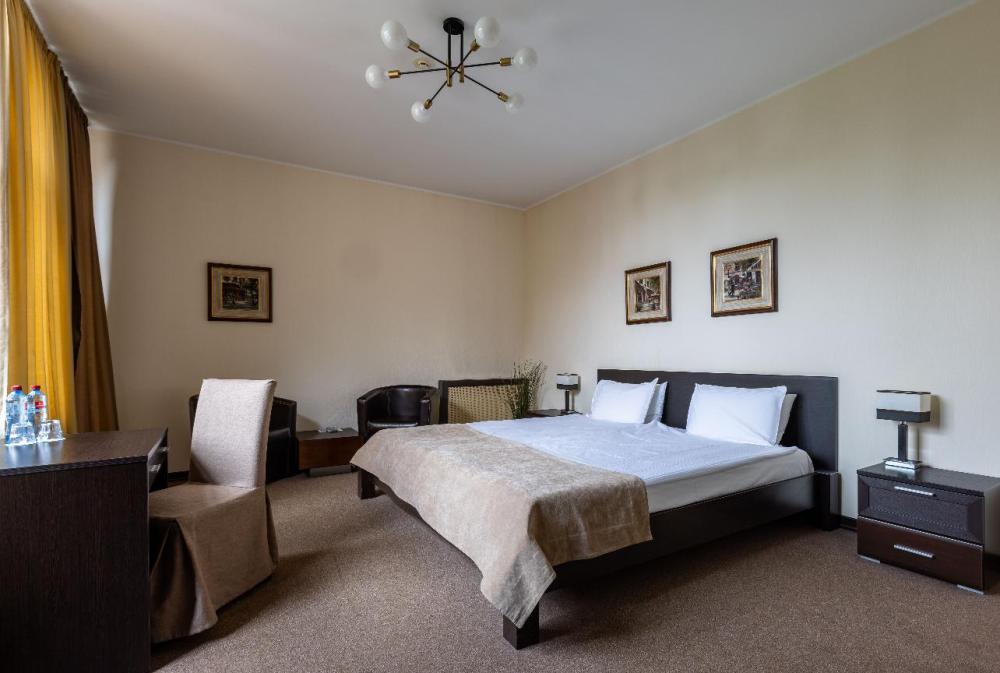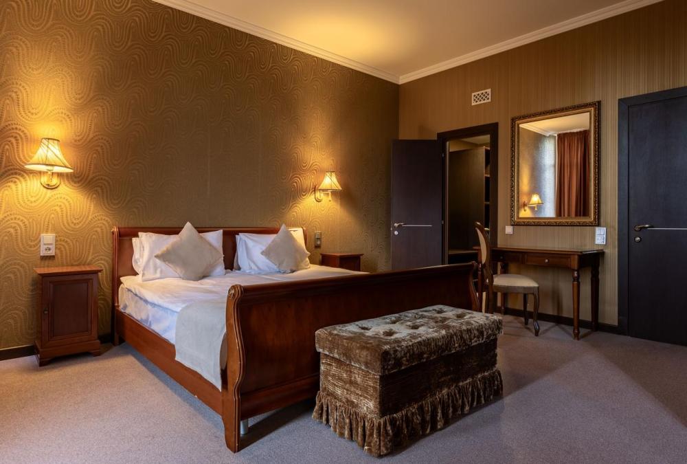 Отдохните от городской суеты, наслаждаясь красотой природы и свежим воздухом на собственной меблированной террасе просторного номера Элеганс. Большая двуспальная кровать king-size с ортопедическим матрасом подарит вам безмятежный сон, удобный письменный стол позволит уделить время делам, а мягкое кресло с журнальным столиком – приятно провести время с книгой и чашечкой кофе. Посещение бассейна, хаммама, финской сауны входит в стоимость.