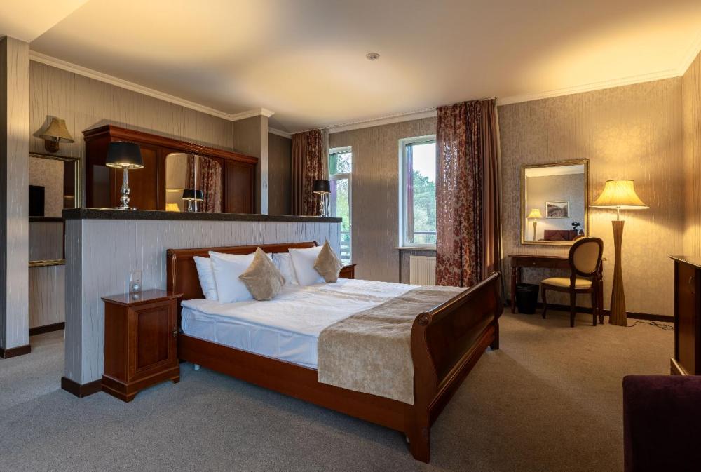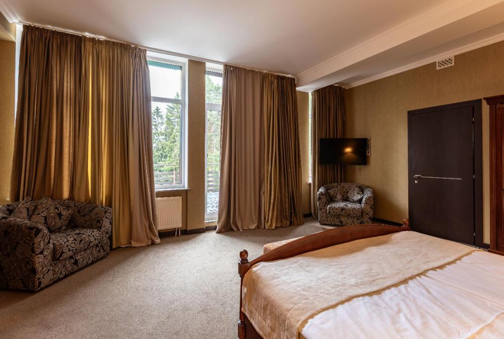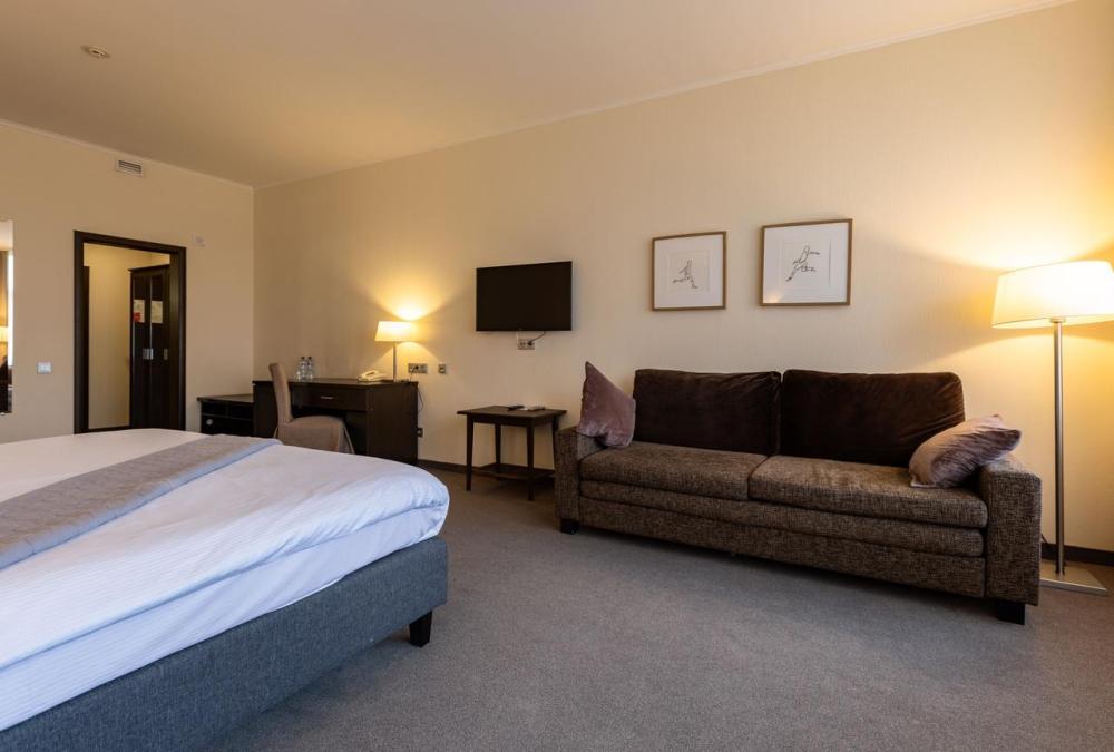 Выбирайте просторный номер Супериор для отдыха всей семьёй в одном из красивейших мест Ленинградской области. Каждое утро вы сможете любоваться великолепной природой с собственного балкона. Большая двуспальная кровать с ортопедическим матрасом гарантирует здоровый сон, удобный раскладной диван или кресло послужит дополнительным спальным местом. Посещение бассейна, хаммама, финской сауны входит в стоимость.