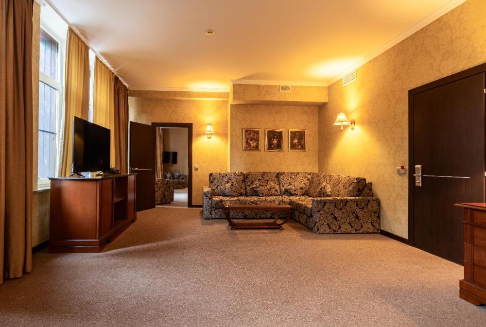 Отличное решение для комфортного проживания всей семьёй – просторный Семейный Люкс двумя изолированными комнатами и террасой, где в летний период выставляется плетёная мебель для отдыха на свежем воздухе. В спальне – большая кровать с ортопедическим матрасом, в гостиной – элегантная мягкая мебель и обеденная зона с большим столом на несколько персон. В номере два санузла – с душевой кабиной и с ванной. Посещение бассейна, хаммама, финской сауны входит в стоимость.