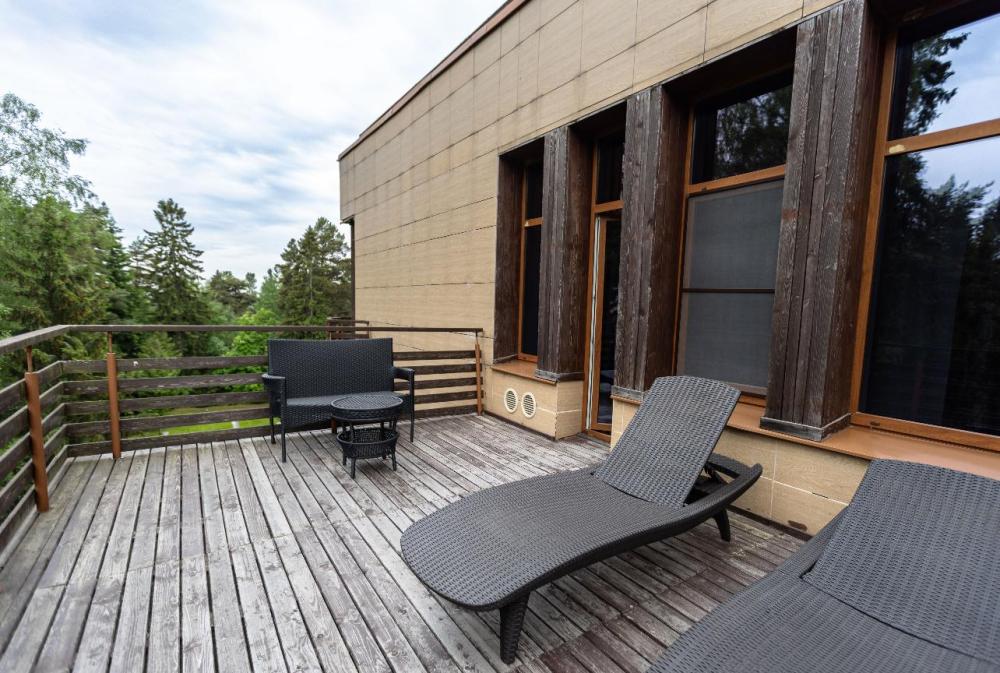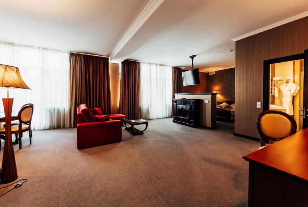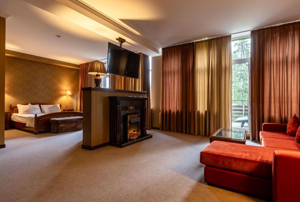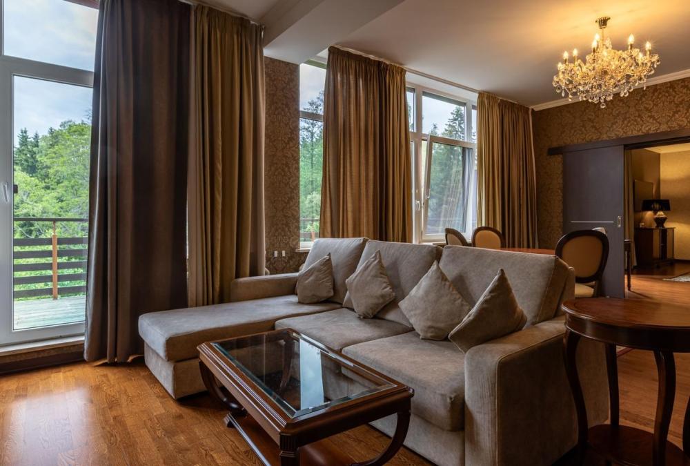 Погрузитесь в атмосферу безмятежного отдыха в 2-комнатном номере Делюкс с выходом на собственную террасу, где в летний период выставляются шезлонги, кресла и столик для приятного времяпрепровождения на свежем воздухе. В номере большая кровать king-size с ортопедическим матрасом, удобная мягкая мебель, письменный и журнальный столики для организации рабочей зоны и даже электрический камин, придающий особый шарм загородному отдыху. Посещение бассейна, хаммама, финской сауны входит в стоимость.