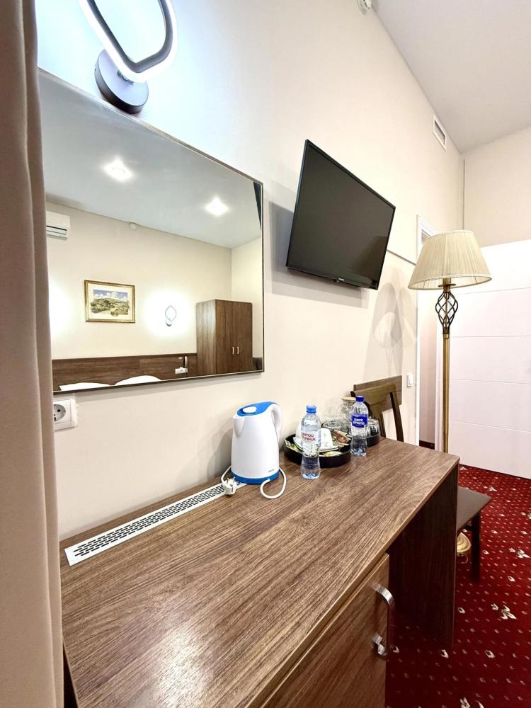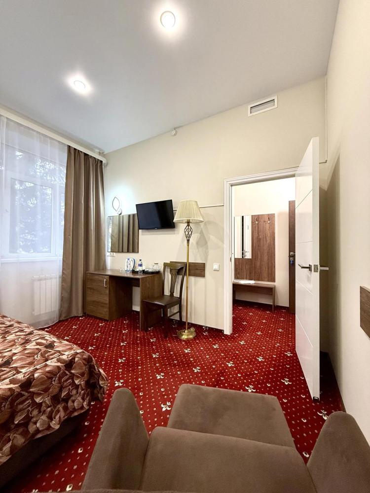 Двухкомнатный номер, площадью 33м², сочетает в себе современный стиль и комфорт. В номере люкс: Двуспальная кровать King-Size, Спутниковое ТВ, Мини-холодильник, Стол, Гардероб, Кондиционер, Бесплатный WI-FI, Чайник, Диван-кровать, Ванна, Тапочки, Халаты, Туалет, Набор полотенец, Фен.