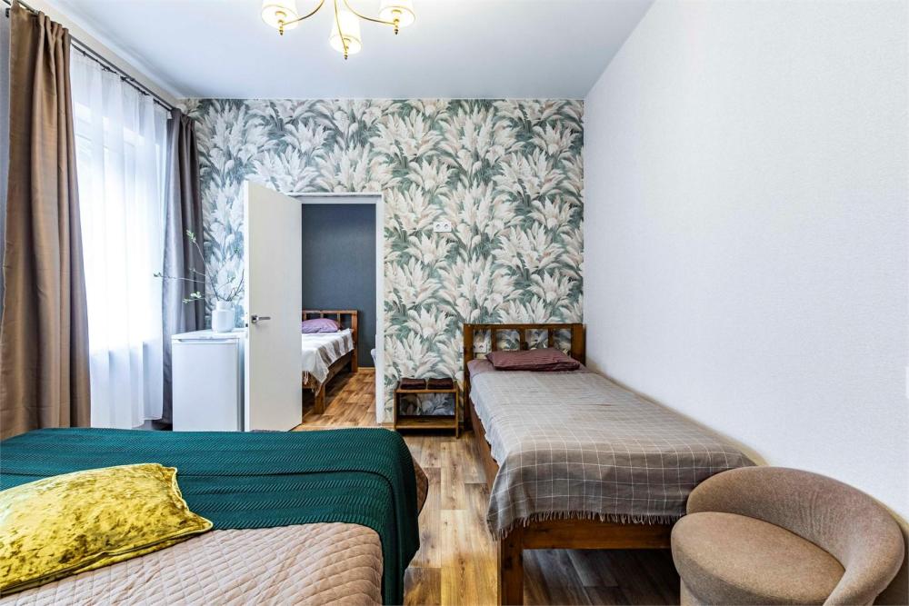 Просторный номер идеально подойдёт для семейного отдыха или поездки с друзьями. В номере имеется все необходимое для комфортного проживания: двуспальная и две односпальные кровати, холодильник, санузел с душем. Гостям предоставляется постельное белье и полотенца.