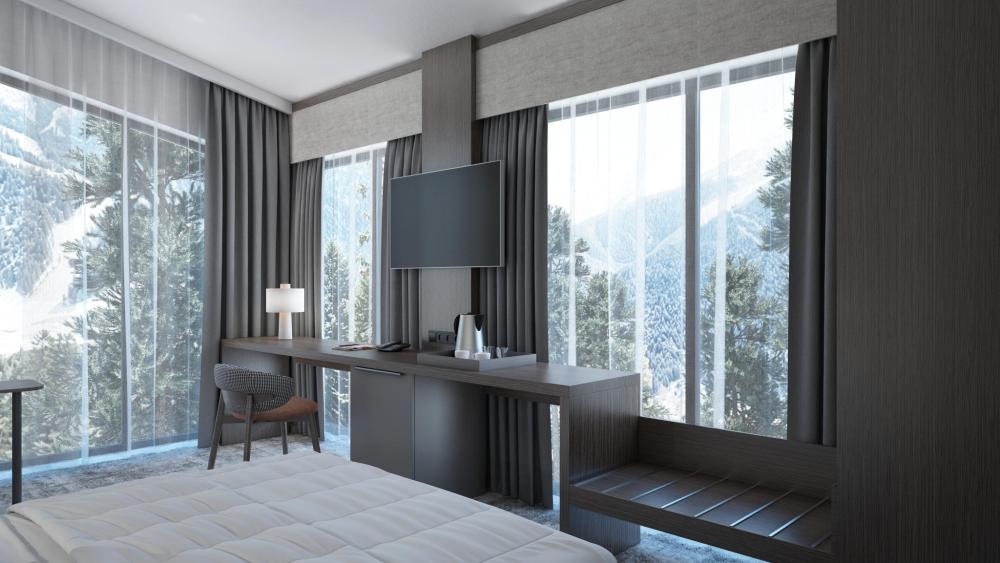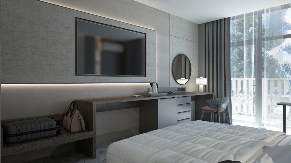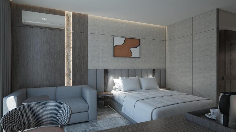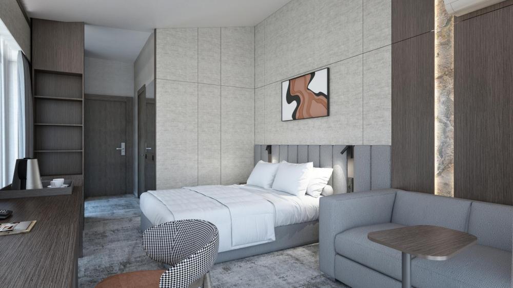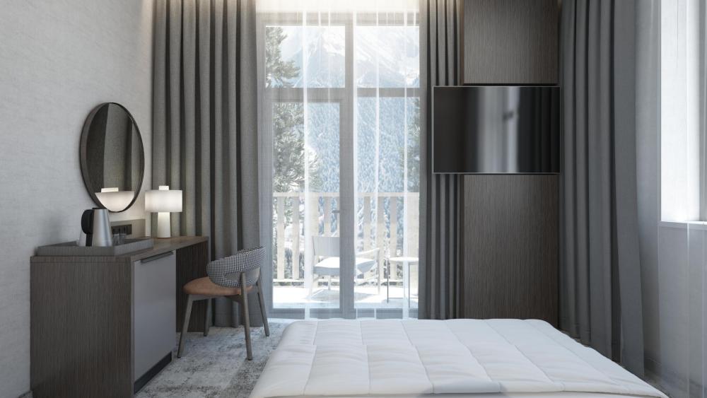 Однокомнатный номер с двуспальной кроватью и раскладным креслом подходит для размещения до трех гостей.