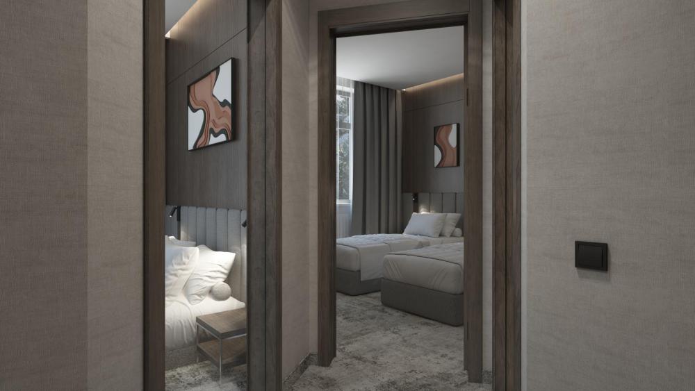 Двухкомнатный номер с двуспальной кроватью в одной комнате и раскладным диваном в другой позволяет разместить до четырех человек.