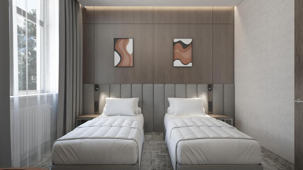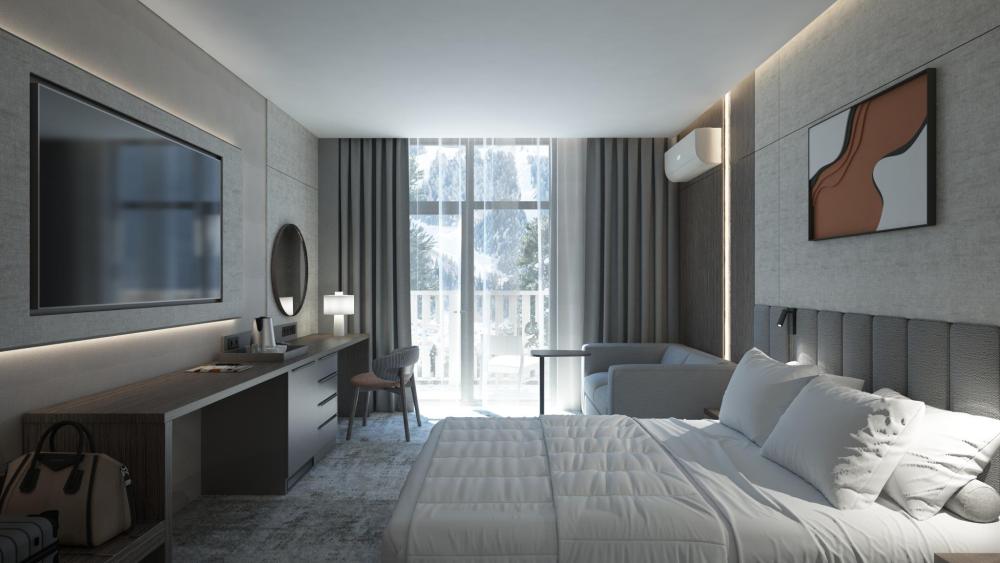 Однокомнатный номер с двуспальной кроватью подходит для одноместного или двухместного размещения.