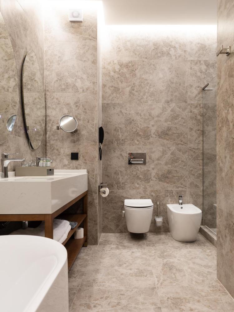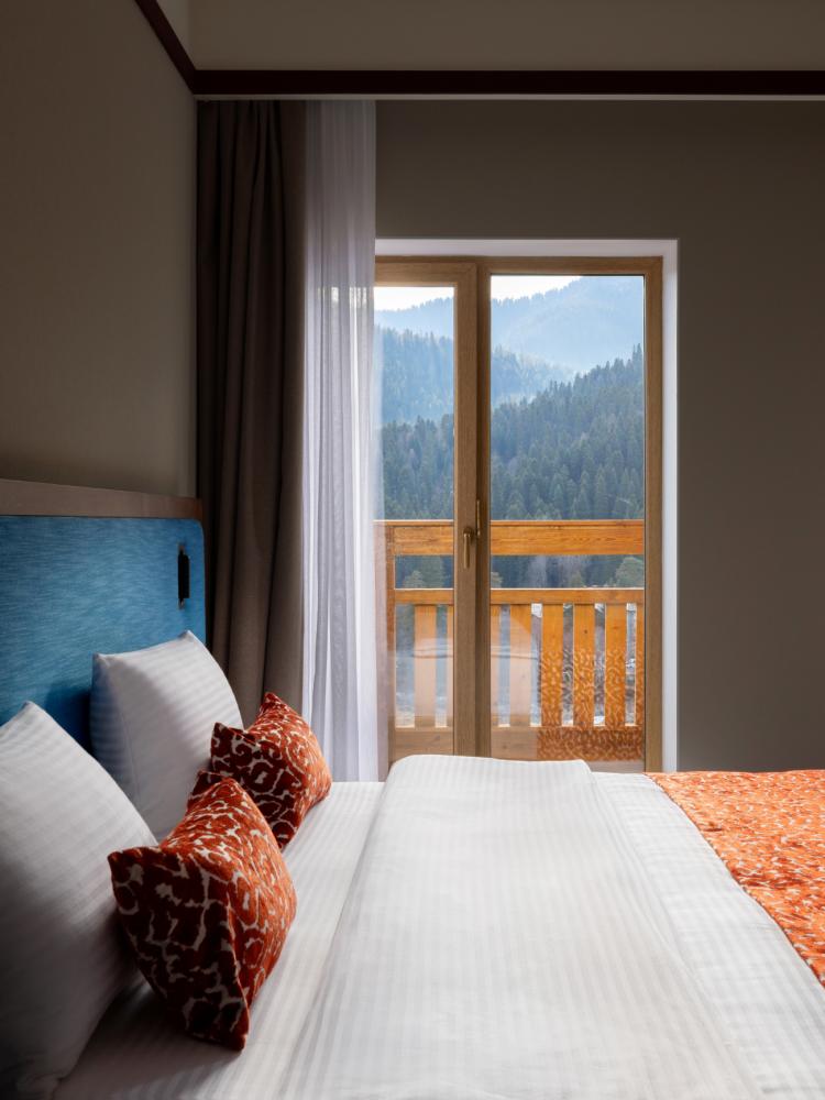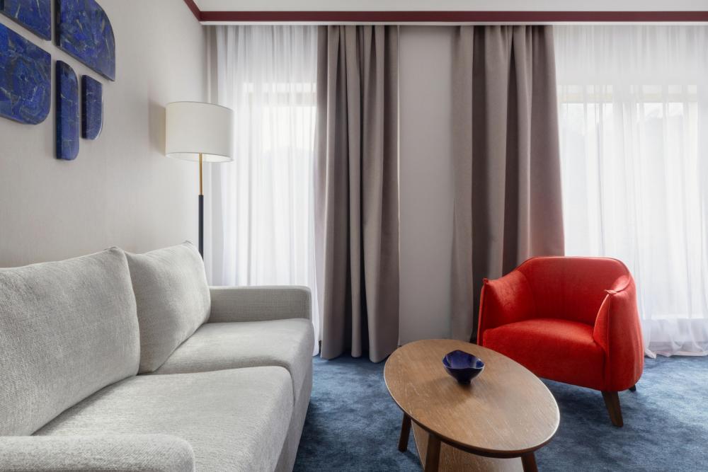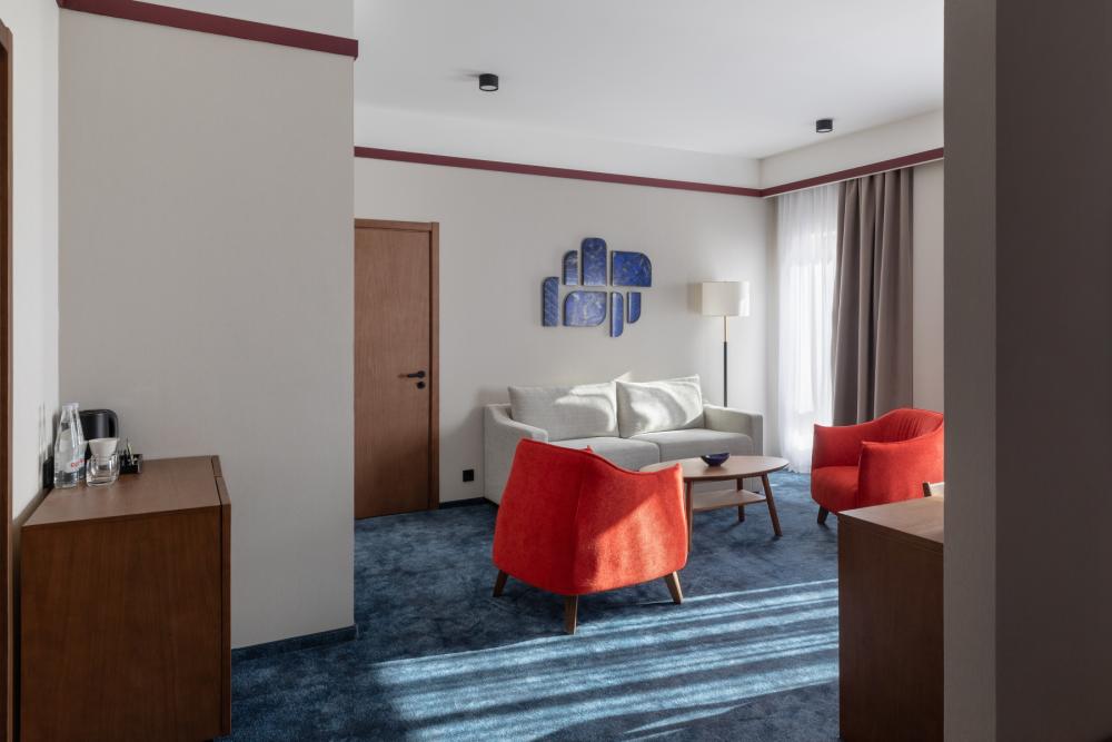 Junior Suite — просторный однокомнатный номер площадью от 32 кв.м, идеально сочетающее комфорт и стиль. В номере расположена большая двуспальная кровать с качественным постельным бельём, а в зоне отдыха есть удобный диван и стильный журнальный столик — идеальное место для расслабления после насыщенного дня. Пол покрыт мягким ковролином, создающим уютную атмосферу. Для хранения вещей предусмотрен вместительный гардероб, а ценные вещи можно разместить в электронном сейфе. Для развлечений и отдыха установлен большой телевизор с цифровым интерактивным TV и фильмами по запросу. В ванной комнате гостей ждёт современный тропический душ, санузел и гигиенический душ. Тёплый пол обеспечит дополнительный комфорт, а зеркало с подсветкой, идеально подойдет для утренних и вечерних процедур. Также имеются все необходимые туалетные принадлежности (полотенца, халаты, тапочки, косметика) и фен для удобства гостей. Номер оборудован кондиционером с индивидуальной настройкой, системой вентиляции, звукоизоляцией и бесплатным высокоскоростным Wi-Fi. Junior Suite — это гармоничное сочетание пространства, удобств и продуманного дизайна для приятного и расслабляющего пребывания.