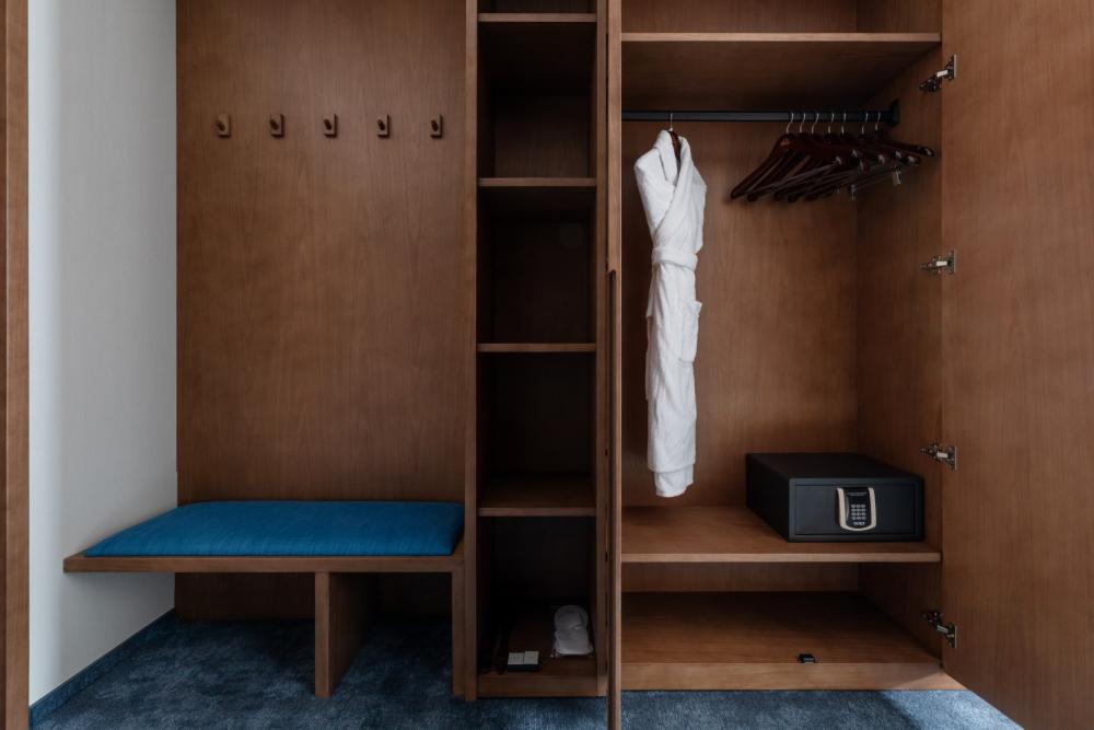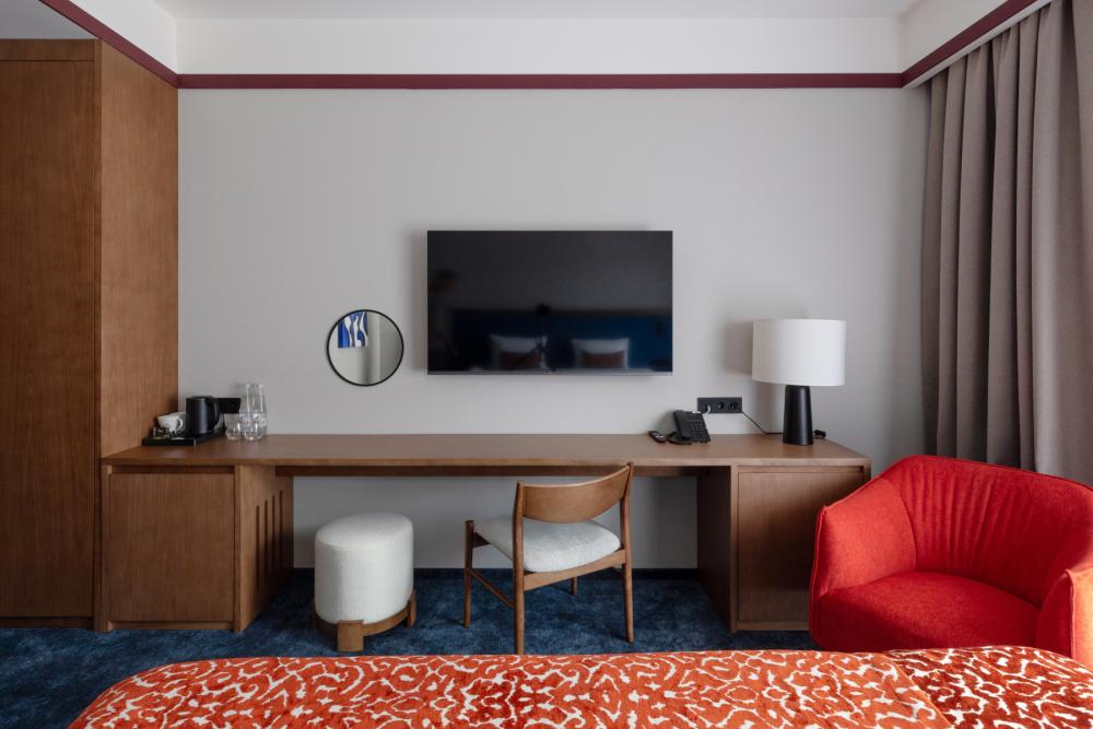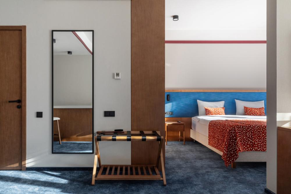 DeLuxe Connect представляет собой уникальное решение — это два номера Стандартной категории, соединённые между собой внутренней дверью, площадью от 40 кв.м. Такая планировка идеально подходит для семей или групп друзей, которые хотят сохранить личное пространство каждого гостя, оставаясь при этом рядом. Вы получаете комфорт и уют стандартных номеров Супериор, а также возможность легко общаться и совместно проводить время в объединённом пространстве. Номер оформлен в современном стиле с акцентом на комфорт и функциональность. В номере расположена большая двуспальная кровать (либо две односпальные кровати) с комфортным матрасом, качественным бельём, обеспечивающим здоровый и крепкий сон. Пол покрыт мягким синим ковролином, стены — в светлых тонах с гармоничным декором. Для отдыха в номере установлено два больших телевизоров с кабельными каналами и фильмами по запросу. Есть вместительные шкафы-гардеробы и электронные сейфы с кодовыми замками. Мини-бар предлагает разнообразные напитки и закуски (по запросу).