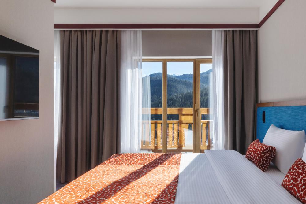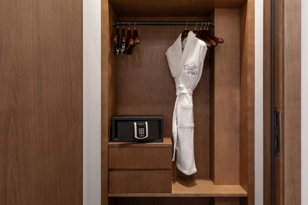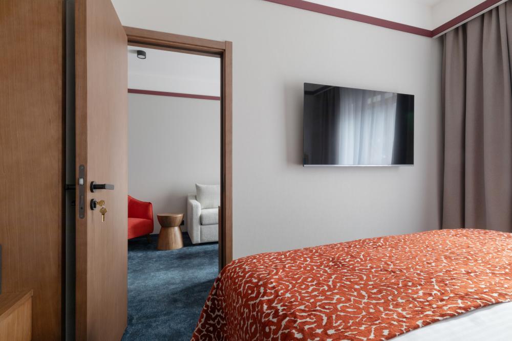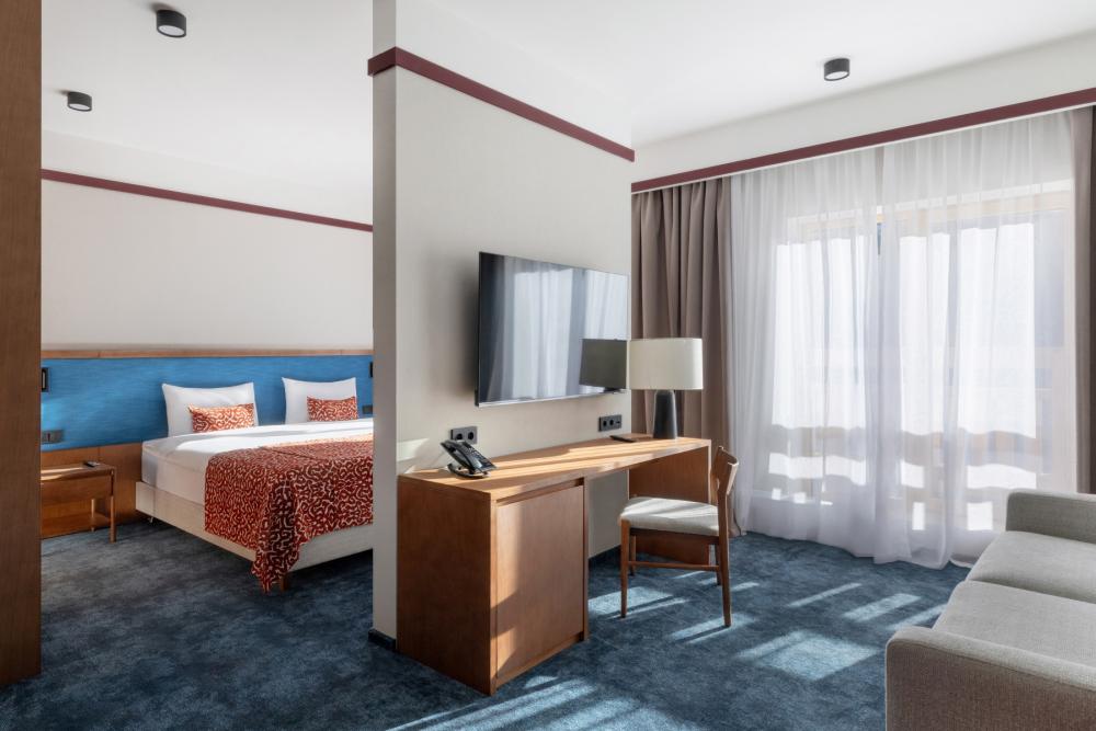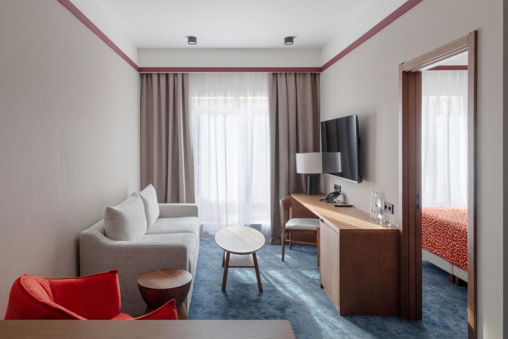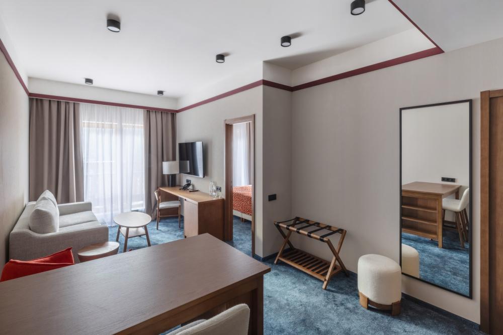 Junior KIDS — просторное пространство площадью 42 кв.м, идеально сочетающее комфорт и стиль. В номере расположена большая двуспальная кровать с качественным постельным бельём, а в зоне отдыха есть удобный диван и стильный журнальный столик — идеальное место для расслабления после насыщенного дня. Фишкой номера является двухъярусная детская кровать. Пол покрыт мягким ковролином, создающим уютную атмосферу. Для хранения вещей предусмотрен вместительный гардероб, а ценные вещи можно разместить в электронном сейфе. Для развлечений и отдыха установлен большой телевизор с цифровым интерактивным TV и фильмами по запросу. В ванной комнате гостей ждёт современный тропический душ, санузел и гигиенический душ. Тёплый пол обеспечит дополнительный комфорт, а зеркало с подсветкой, идеально подойдет для утренних и вечерних процедур. Также имеются все необходимые туалетные принадлежности (полотенца, халаты, тапочки, косметика) и фен для удобства гостей. Номер оборудован кондиционером с индивидуальной настройкой, системой вентиляции, звукоизоляцией и бесплатным высокоскоростным Wi-Fi. Номера данной категории отличаются гибкостью и разнообразием планировок. Это может быть уютный однокомнатный номер, или же пространство, зонированное стильной перегородкой. Junior KIDS — это гармоничное сочетание пространства, удобств и продуманного дизайна для приятного и расслабляющего пребывания.