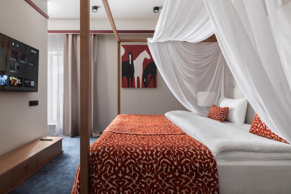 Номер категории Executive Suite LAZURITE - просторный однокомнатный площадью 54 кв.м, воплощение комфорта и элегантности. Спальная зона оборудована большой двуспальной кроватью с изящным балдахином, создающим атмосферу уюта и роскоши. Зона отдыха включает удобный диван и стильный журнальный столик — идеальное место для расслабления после насыщенного дня. В номере установлен телевизор с большим экраном с кабельными каналами и фильмами по запросу. Номер оборудован кондиционером с индивидуальной настройкой, системой вентиляции, звукоизоляцией и бесплатным высокоскоростным Wi-Fi. Пол покрыт мягким синим ковролином, придающим комнате теплоту и изысканность. Для хранения вещей предусмотрен вместительный гардероб, а также электронный сейф для хранения ценных предметов. Гости также могут воспользоваться мини-баром с разнообразными напитками и закусками (по запросу). Просторная ванная комната оснащена ванной, биде, тёплым полом и зеркалом с подсветкой, а также феном и туалетные принадлежности (полотенца, халаты, тапочки, косметика) — всё для вашего максимального комфорта и удобства. Executive Suite LAZURITE — идеальный выбор для тех, кто ценит стиль, пространство и высокий уровень обслуживания.