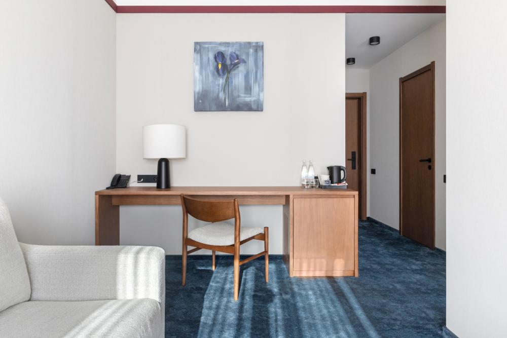 Стандарт – однокомнатный лаконичный номер, площадью от 20 кв.м. Номер оформлен в современном стиле с акцентом на комфорт и функциональность. В номере расположена большая двуспальная кровать (либо две односпальные кровати) с комфортным матрасом, качественным бельём, обеспечивающим здоровый и крепкий сон. Пол покрыт мягким синим ковролином, стены — в светлых тонах с гармоничным декором. Для отдыха в номере установлен большой телевизор с кабельными каналами и фильмами по запросу. Рабочее место включает стол и стул. Есть вместительный шкаф-гардероб и электронный сейф с кодовым замком. Мини-бар предлагает разнообразные напитки и закуски (по запросу). Ванная комната оснащена тропическим душем, тёплым полом, зеркалом с подсветкой, санузлом и гигиеническим душем. Также предусмотрен фен и все необходимые туалетные принадлежности (полотенца, халаты, тапочки, косметика). Номер оборудован кондиционером с индивидуальной настройкой, системой вентиляции, звукоизоляцией и бесплатным высокоскоростным Wi-Fi. Стандарт сочетает продуманный дизайн, технические удобства и домашний уют для максимального комфорта гостей.