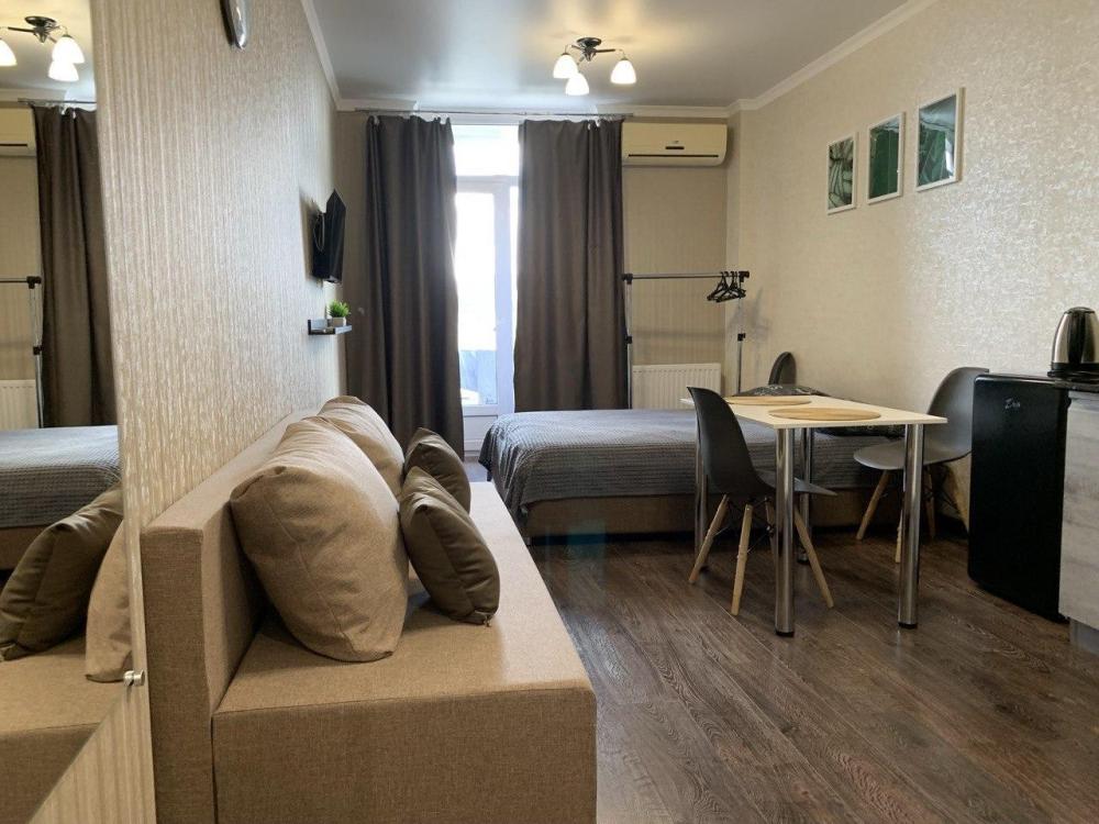 Уютная студия для 4 человек. В апартаментах имеется все необходимое для комфортного проживания: двуспальная кровать и двуспальный диван, TV и сплит-система; полностью оборудованная кухня: холодильник, варочная панель, микроволновка, чайник; все необходимые принадлежности для душа, фен, утюг и гладильная доска