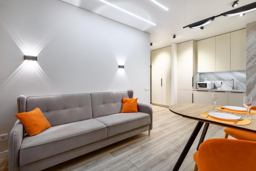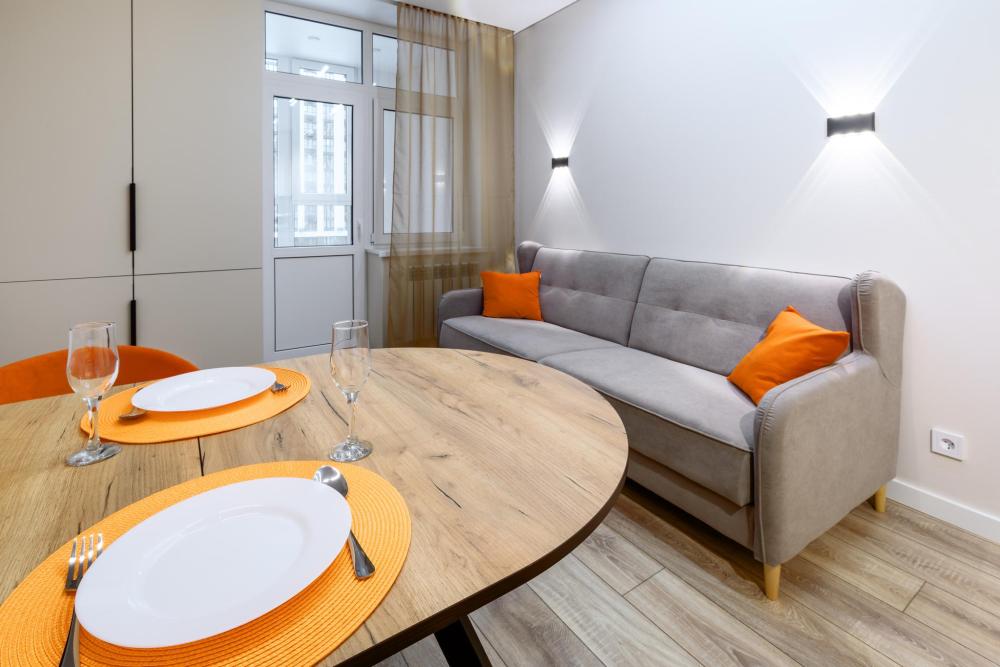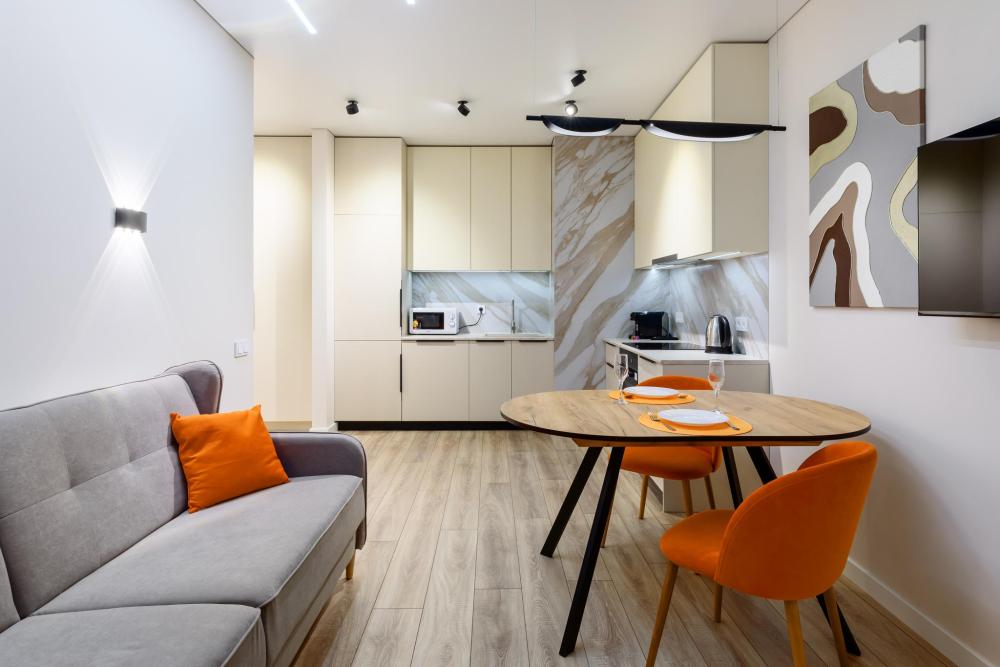 Уютные апартаменты, оборудованные всем необходимым для комфортного проживания. В апартаментах: двуспальная кровать, диван, кухня с обеденной зоной, оборудованная необходимой техникой и посудой, санузел с душем.