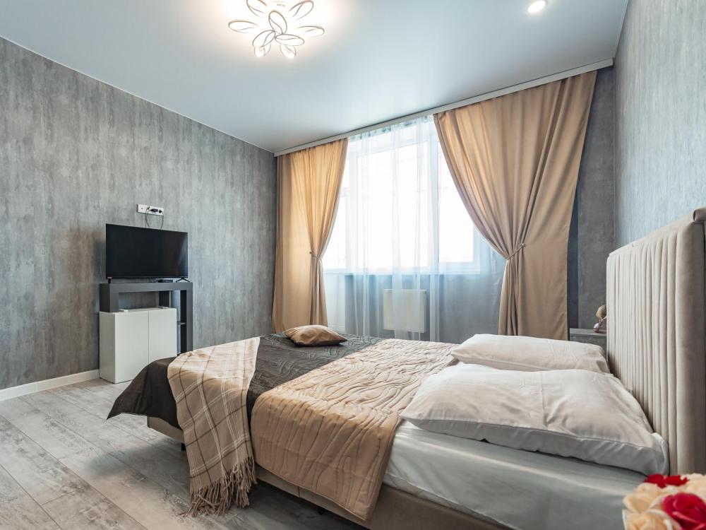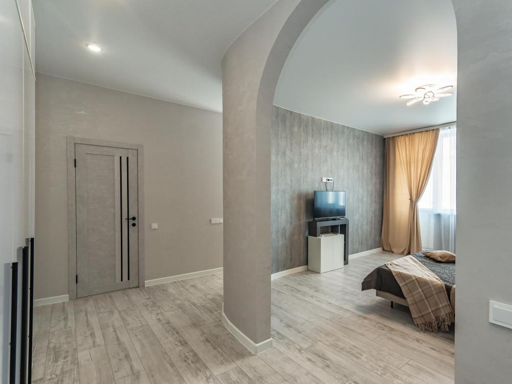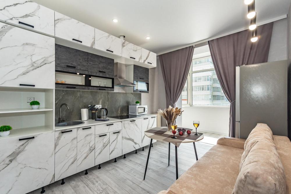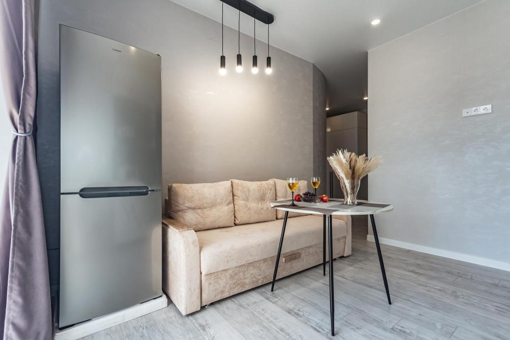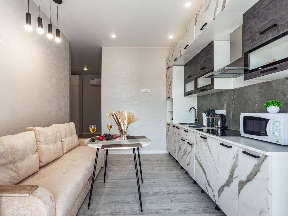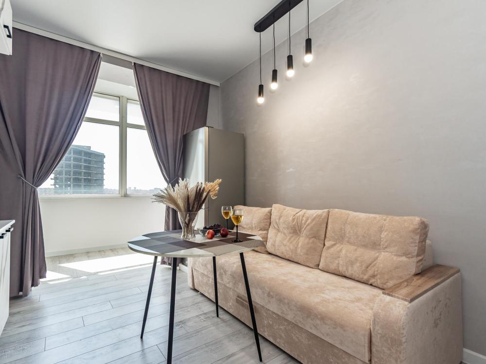 Уютные однокомнатные апартаменты, оборудованные всем необходимым для комфортного проживания. В квартире есть удобные спальные места (двуспальная кровать 160x200 см с ортопедическим матрасом и белоснежным бельем, диван-кровать), компактная зона кухни с обеденной зоной и посудой для приготовления пищи, вся необходимая бытовая техника, быстрый безлимитный Wi-Fi, смарт телевизор с онлайн кинотеатром Кинопоиск, гигиенические принадлежности (зубные наборы, гель для душа, шампунь, свежие полотенца), шторы блэкаут для спокойного сна, сплит-система кондиционирования и бойлер для горячей воды.