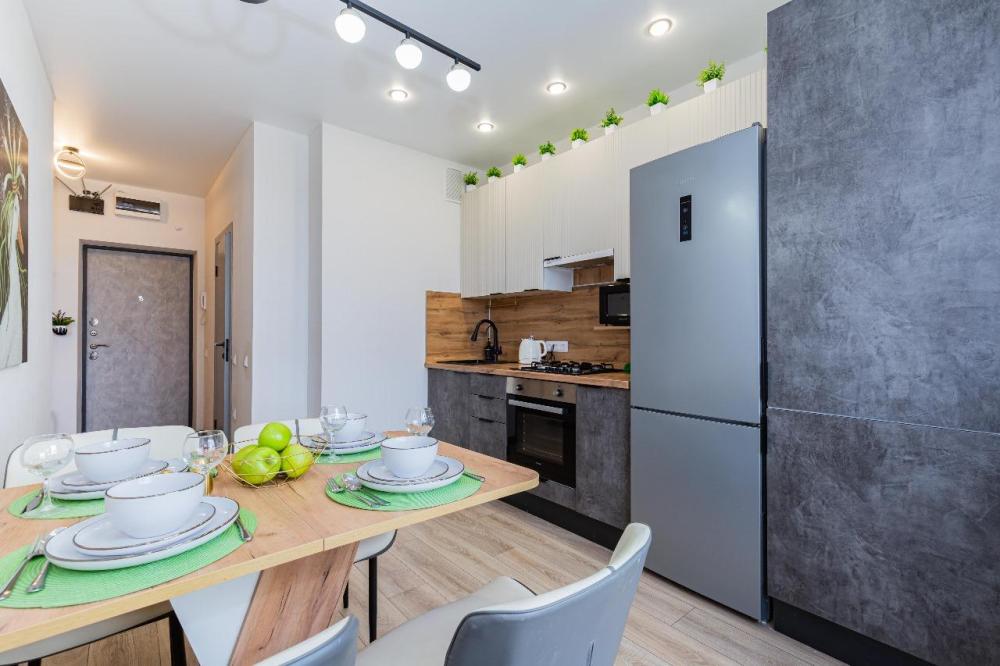 - В квартире  есть кухня с духовым шкафом и плитой, холодильником, микроволновой печью и всем необходимым
