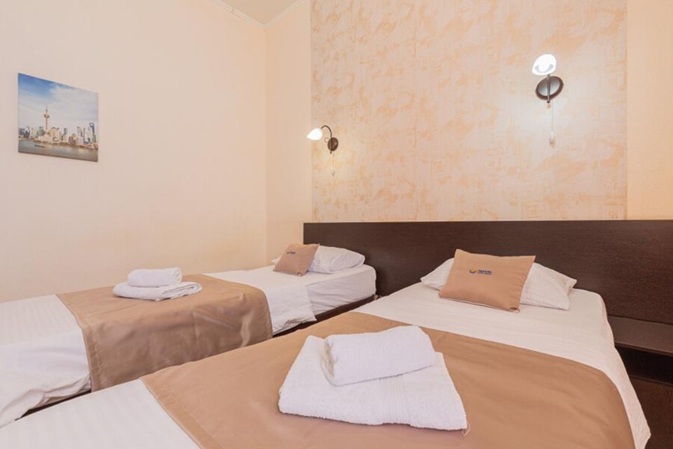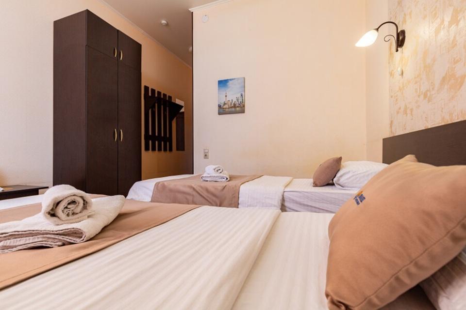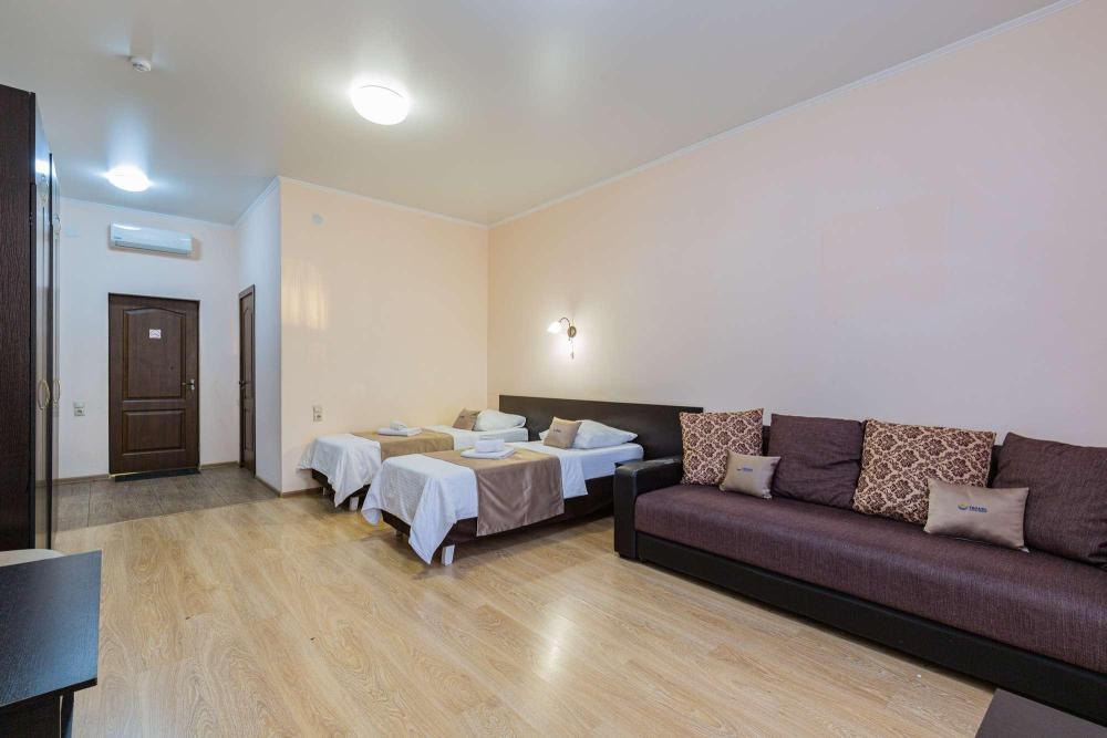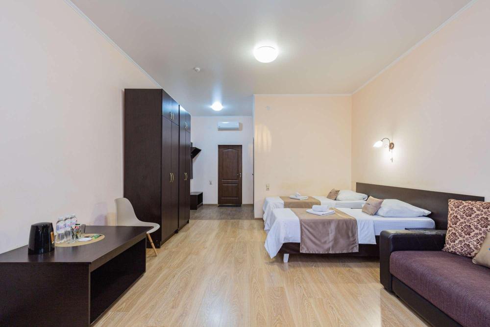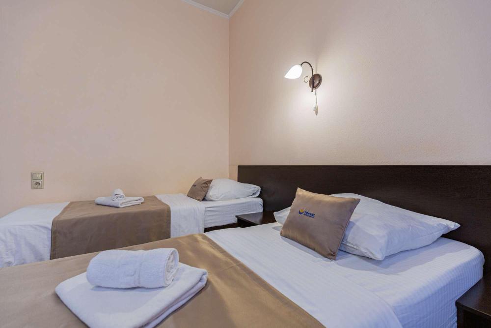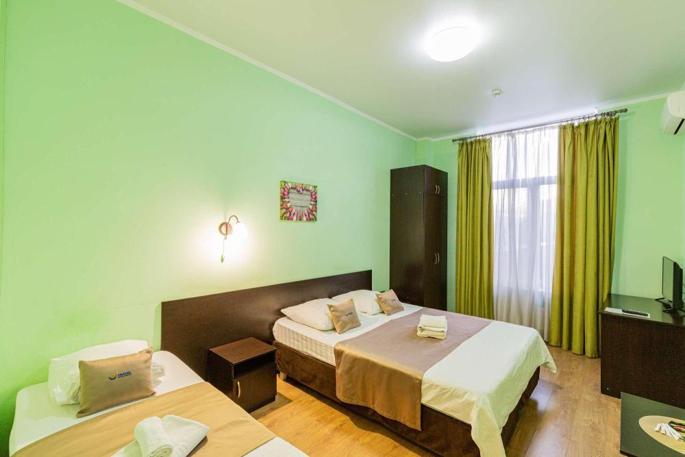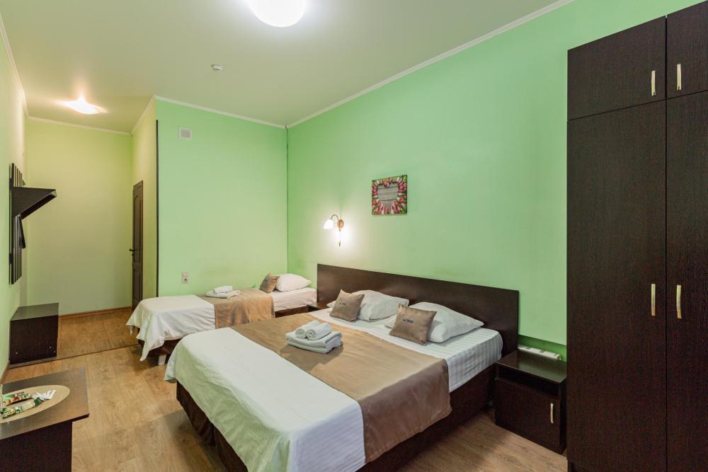 3х-местный номер Стандарт оснащён всем необходимым для комфортного проживания 3х гостей. Спальные места: -двуспальная кровать и односпальная кровать (с возможностью сделать 3 отдельные кровати) Оснащение и мебель: Кондиционер Уголок для отдыха Шкаф/гардероб Рабочий стол. Ванная комната: Собственный санузел с душем Фен, полотенца, бесплатные туалетные принадлежности Туалет. Удобства для приготовления чая и кофе: Электрический чайник Холодильник Развлечения и связь: Телевизор с кабельным и спутниковым ТВ Wi-Fi