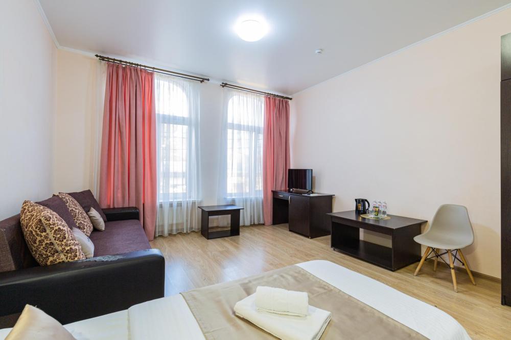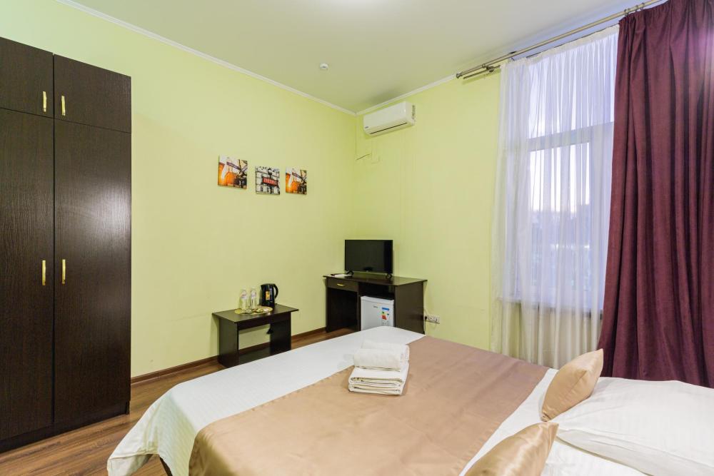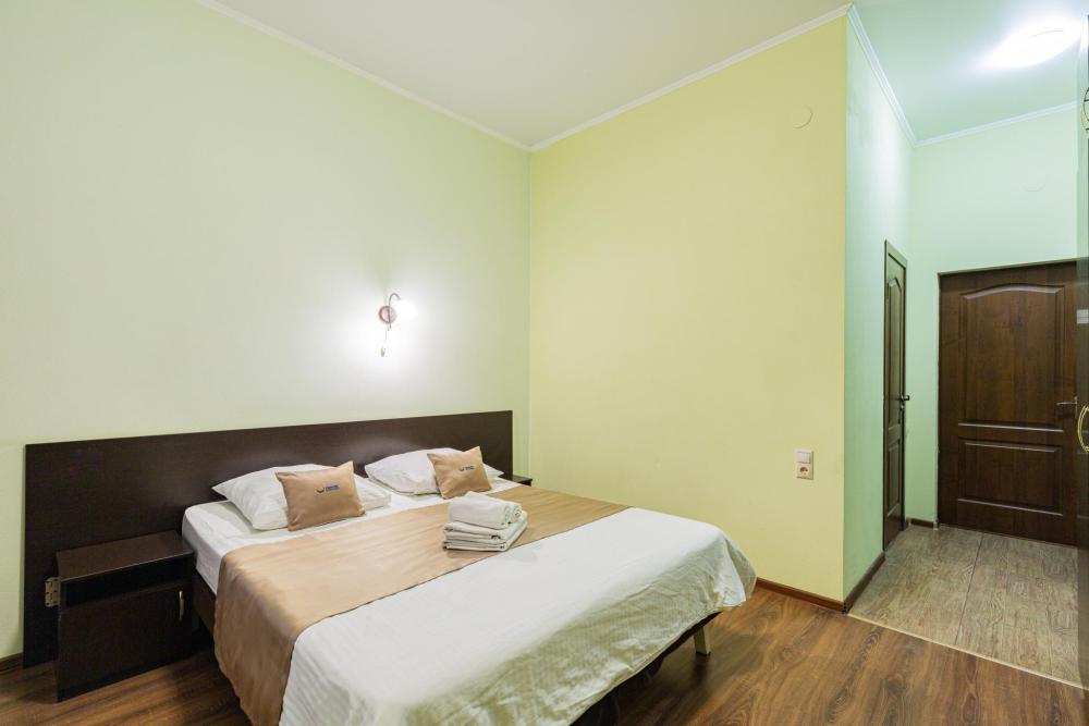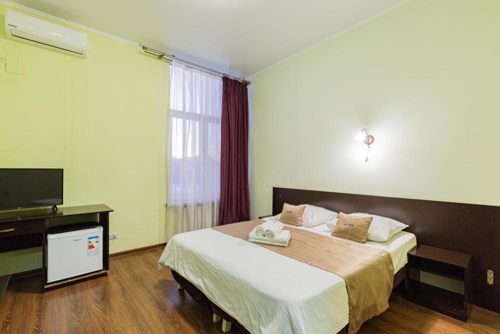 2хместный номер Стандарт оснащён всем необходимым для комфортного проживания. Спальные места: -двуспальная кровать (с возможностью сделать 2 отдельные кровати) Оснащение и мебель: Кондиционер Уголок для отдыха Шкаф/гардероб Рабочий стол. Ванная комната: Собственный санузел с душем Фен, полотенца, бесплатные туалетные принадлежности Туалет. Удобства для приготовления чая и кофе: Электрический чайник Холодильник Развлечения и связь: Телевизор с кабельным и спутниковым ТВ Wi-Fi