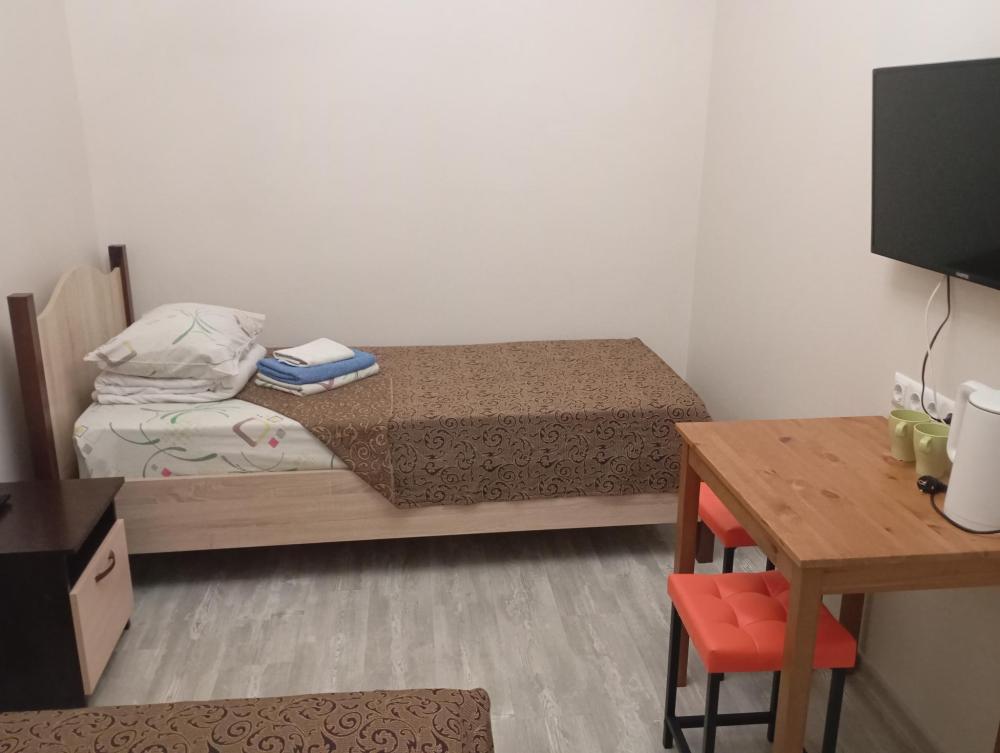 Односпальная кровать с ортопедическим матрасом. Прикроватная тумба, стол, стул, вешалка, телевизор, кондиционер, чайник, зеркало, телефон.