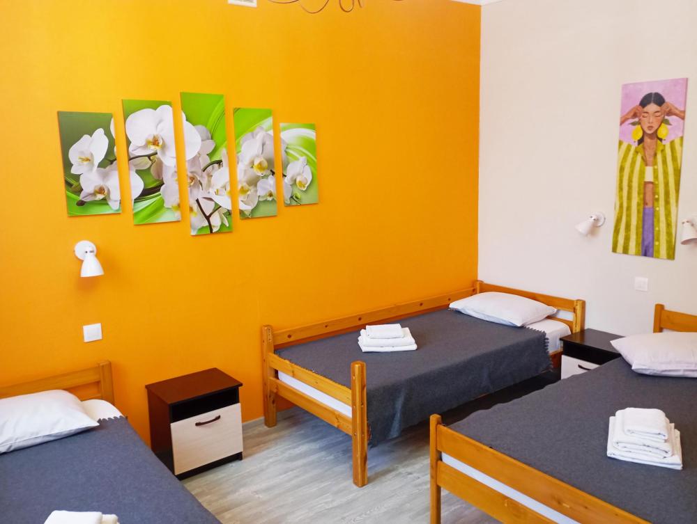 2 двухярусные кровати и 1 односпальная кровать с ортопедическими матрасами, прикроватные тумбы, стол, стулья, шкаф, телевизор, кондиционер, чайник, зеркало, телефон, полотенца