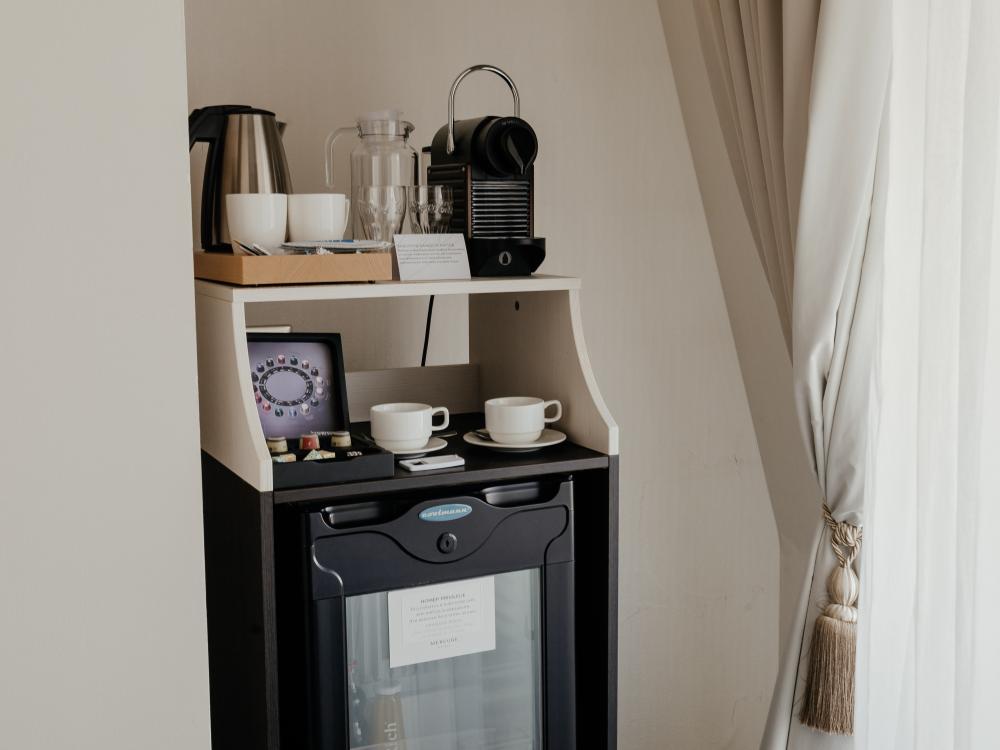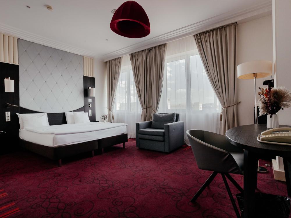 Просторный двухкомнатный двухкомнатный номер с гостиной и спальней, где установлена большая двуспальная кровать. В гостиной имеется мягкий диван, кресла, телевизор с плоским экраном и наборы для приготовления чая и кофе. В ванной комнате установлена душевая кабина с эффектом тропического душа. К услугам гостей халат и тапочки, набор полотенец и комплект косметических принадлежностей. Также в стоимость номера входит посещение тренажерного зала и сауны отеля.