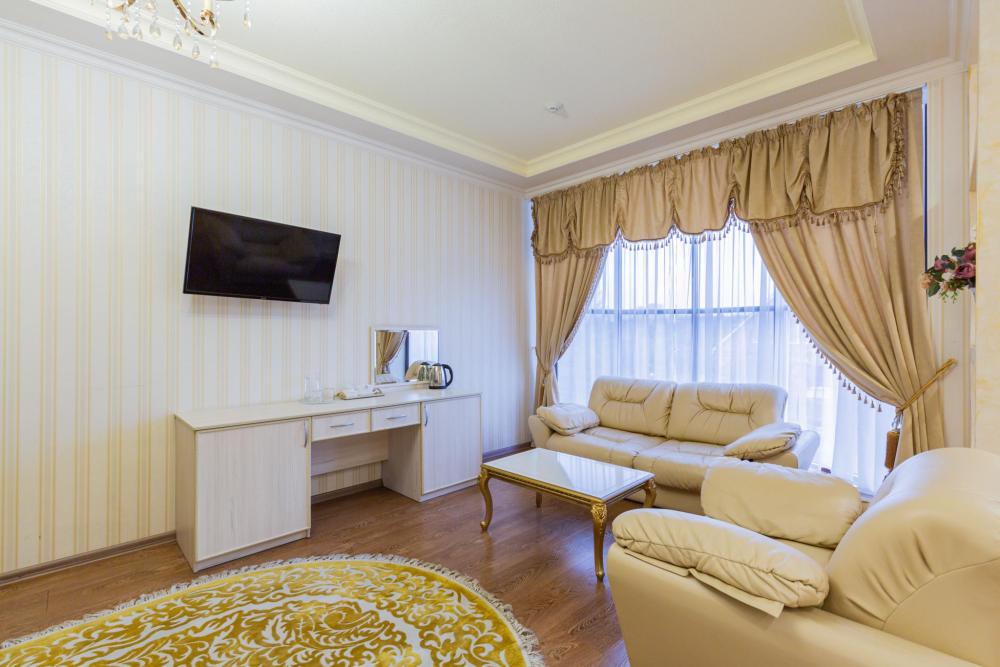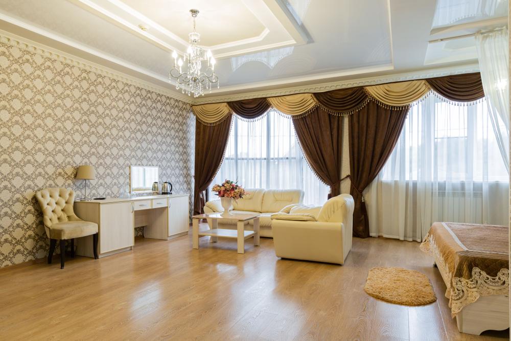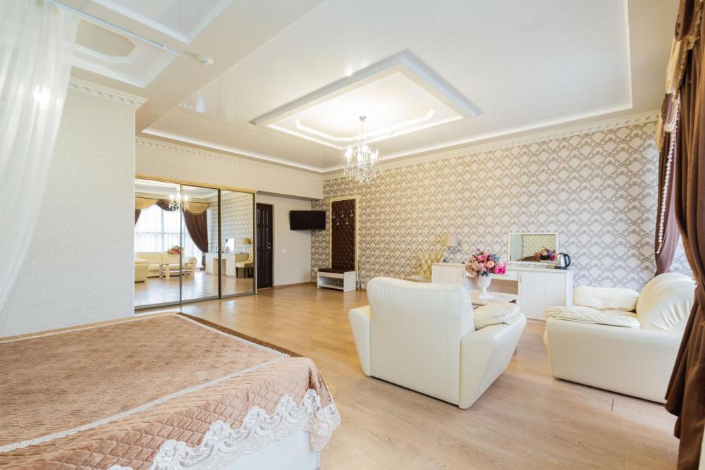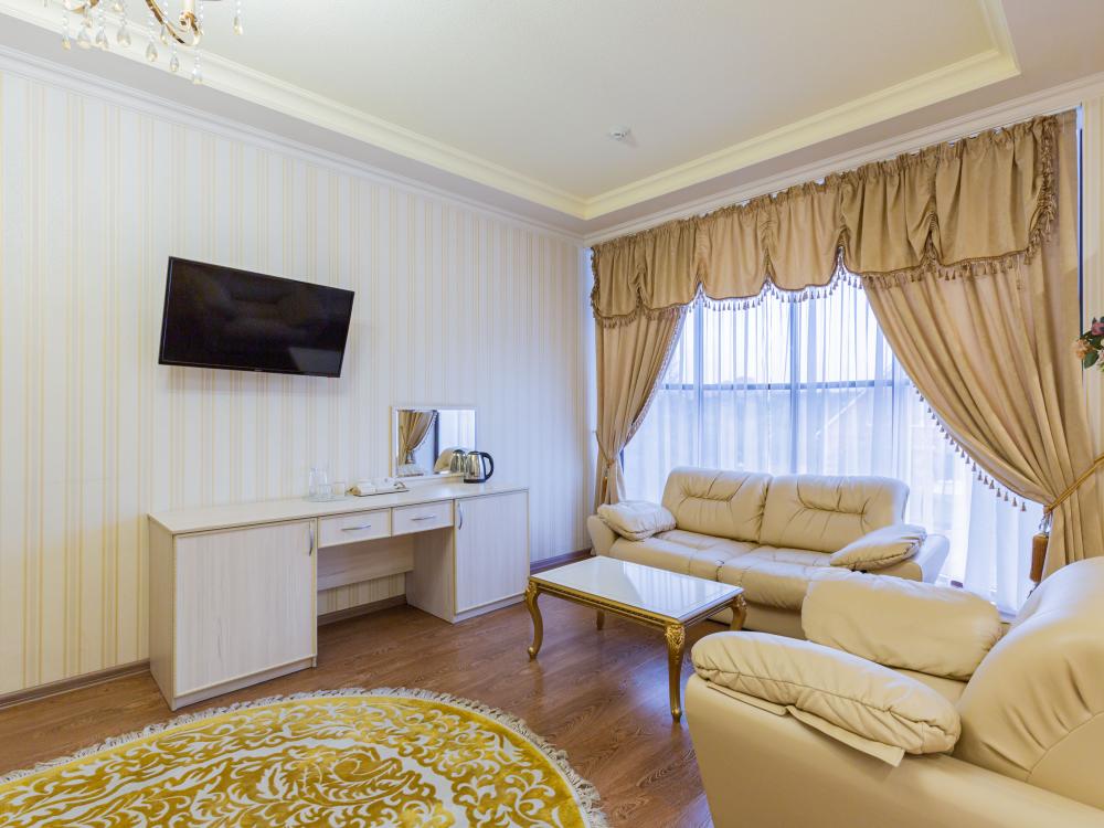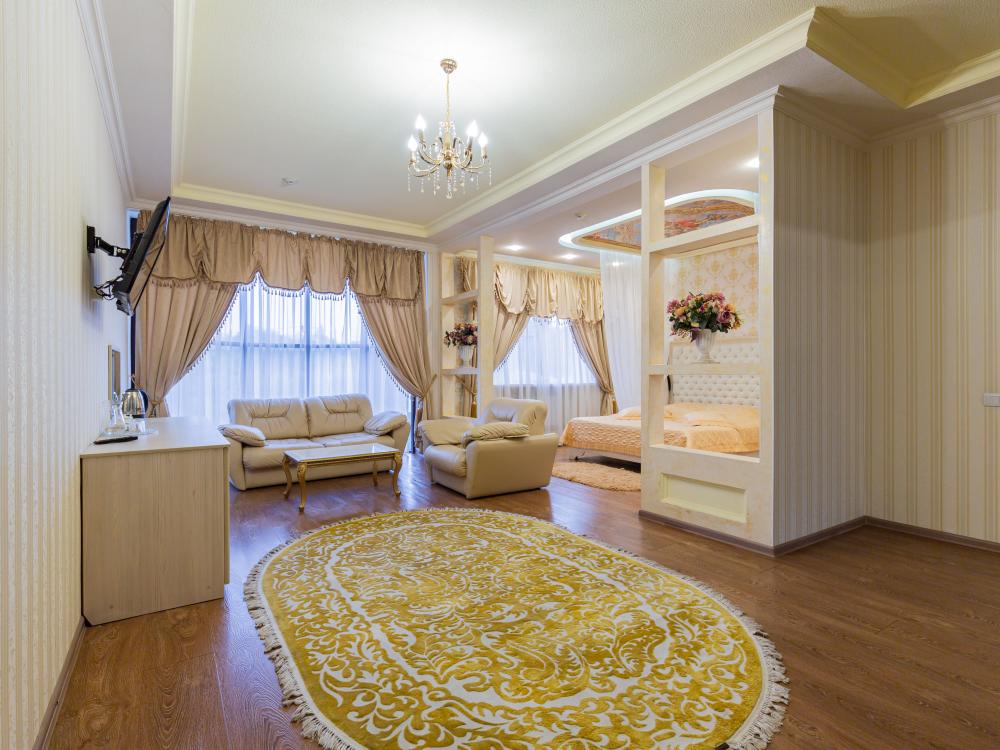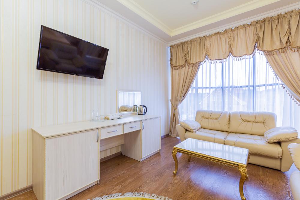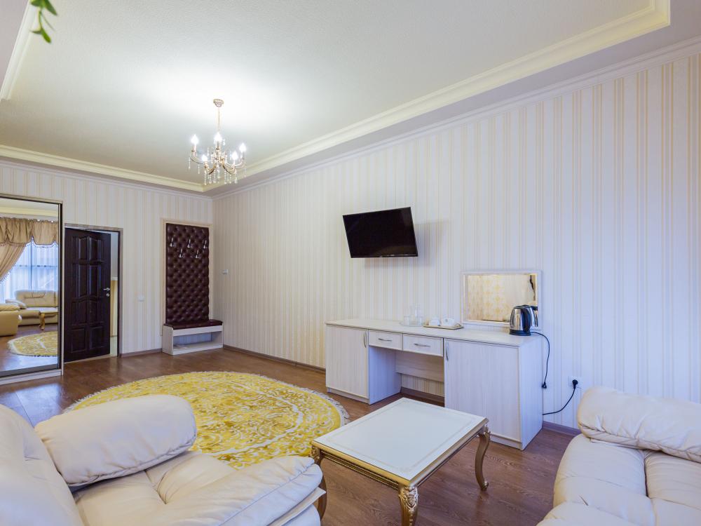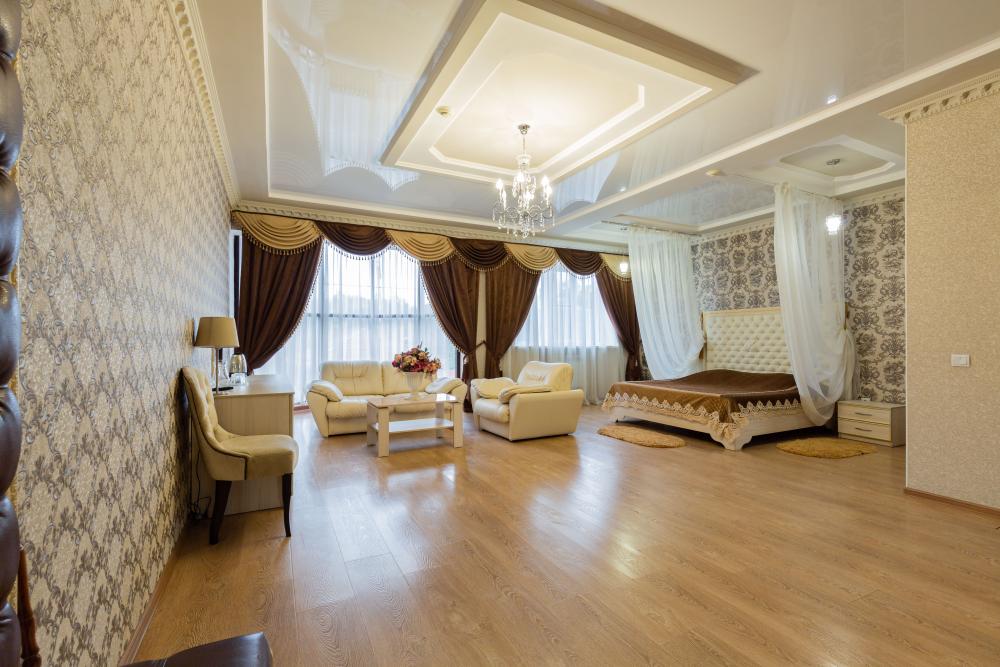 Большой и просторный номер категории люкс. В номере: большая двуспальная кровать, зона отдыха с диванчиком и креслом, шкаф, столик, набор для чая и кофе, телевизор, кондиционер, ванная комната