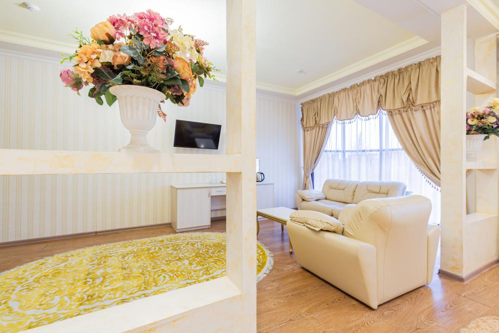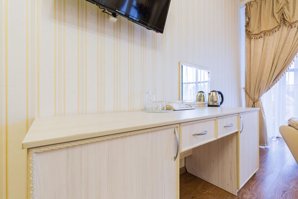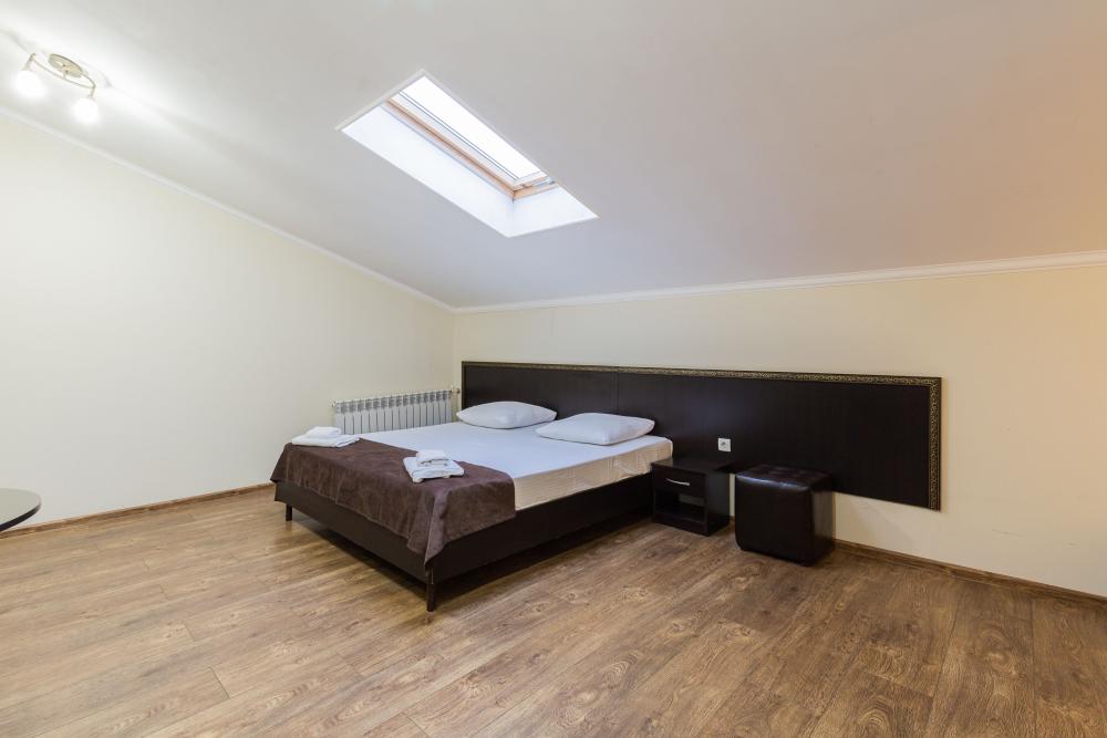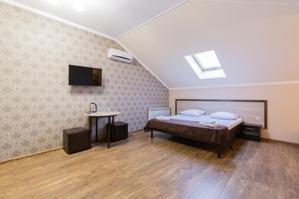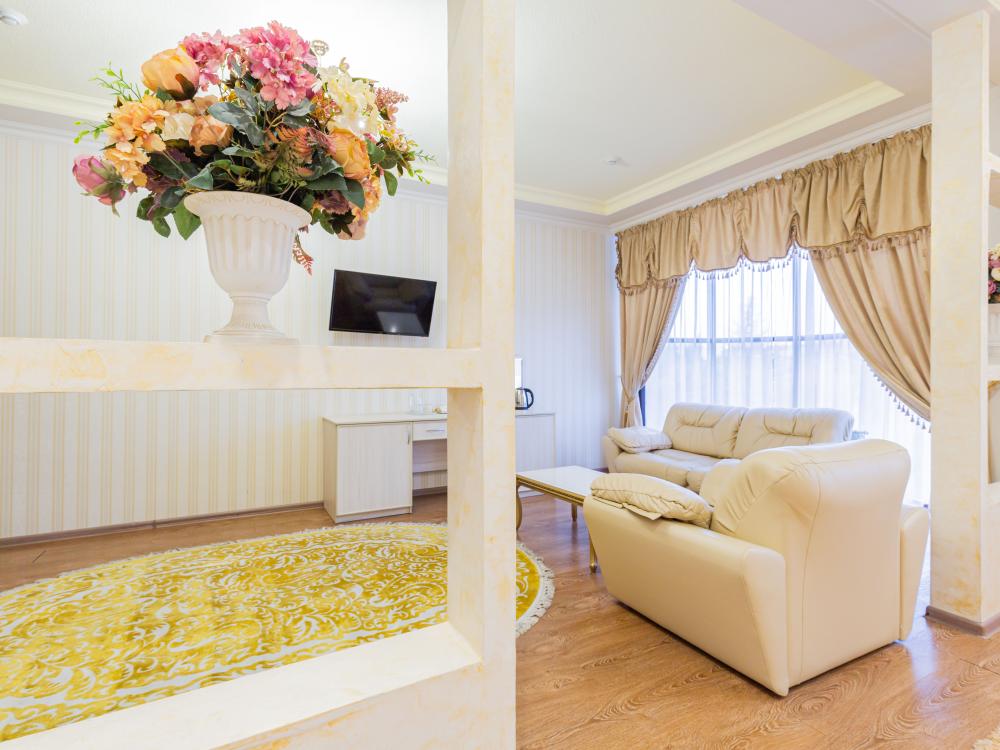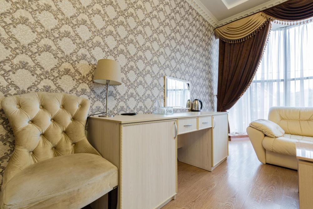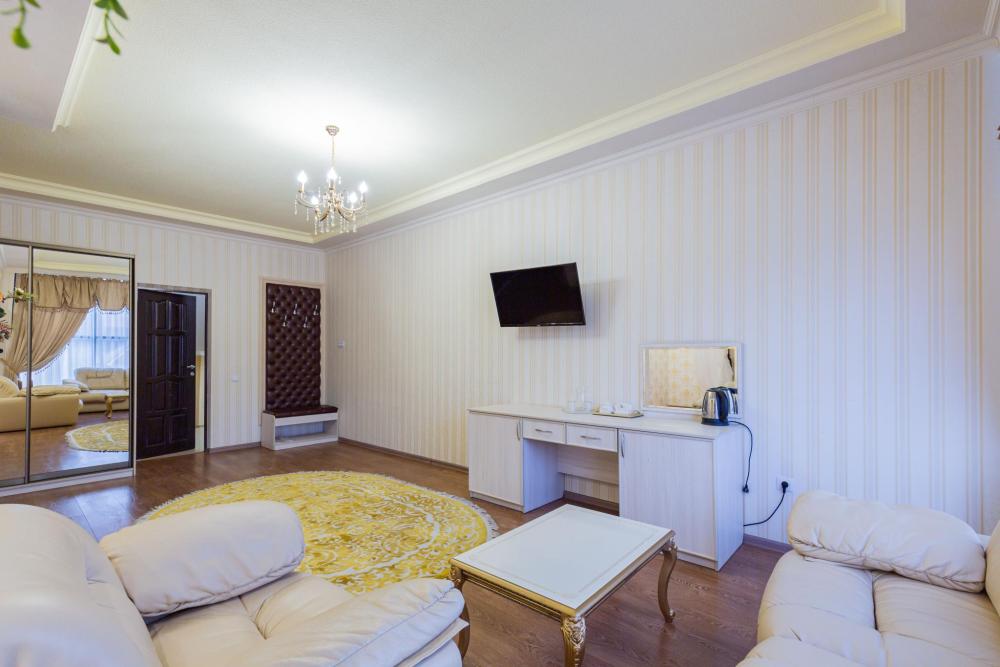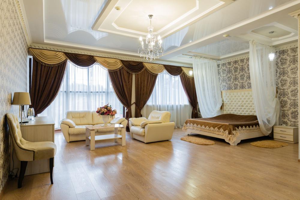 Большой и просторный номер категории люкс. В номере: большая двуспальная кровать, зона отдыха с диванчиком и креслом, шкаф, столик, набор для чая и кофе, телевизор, кондиционер, ванная комната