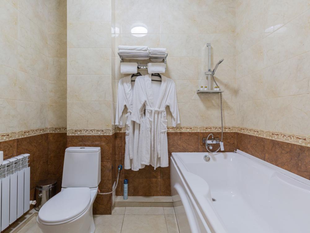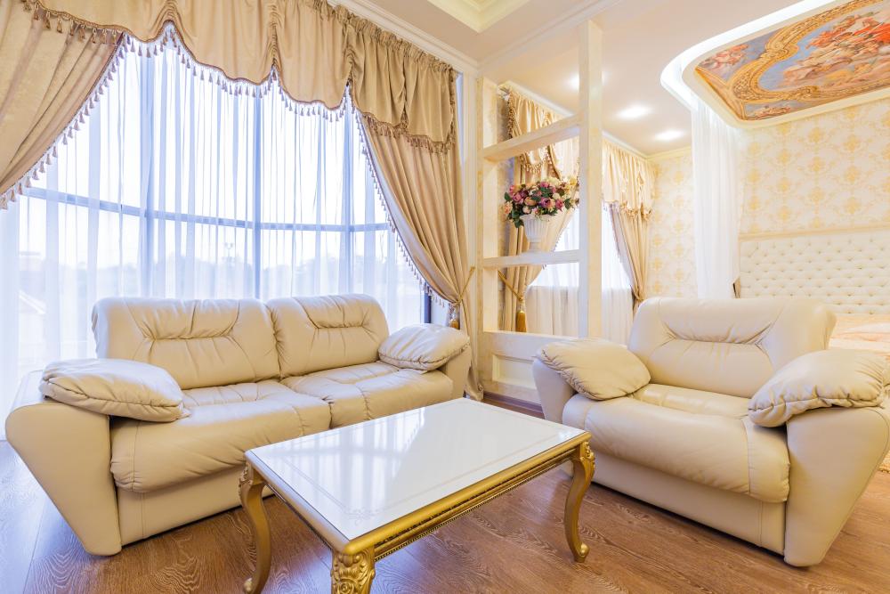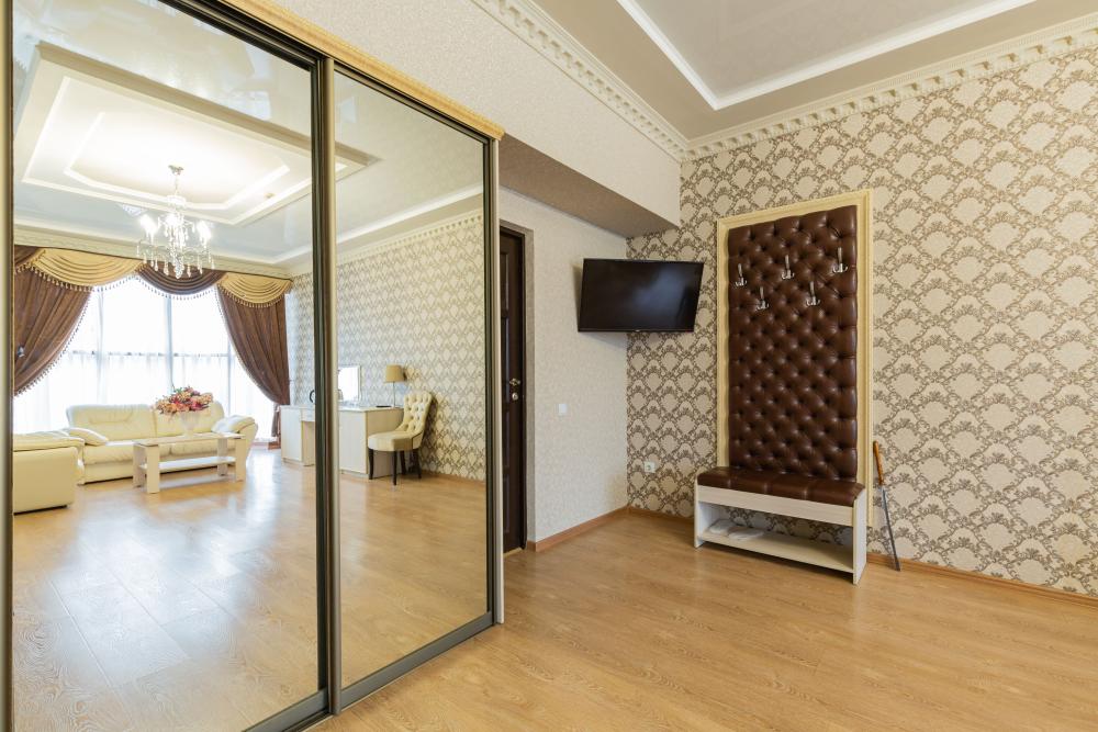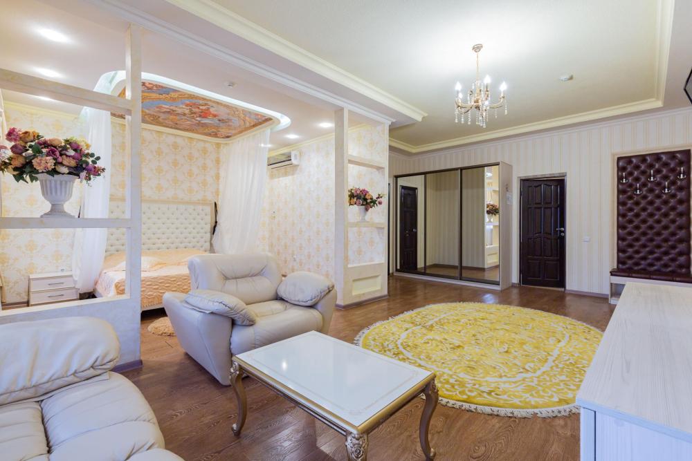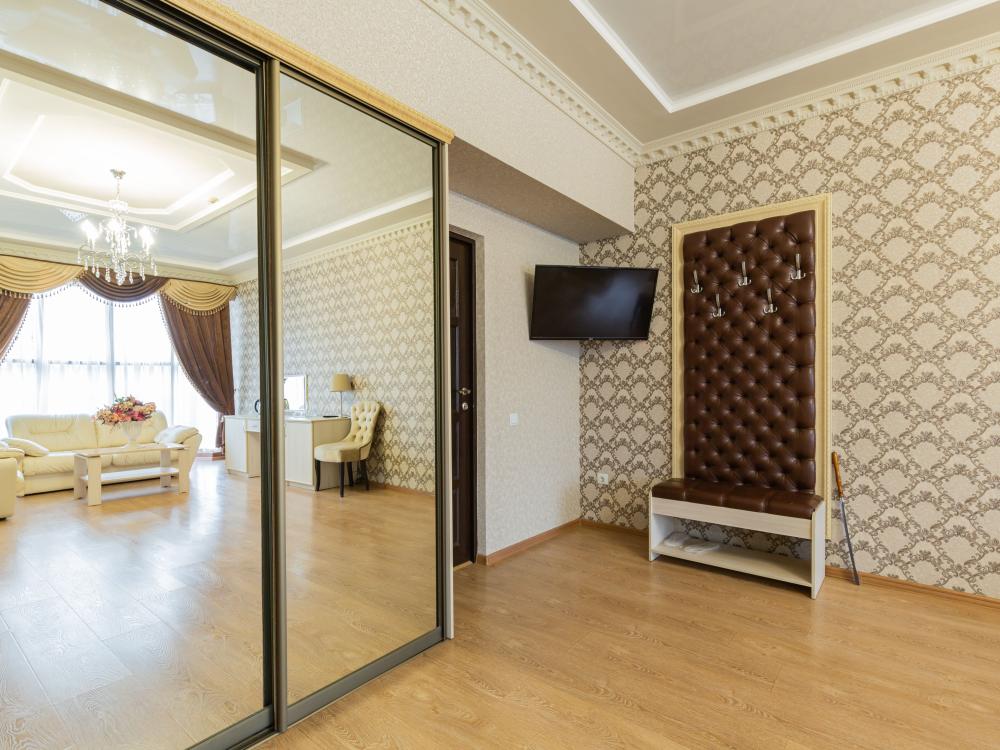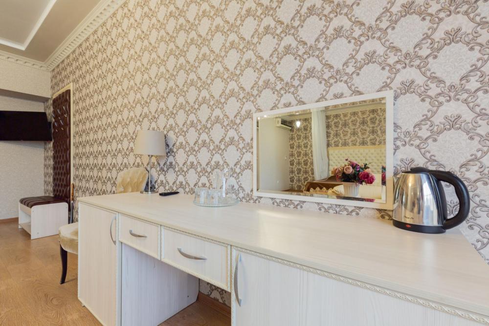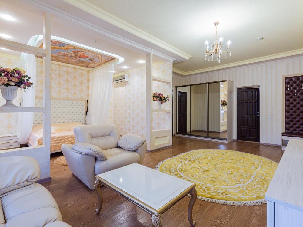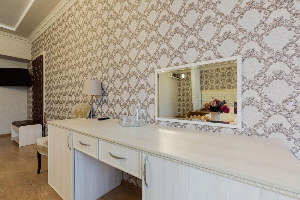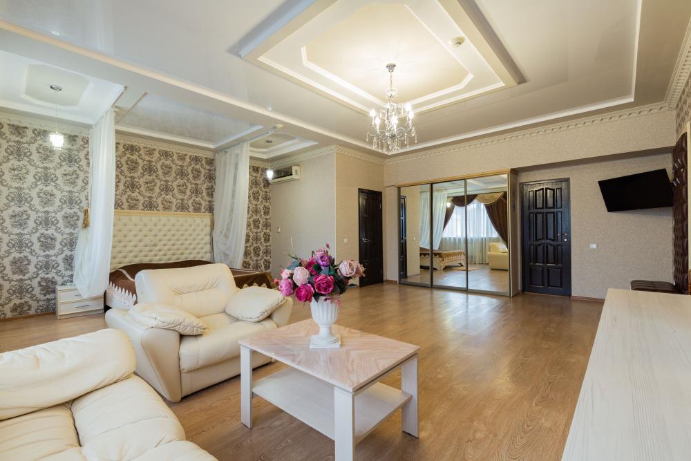 Большой и просторный номер категории люкс. В номере: большая двуспальная кровать, зона отдыха с диванчиком и креслом, шкаф, столик, набор для чая и кофе, телевизор, кондиционер, ванная комната