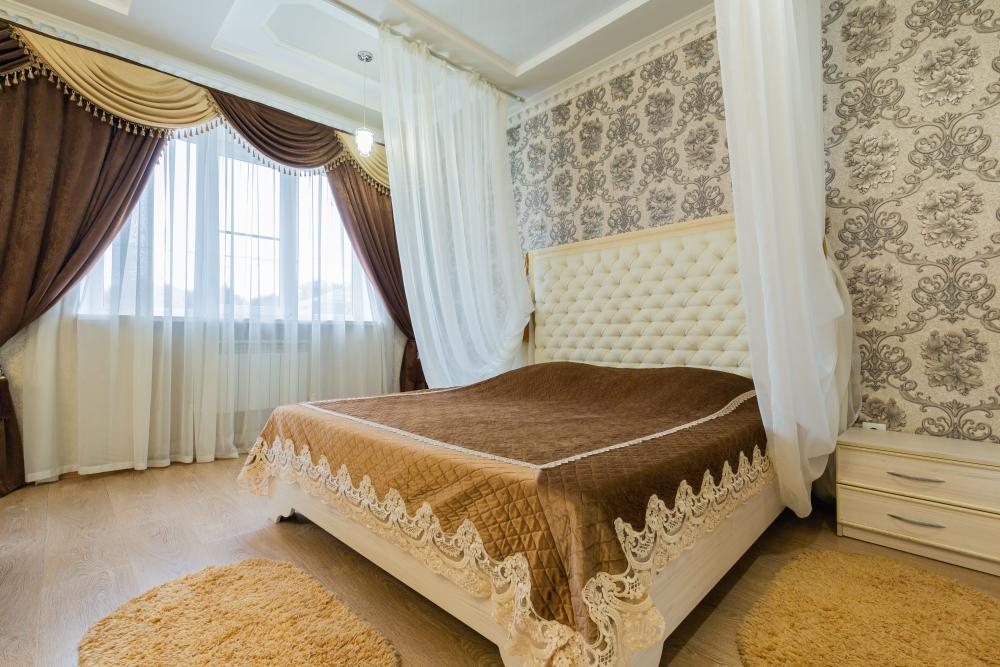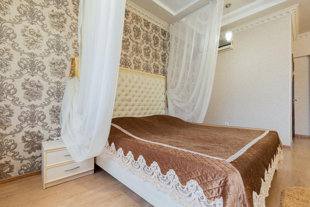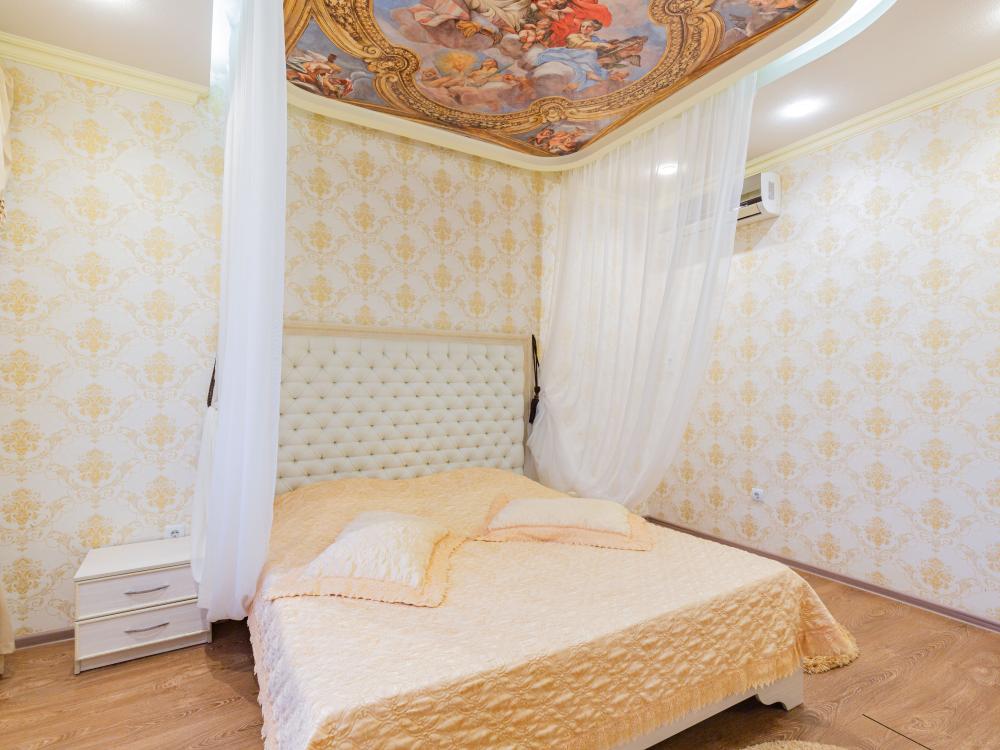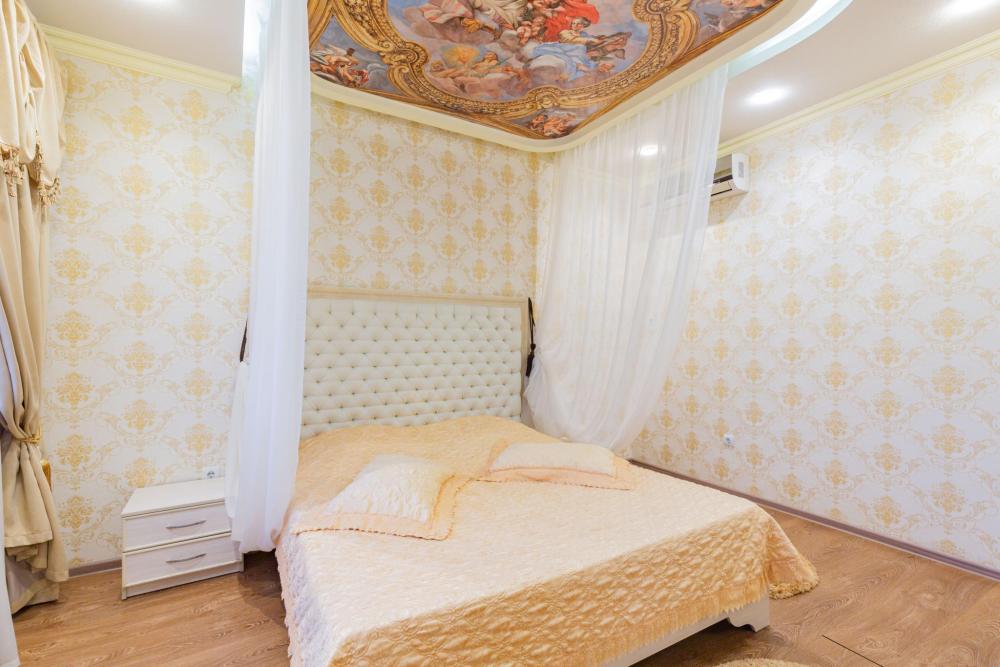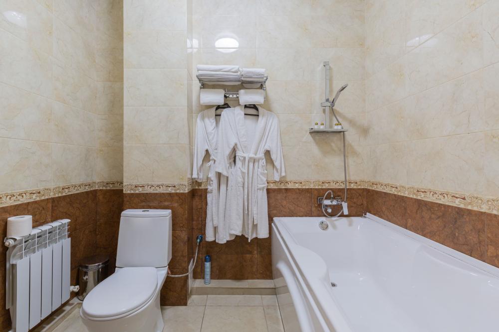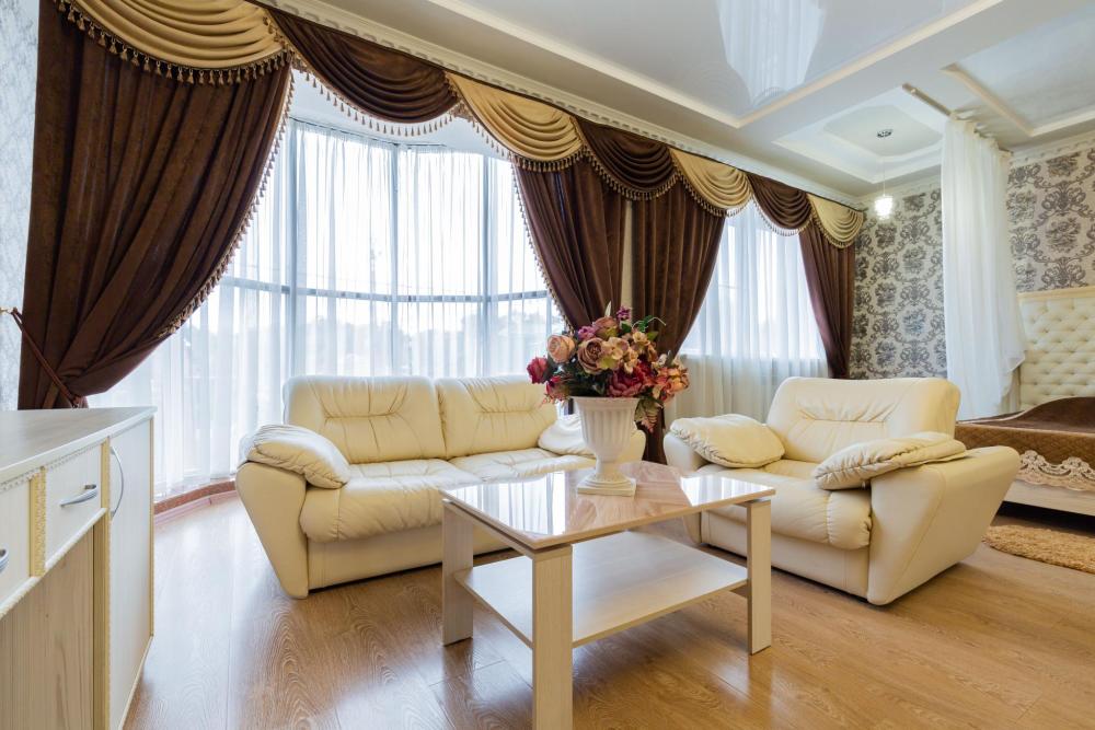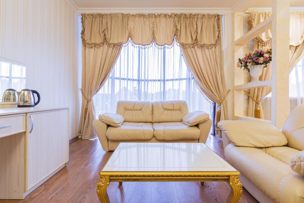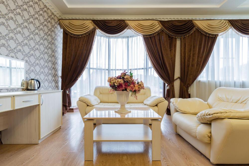 Большой и просторный номер категории люкс. В номере: большая двуспальная кровать, зона отдыха с диванчиком и креслом, шкаф, столик, набор для чая и кофе, телевизор, кондиционер, ванная комната