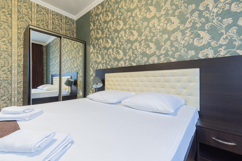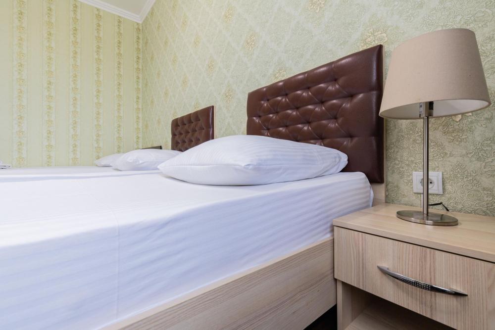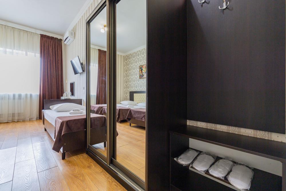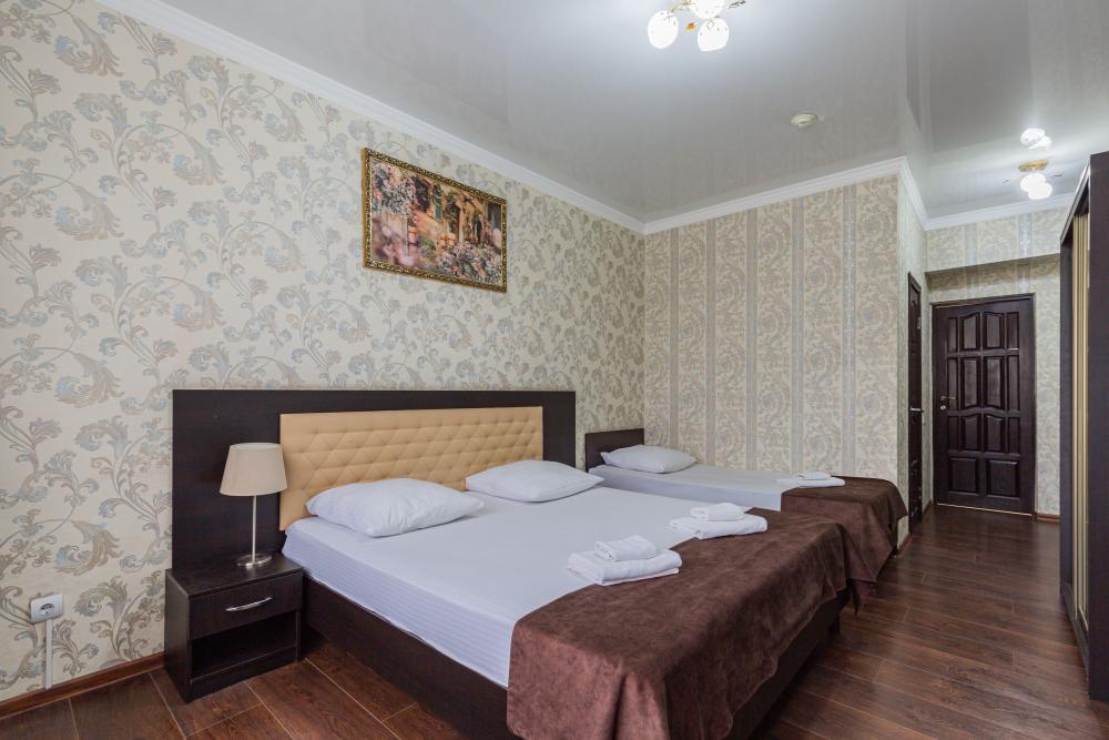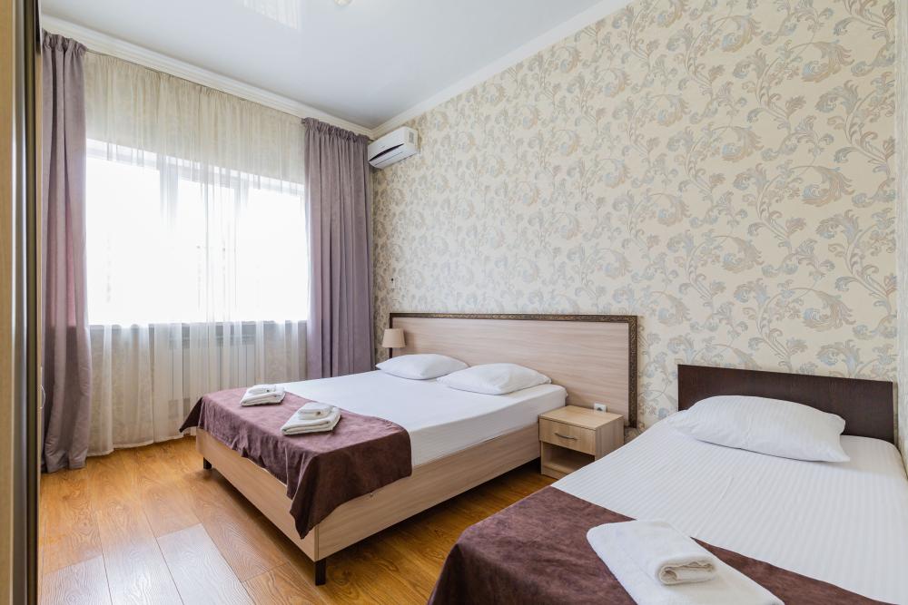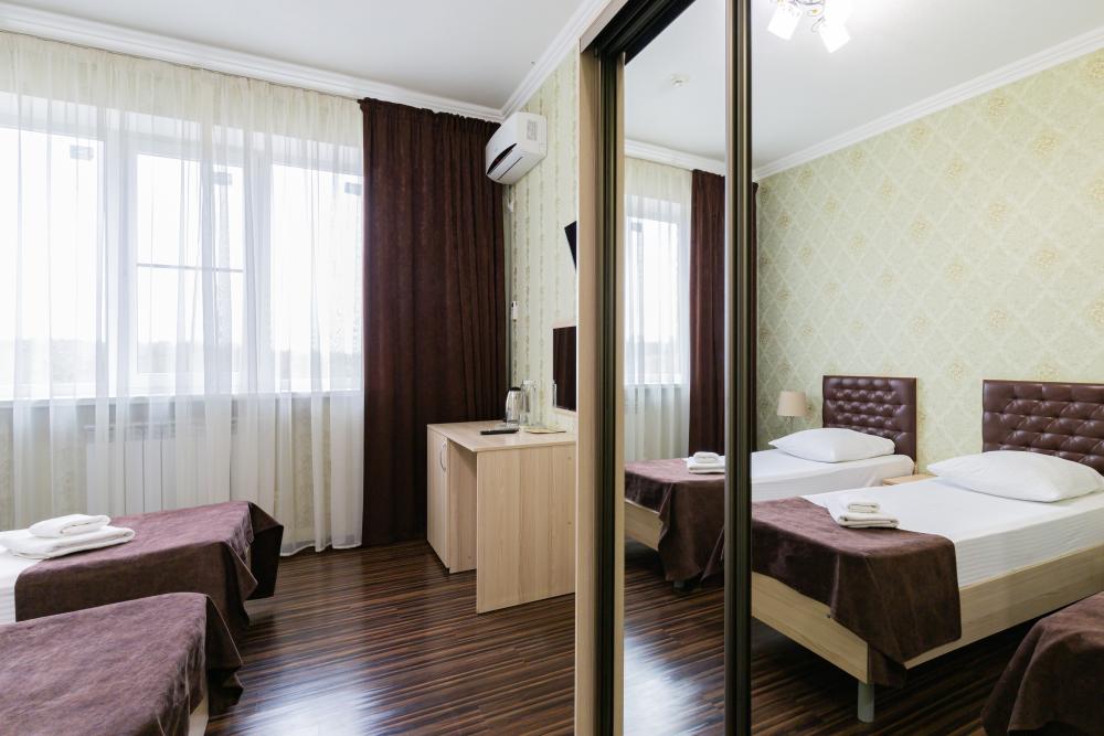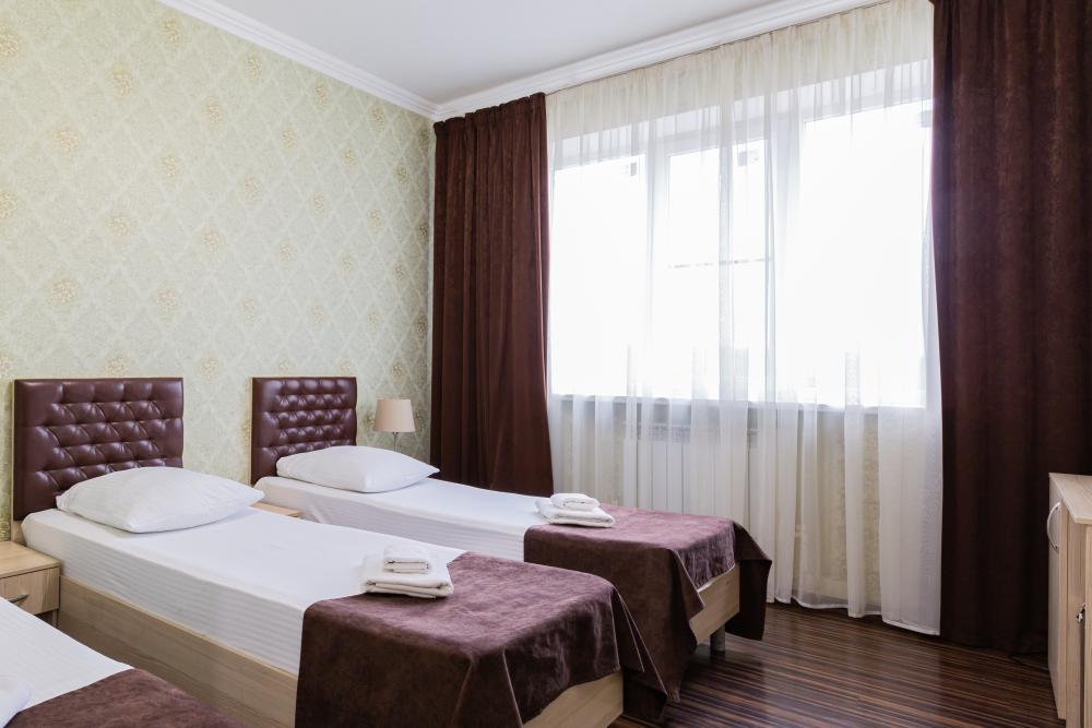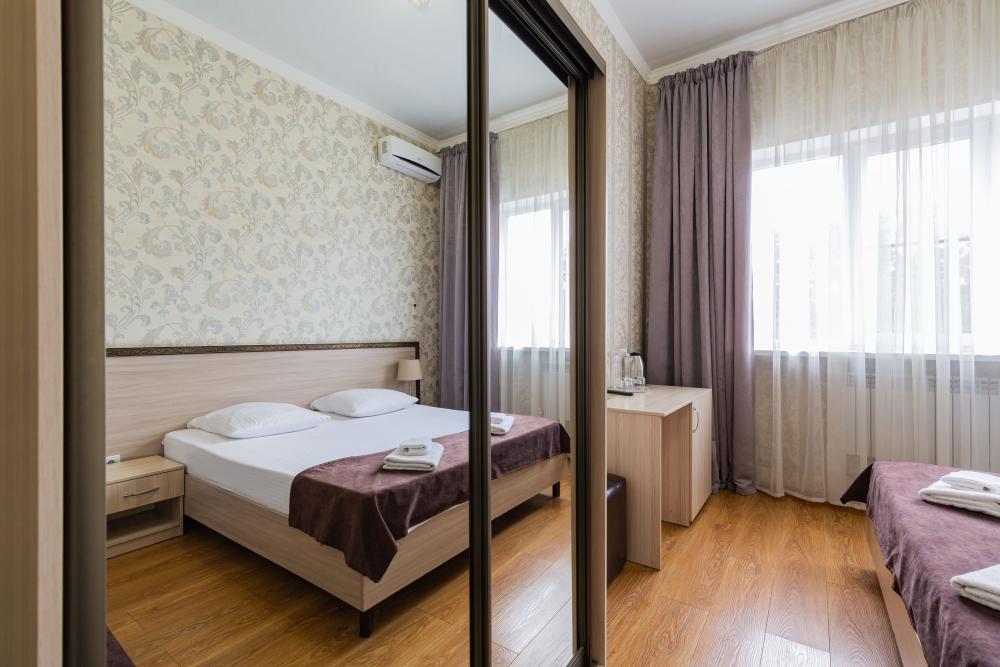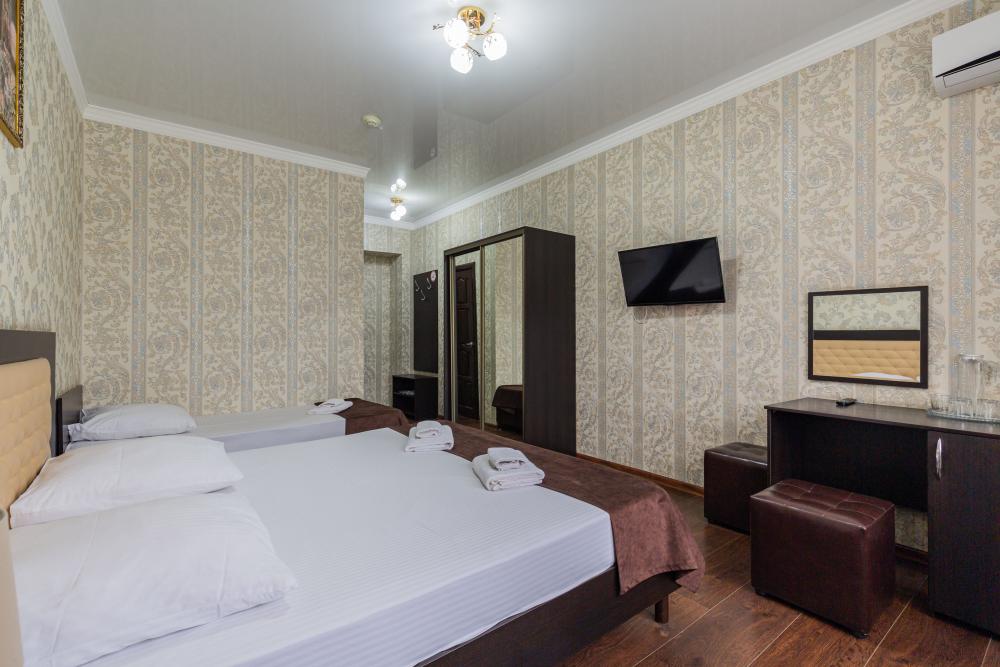 Двухкомнатный номер, категории стандарт. В номере: две двухспальных кровати, шкаф для одежды, тумбочки, кондиционер, телевизор,