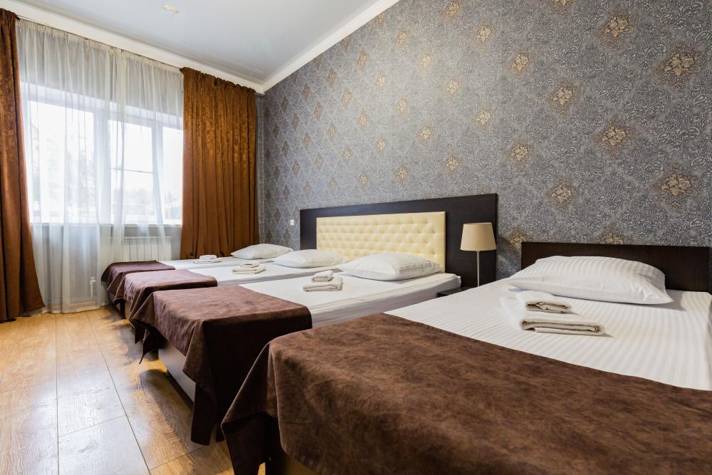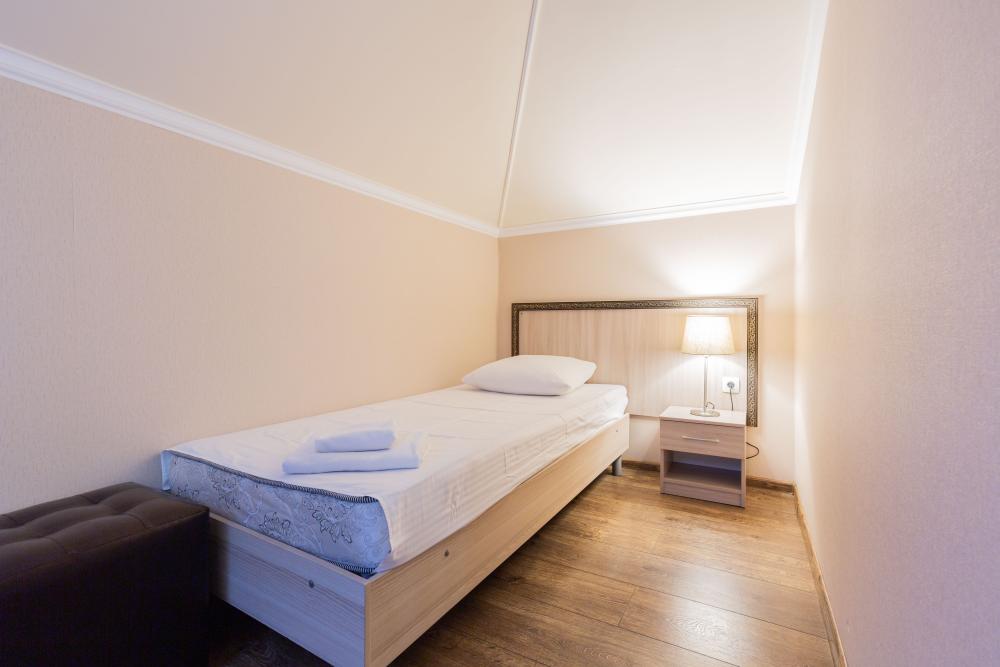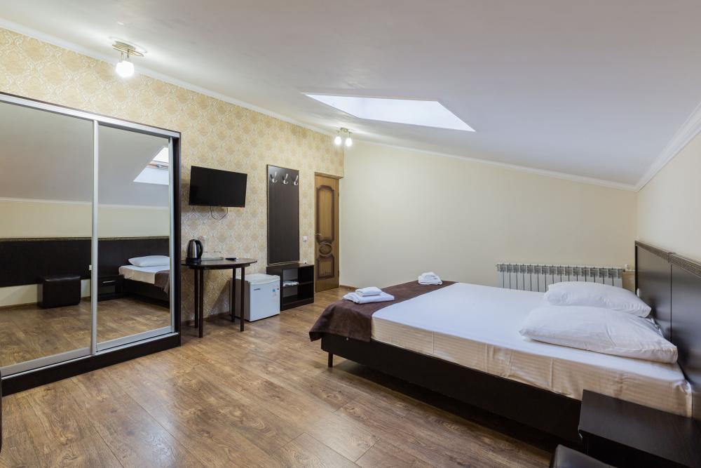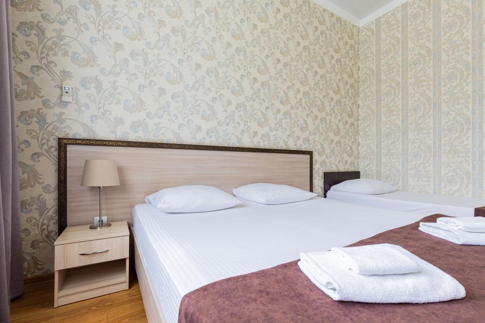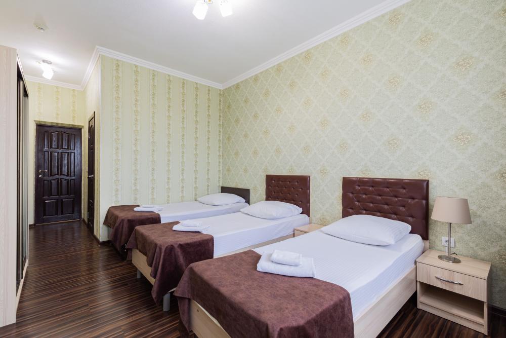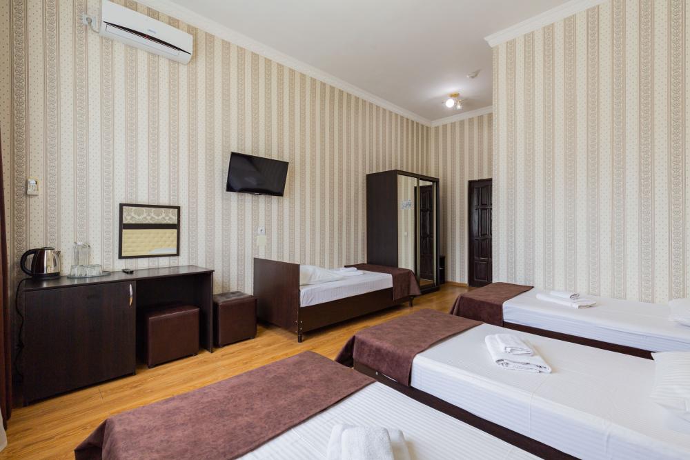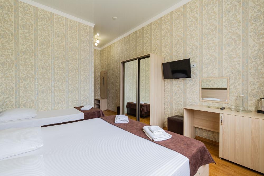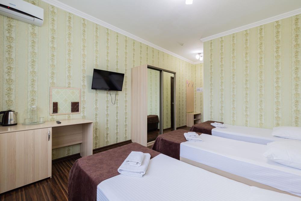 Стандартный номер вместимостью 3 человека. В номере: три односпальные кровати, тумбочки, вешалка для одежды, шкаф, стол, телевизор, холодильник, ванная комната