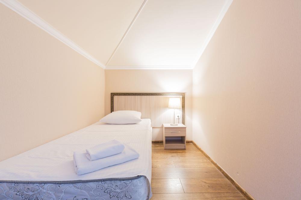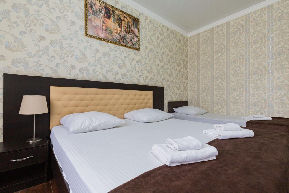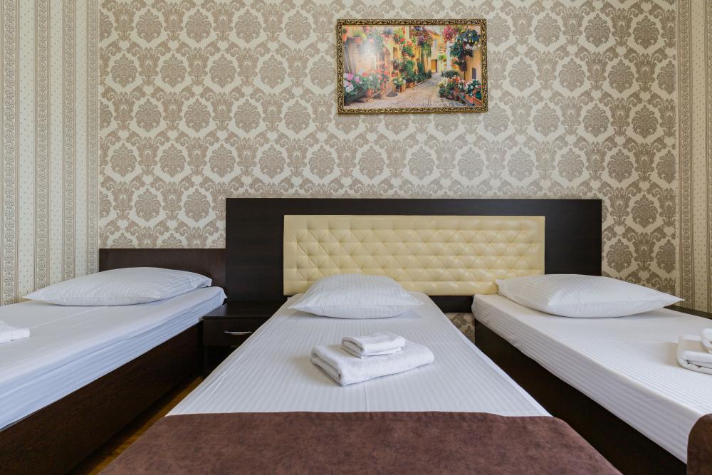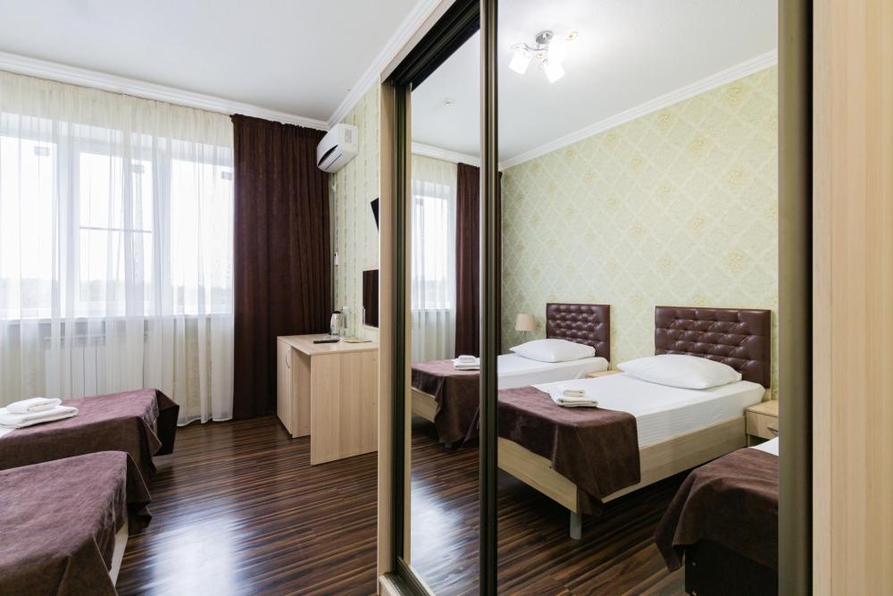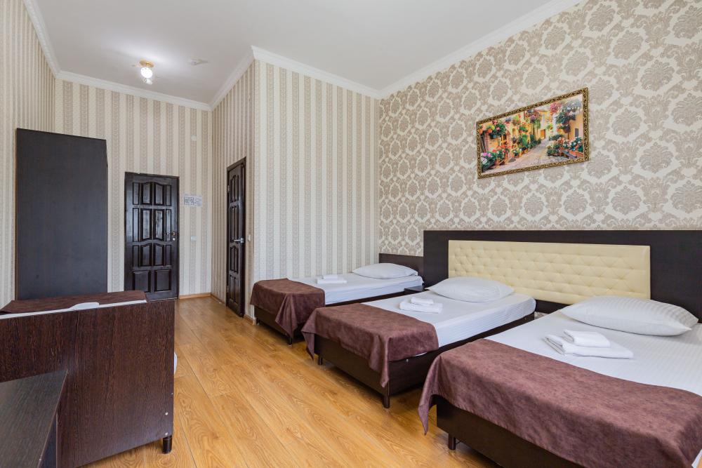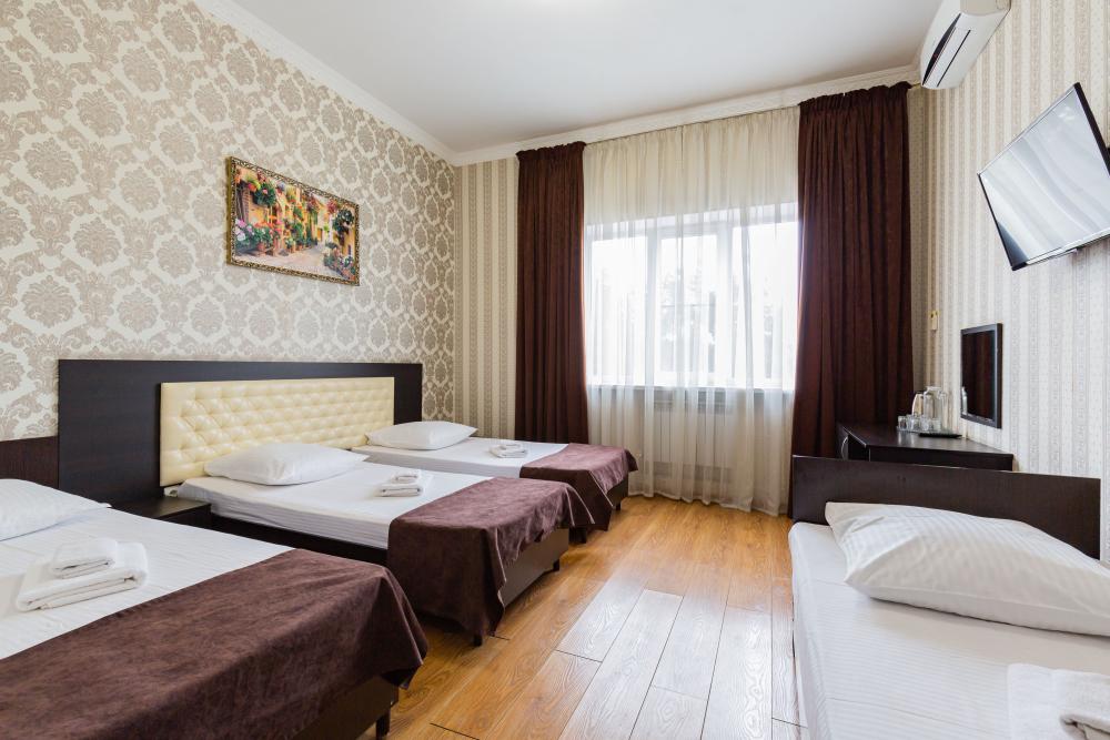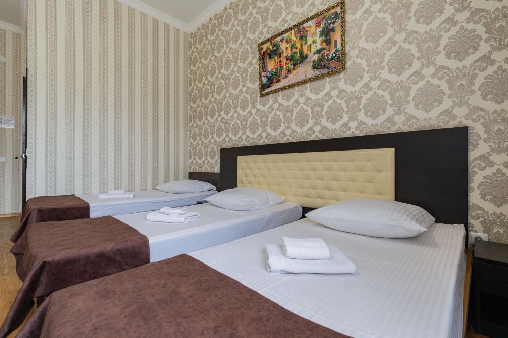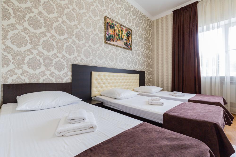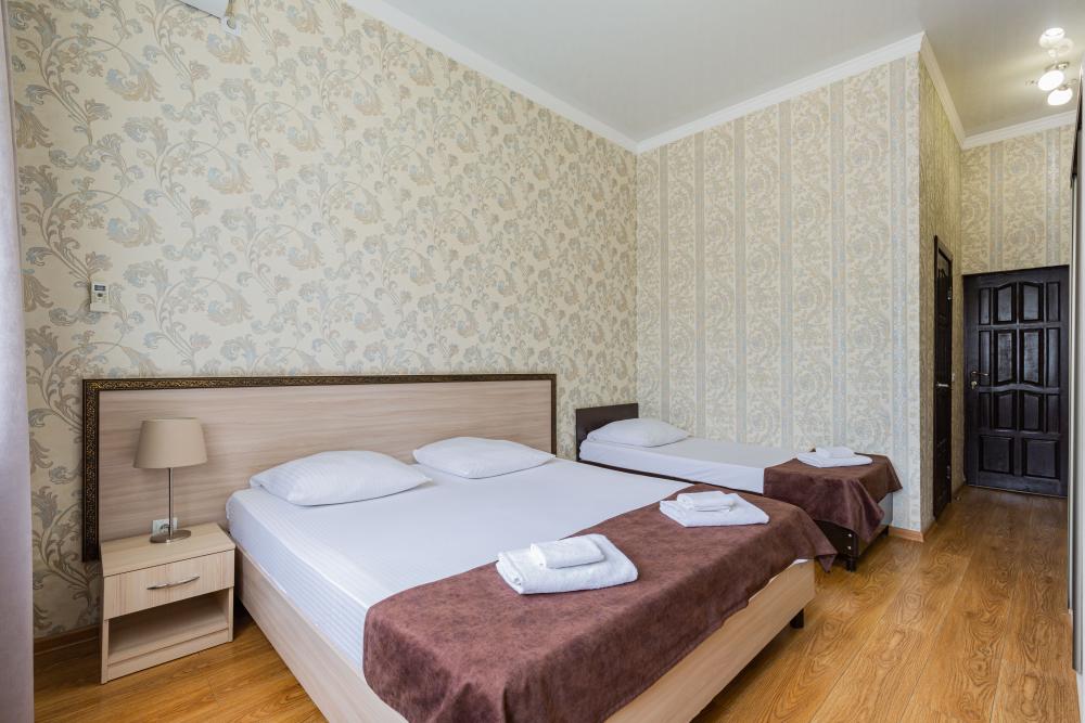 Стандартный номер вместимостью 3 человека. В номере: три односпальные кровати, тумбочки, вешалка для одежды, шкаф, стол, телевизор, холодильник, ванная комната