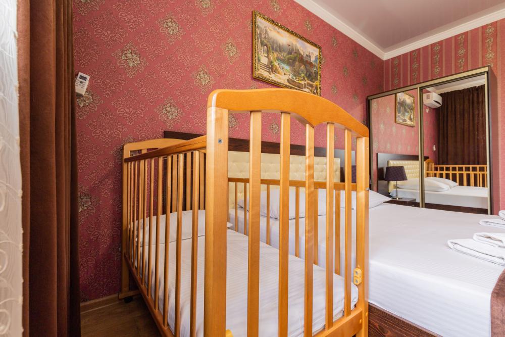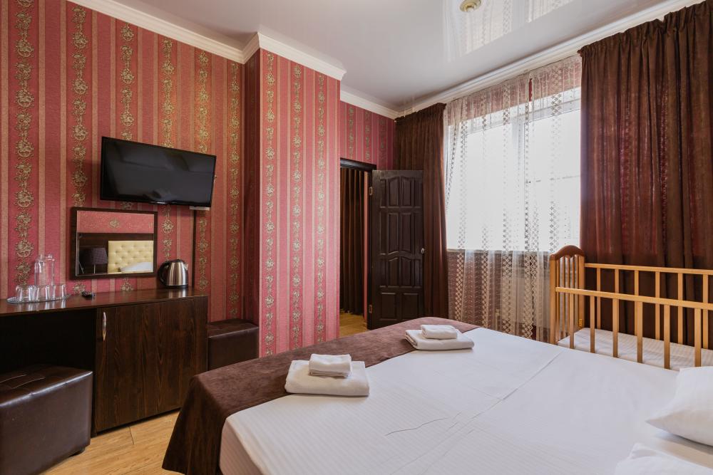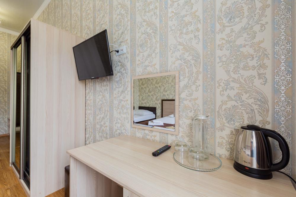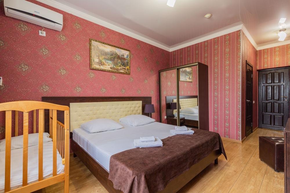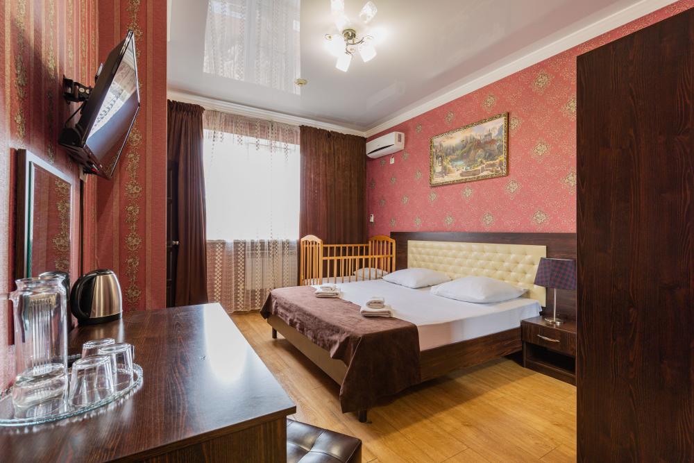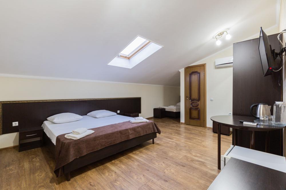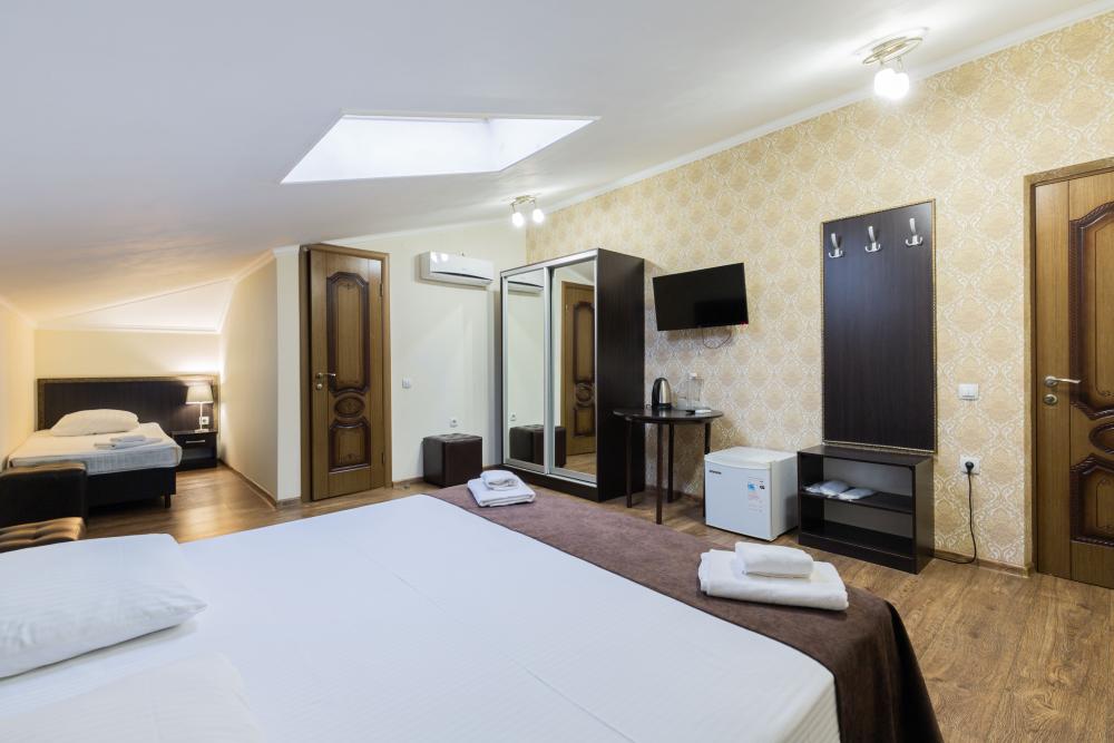 В номере: одна двухспальная и одна полутороспальная кровать, шкаф для одежды, телевизор, кондиционер, тумбочки, стол, душевая.