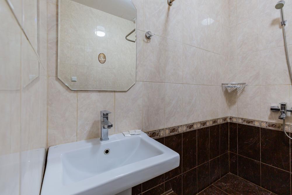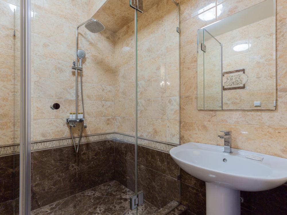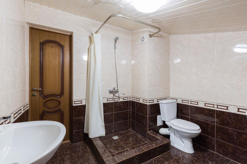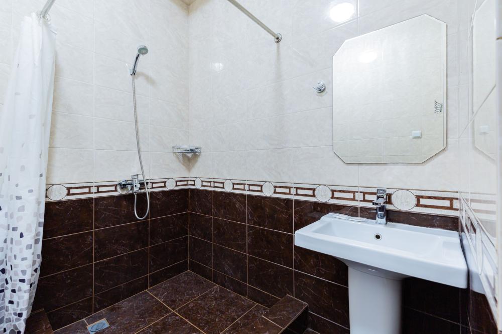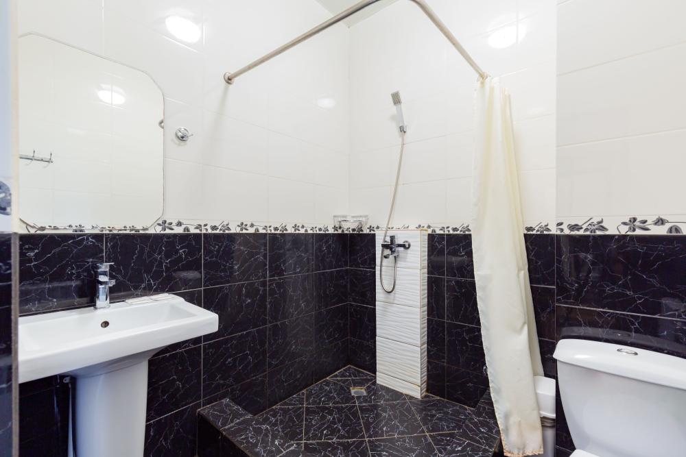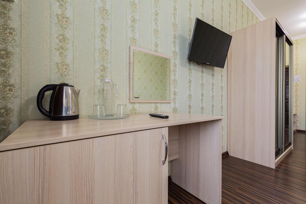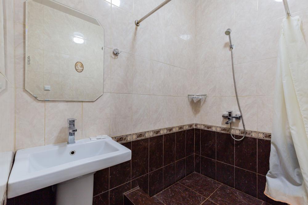 В номере: одна двухспальная и одна полутороспальная кровать, шкаф для одежды, телевизор, кондиционер, тумбочки, стол, душевая.