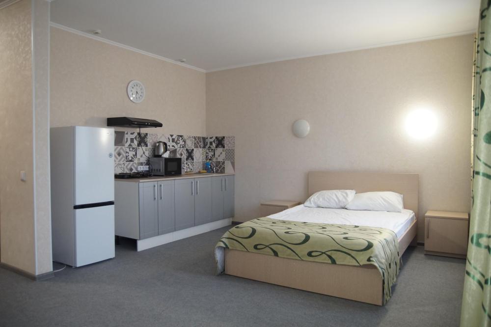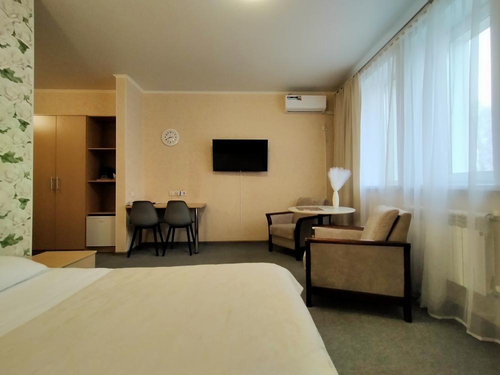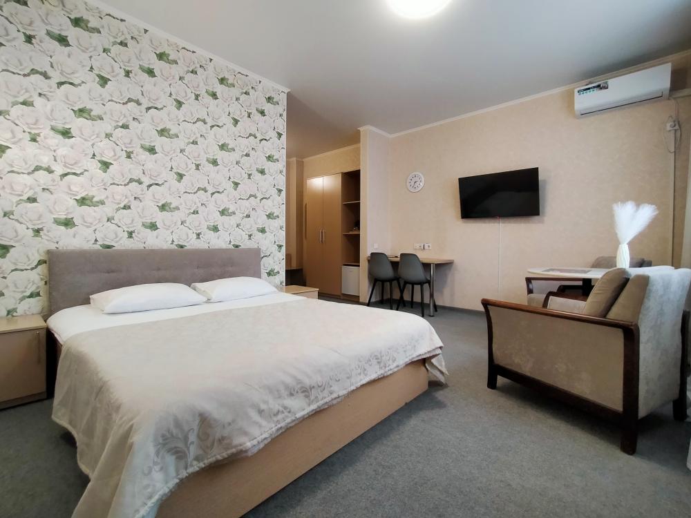 В номере: двуспальная кровать, телевизор, прикроватные тумбы, кресло, кухонная зона.