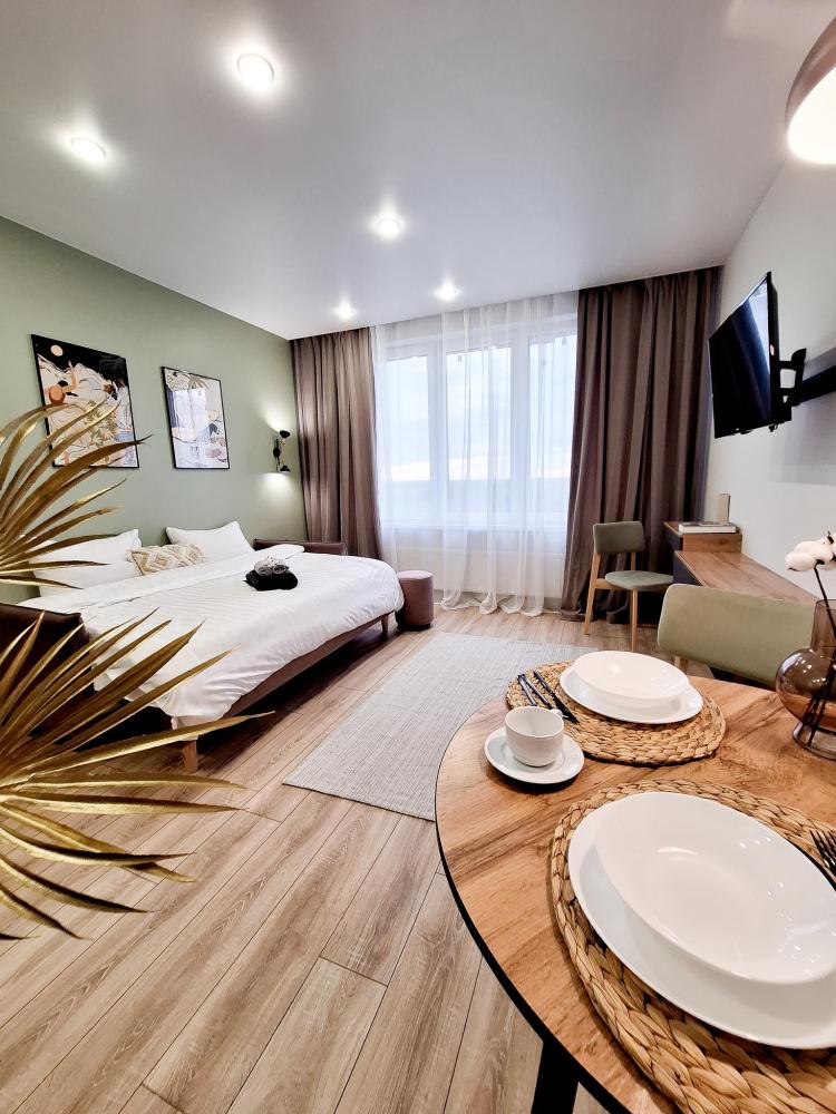 Уютные апартаменты для 2 гостей, оборудованные всем необходимым для комфортного проживания. В апартаментах есть Wi-Fi, телевидение и кондиционер, электроплита, холодильник, чайник, набор посуды и столовые приборы, стиральная машина, фен, утюг, гладильная доска и сушилка для белья, двуспальная кровать с ортопедическим матрасом, а также чистое постельное бельё, свежие пушистые полотенца и необходимые предметы гигиены.
