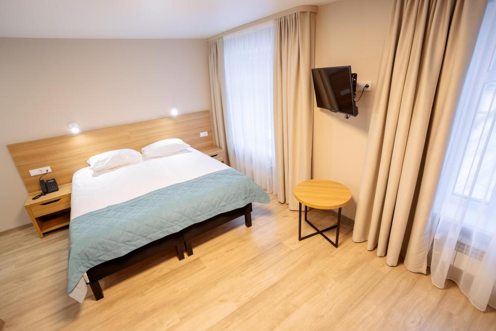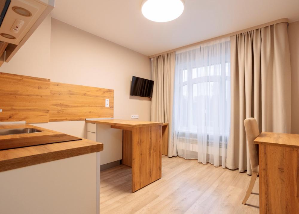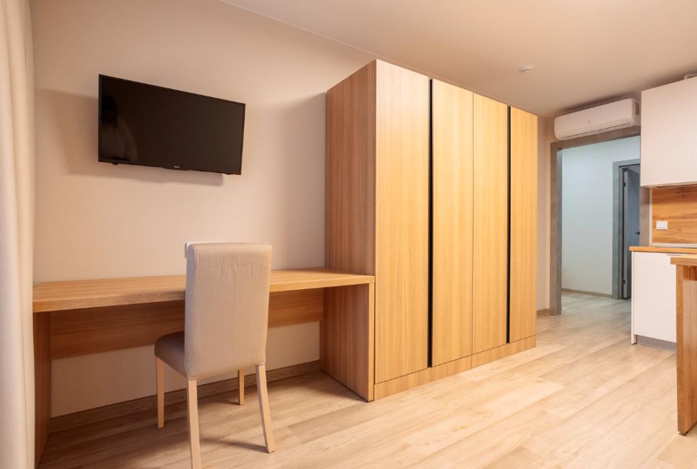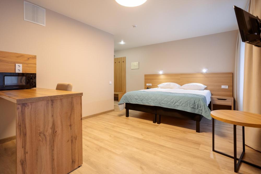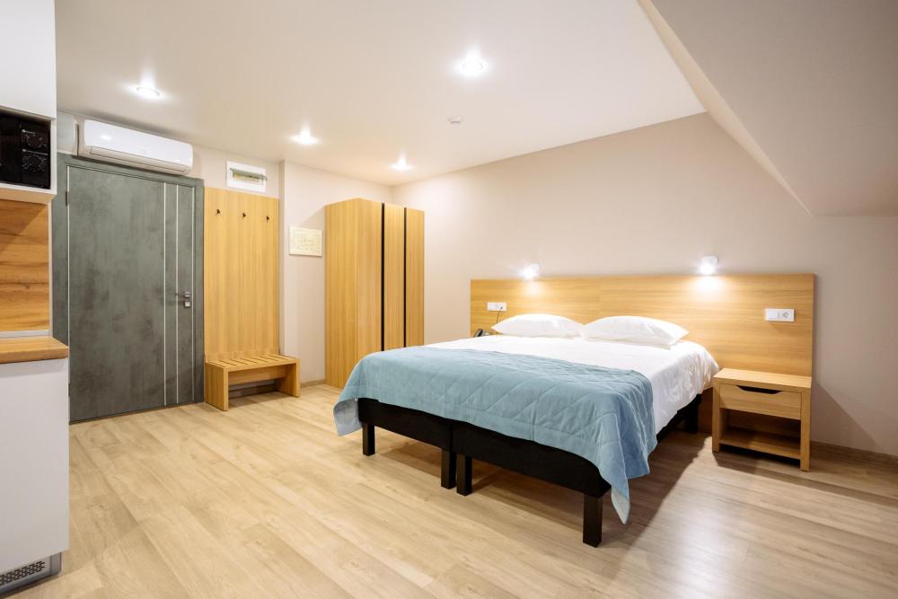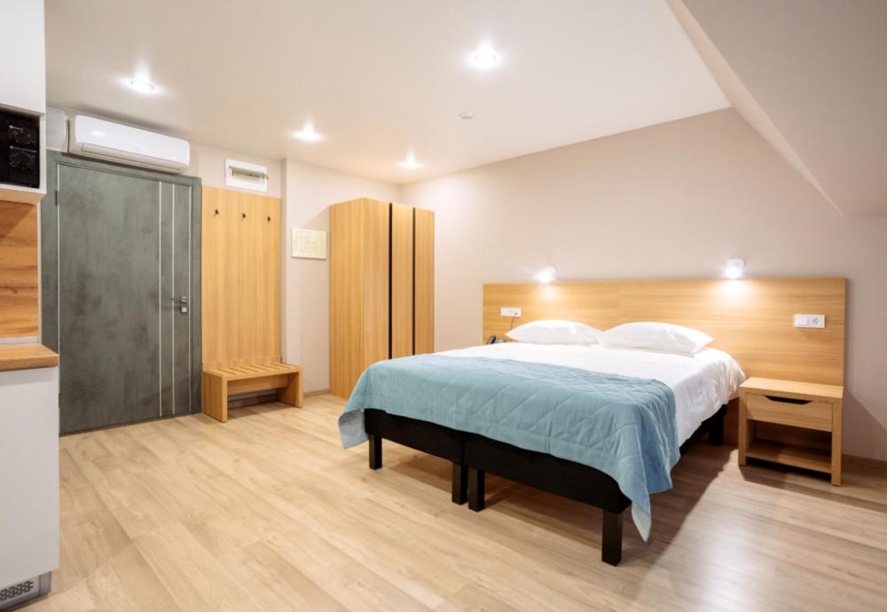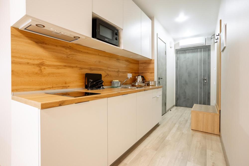Двуспальная большая кровать или 2 односпальные кровати, тв, wifi, кухонная зона с техникой (варочная панель, микроволновая печь) и посудой; душевая кабина, фен, комплект полотенец, косметические принадлежности, стиральная машина.