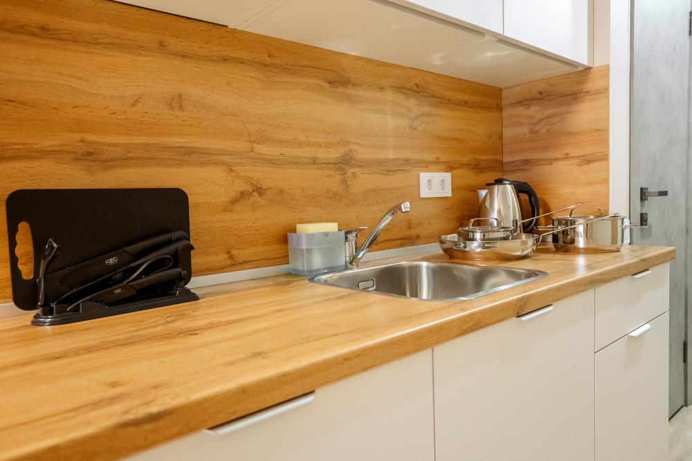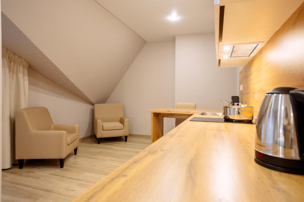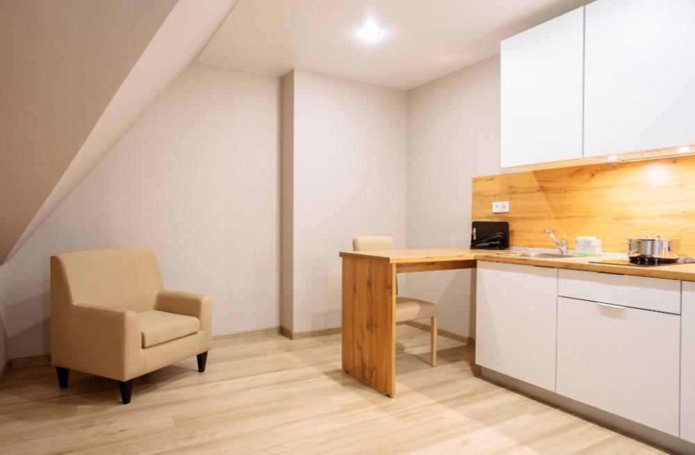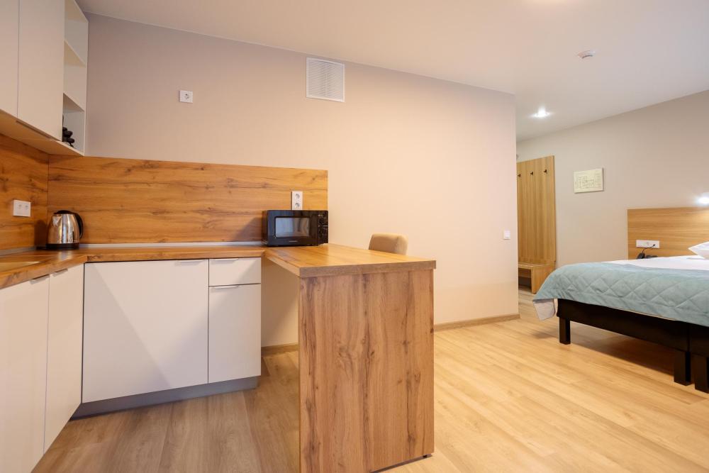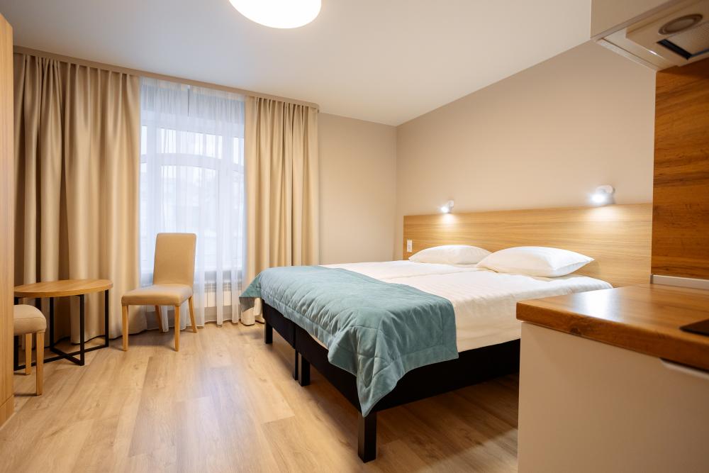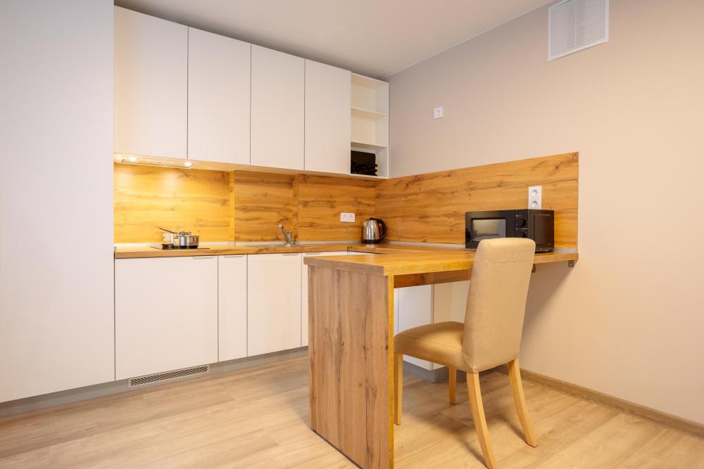 Двуспальная большая кровать или 2 односпальные кровати, тв, wifi, кухонная зона с техникой (варочная панель, микроволновая печь) и посудой; душевая кабина, фен, комплект полотенец, косметические принадлежности, стиральная машина.
