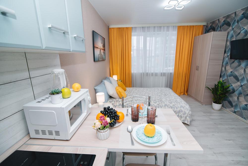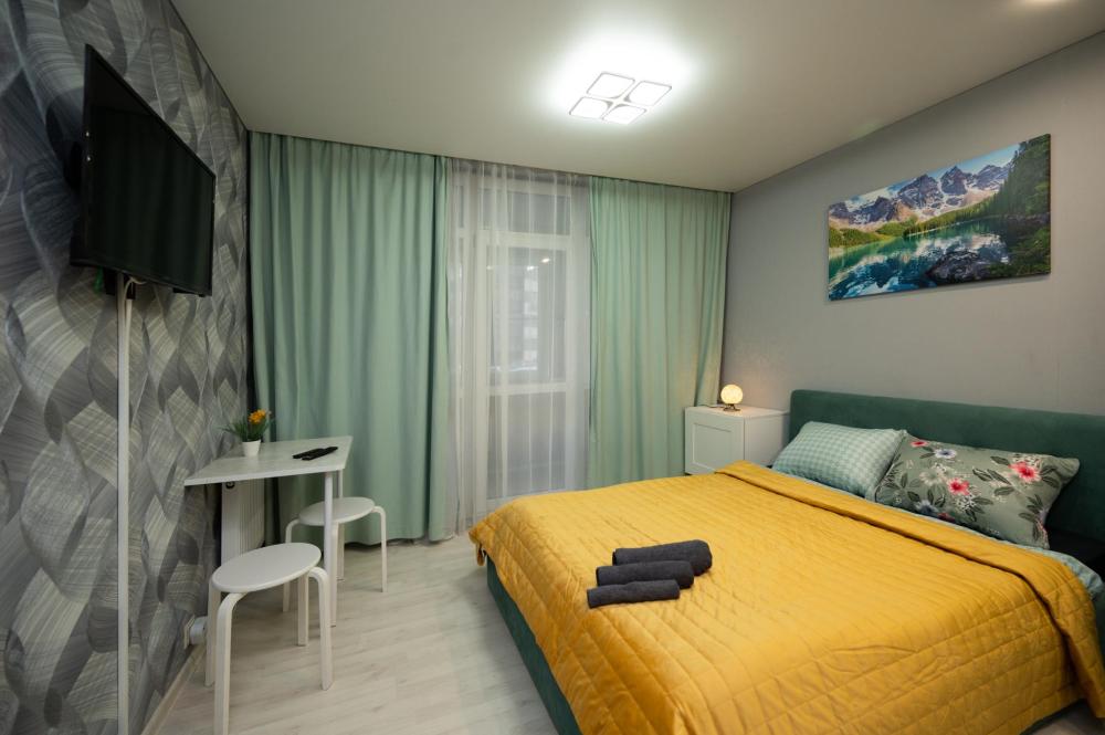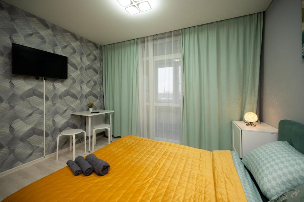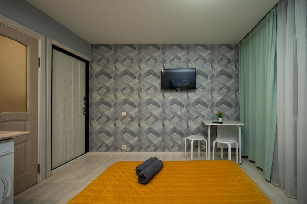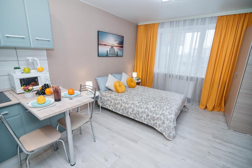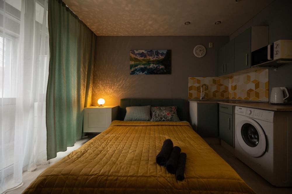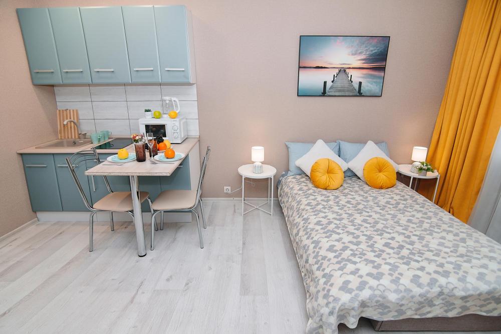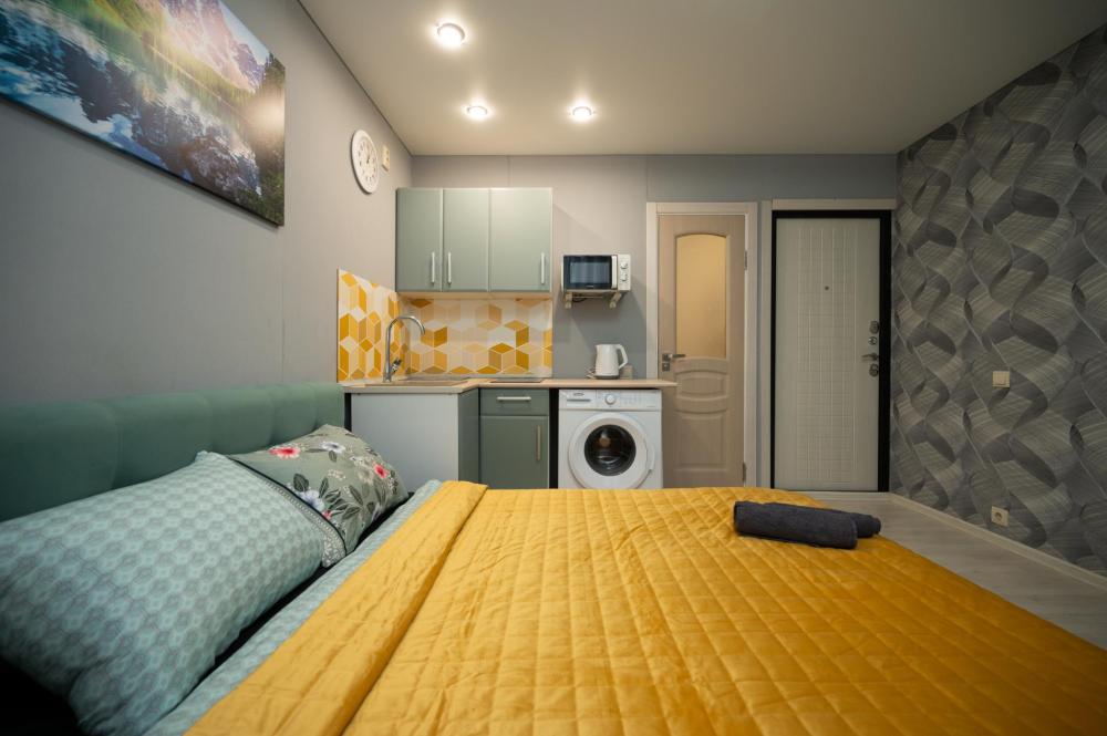 Уютные апартаменты студия, оборудованные всем необходимым для комфортного проживания. В апартаментах: удобная двуспальная кровать, кабельное телевидение, Wi-Fi. Бытовая техника: холодильник, духовка, микроволновка, стиральная машинка, утюг, гладильная доска, фен, чайник, пылесос. Полный комплект посуды для готовки и приёма пищи.