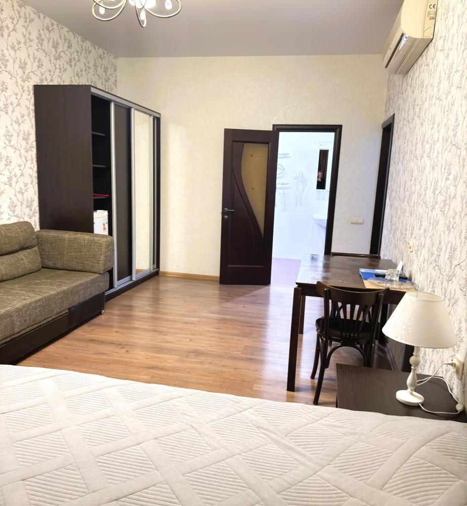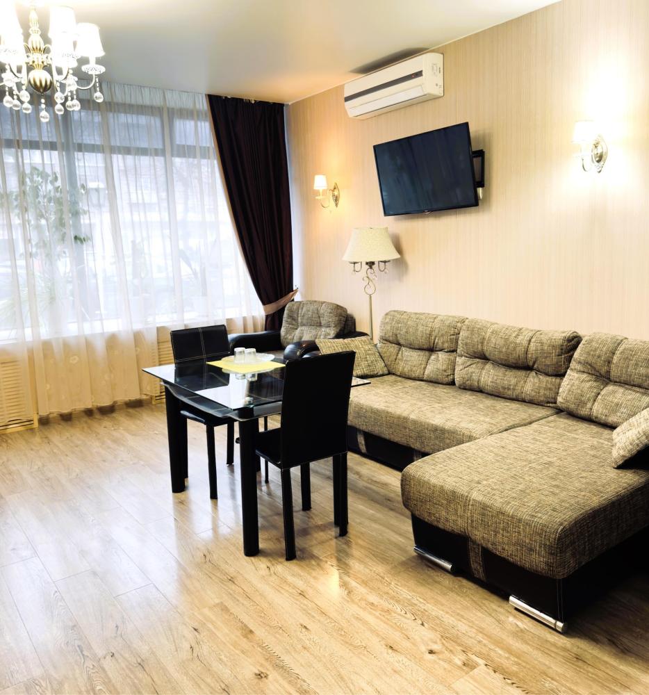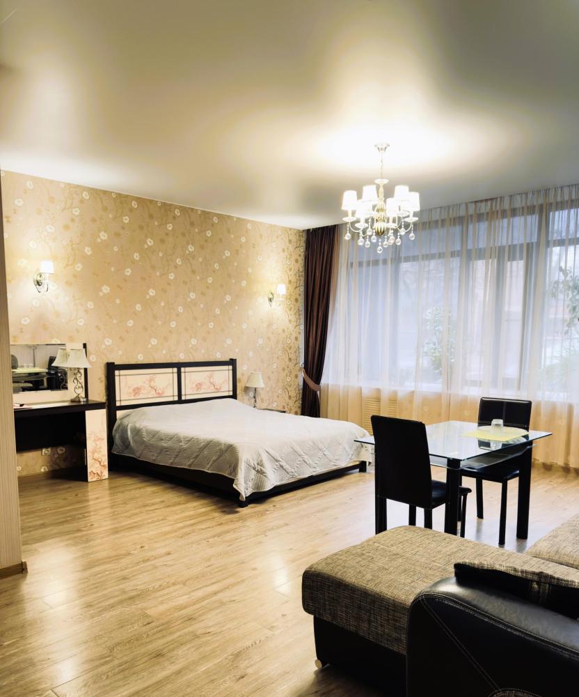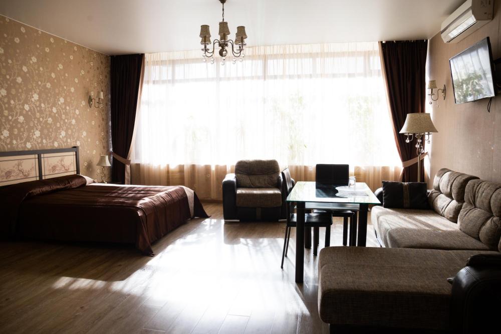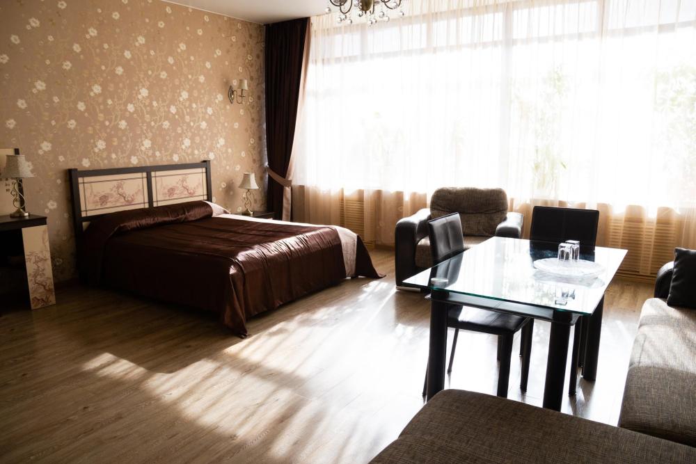 В номере: двуспальная кровать, прикроватные тумбочки, диван, кресло, холодильник, стол, стулья, шкаф, телевизор, кондиционер, туалетный столик. В ванной: душевая кабина, туалет, раковина.